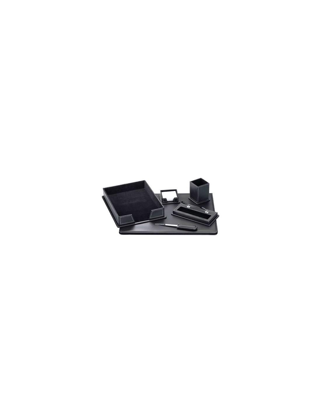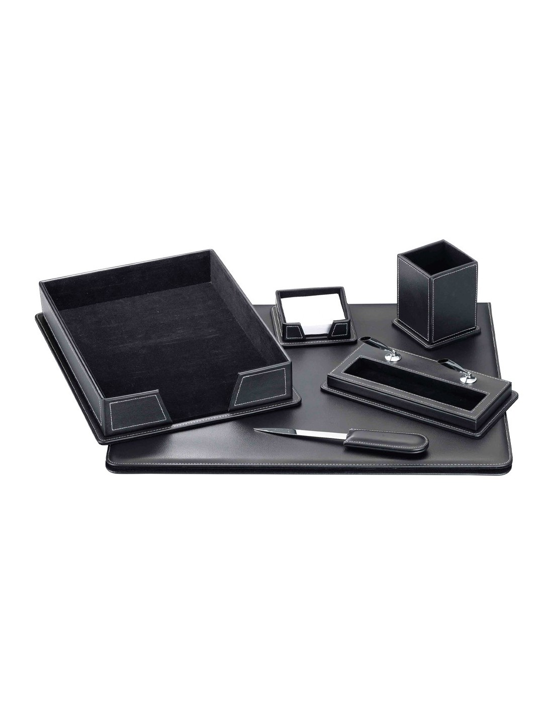 Juego de escribanía y accesorios para sobremesa. Fabricado en símil piel. Contiene 6 piezas: vade doble plegado al centro, abrecartas, soporte para taco de papel, cubilete portalápices, portabolígrafos y bandeja portadocumentos. Color negro. Medidas: 500 x 400 x 10 mm.