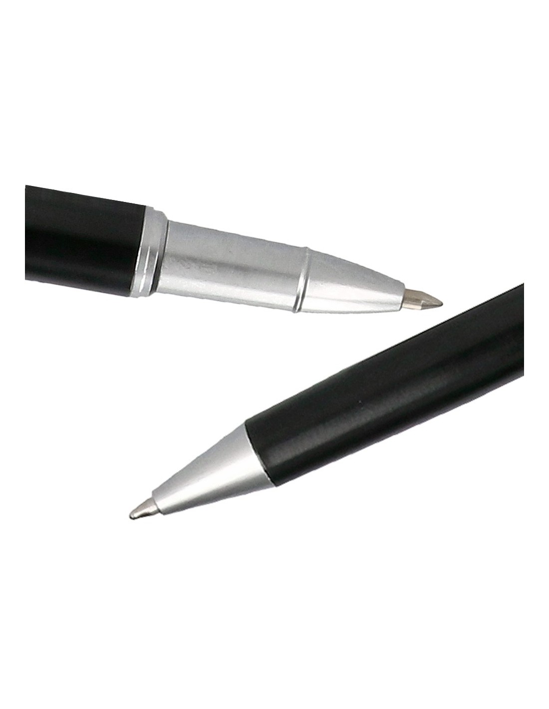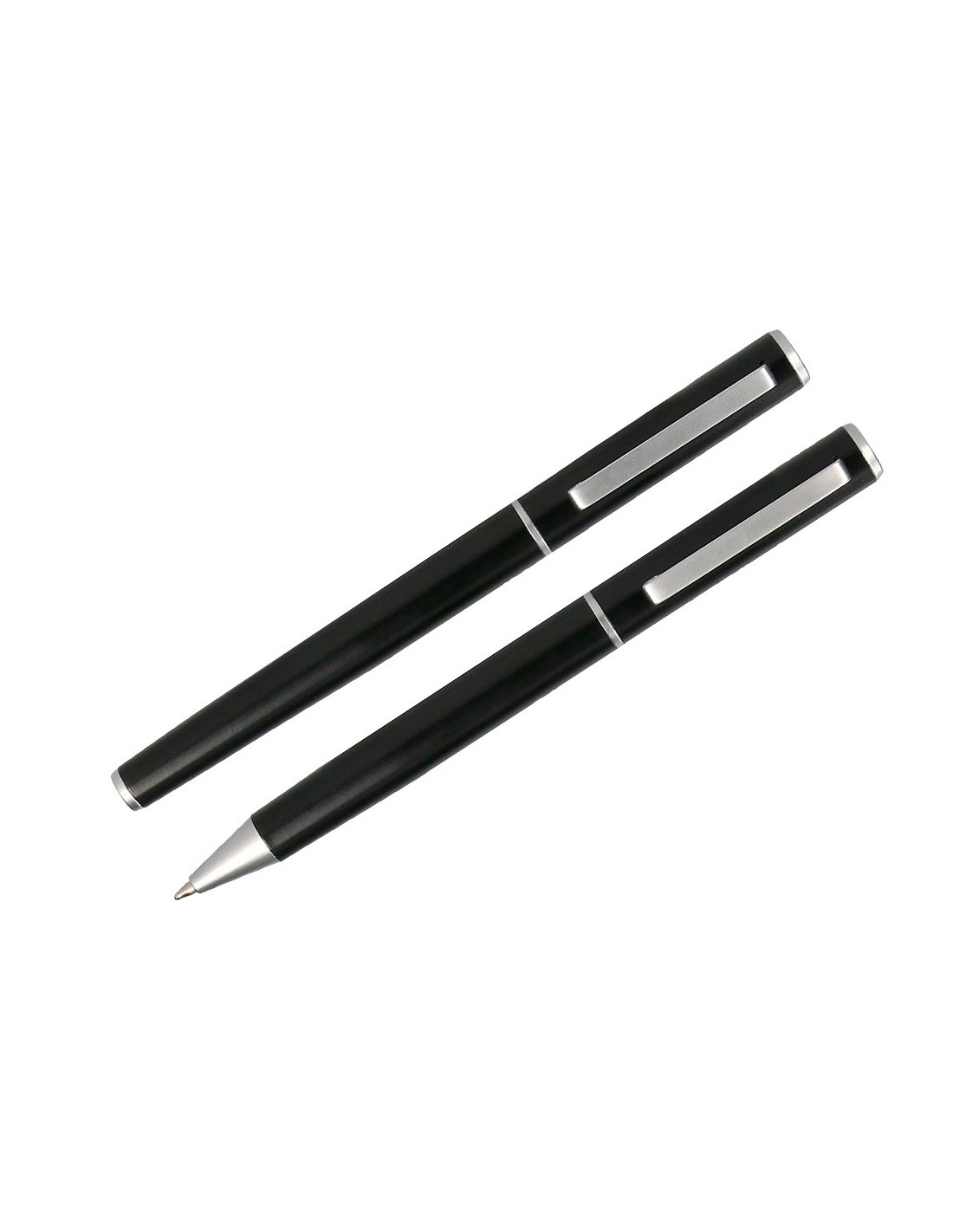 Elegante juego de bolígrafo y roller. Cuerpo negro mate y detalles cromados satinados. Presentado en caja regalo. Ideal para tener un detalle.