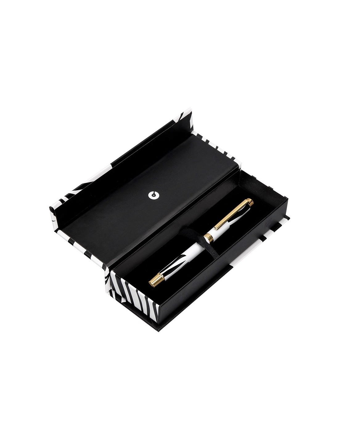 El roller Dualità combina un diseño moderno y atrevido, con un cuerpo en blanco decorado con trazos estilo cebra en negro y detalles metálicos dorados. Viene presentado en una moderna caja de cierre magnético que juega con la inversión de colores, incorporando una solapa interior en contraste. El diseño en blanco y negro invertidos representa el contraste y la dualidad presentes en la juventud, capturando su energía. La colección se caracteriza por su diseño elegante, contemporáneo con un estilo único. Cada detalle ha sido cuidadosamente elegido para crear un impacto visual fuerte y llamativo. Tinta color negro. Grosor tamaño 0,7 mm.
