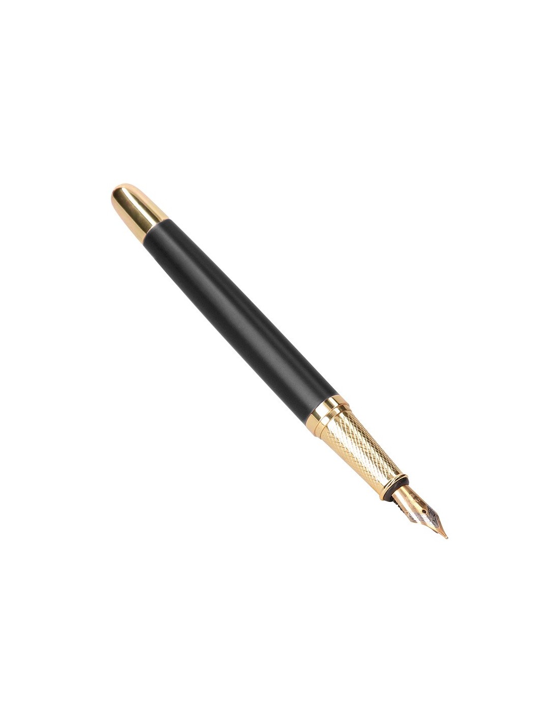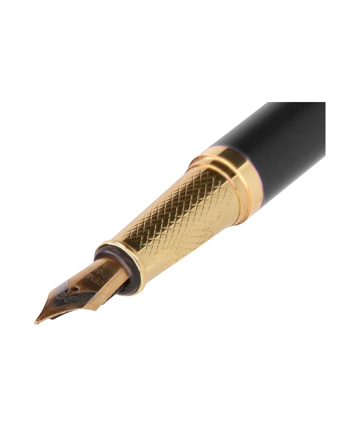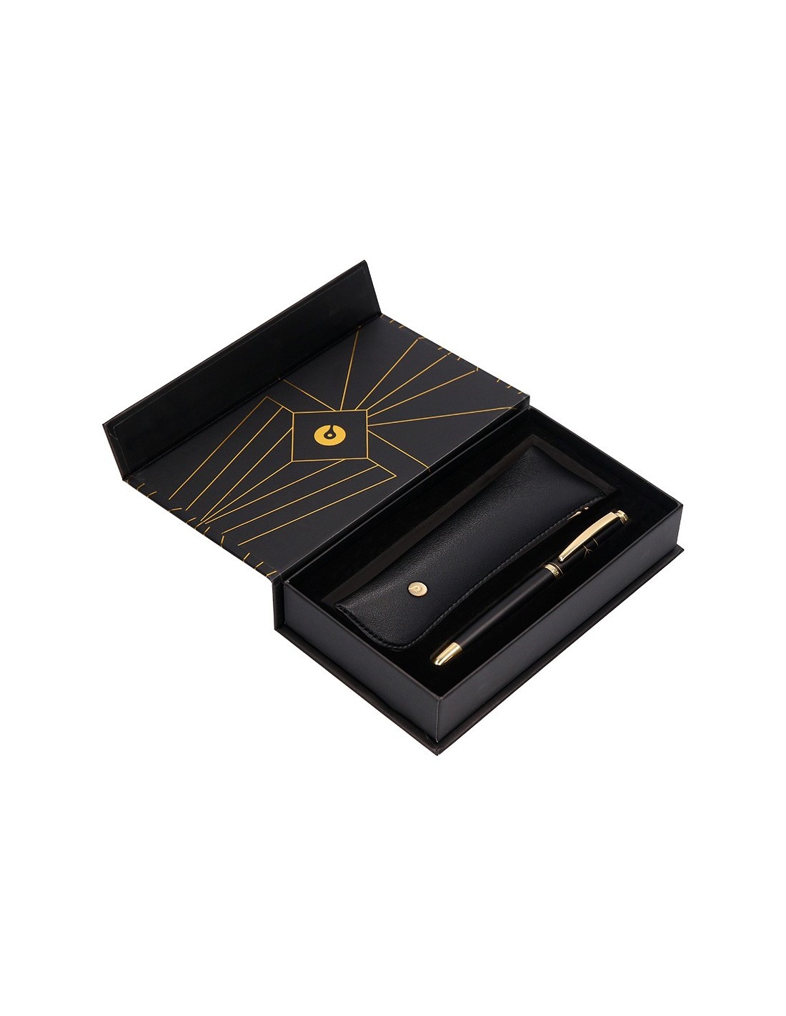La pluma Soirée es una pieza en color negro con elegantes detalles en dorado, acompañada de un estuche de símilpiel del mismo color, adornado con un refinado detalle metálico dorado. Todo esto está contenido en una elegante caja de cierre magnético, decorada con un diseño Art Deco en dorado. Tanto el diseño de la pieza como el de la caja, hacen un guiño a los años 20 evocando la elegancia clásica del refinado estilo del Art Deco. La colección Soirée te invita a una velada especial, a través de cada pieza, meticulosamente diseñadas para capturar el encanto y el glamour de la época, combinando elementos modernos con un toque clásico y especial. Tinta color azul. Grosor tamaño M.
