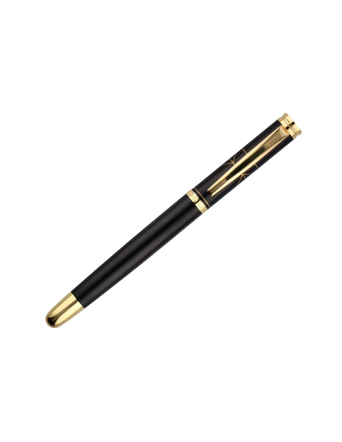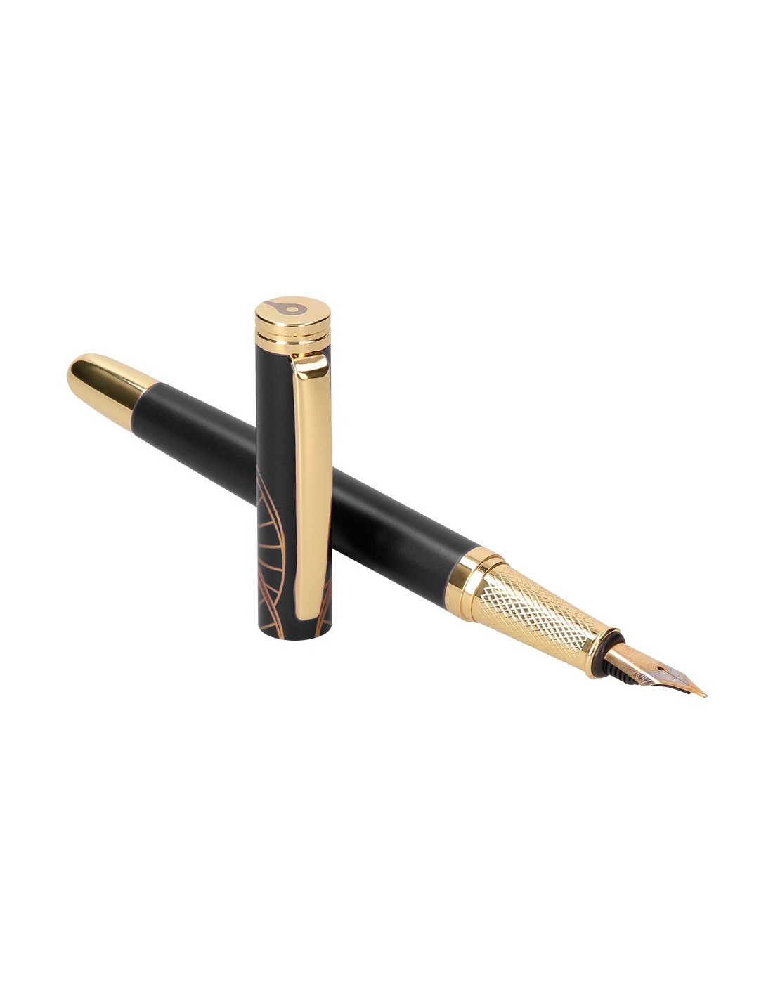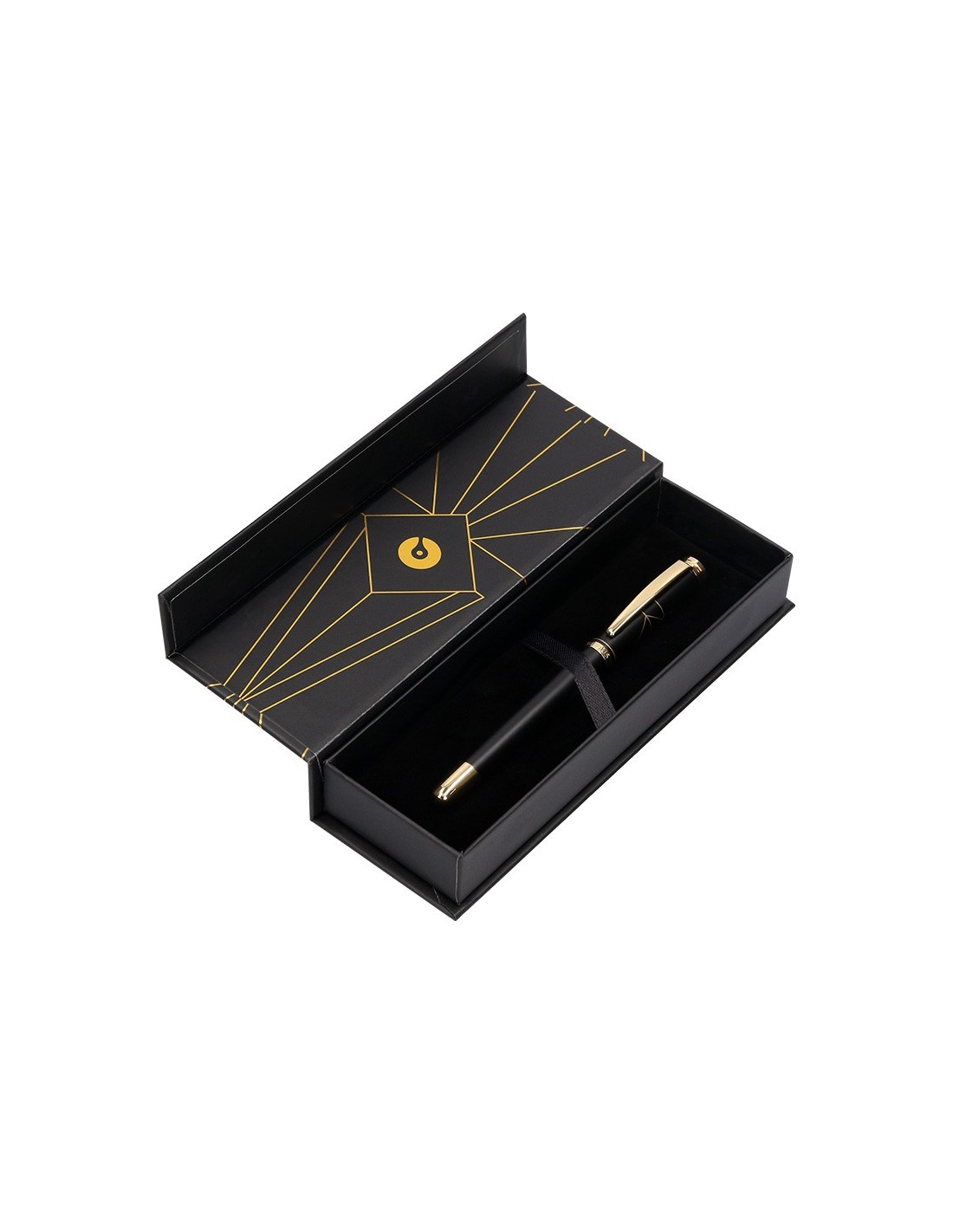 La pluma Soirée es una pieza en color negro con elegantes detalles en dorado. Presentado en una elegante caja de cierre magnético, decorada con un diseño Art Deco en dorado. Tanto el diseño de la pieza como el de la caja, hacen un guiño a los años 20 evocando la elegancia clásica del refinado estilo del Art Deco. La colección Soirée te invita a una velada especial, a través de cada pieza, meticulosamente diseñadas para capturar el encanto y el glamour de la época, combinando elementos modernos con un toque clásico y especial. Tinta color azul. Grosor tamaño M.