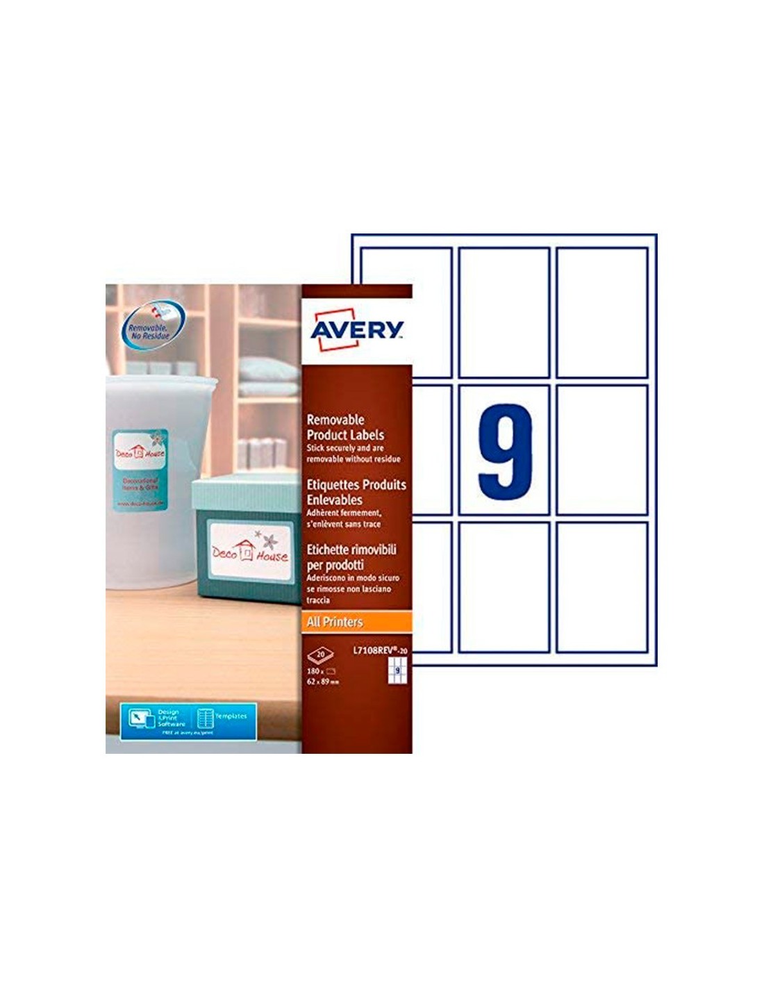 Etiquetas adhesivas blancas removibles. Percfeta para un etiquetado temporal. El adhesivo no deja residuo de pegamento sobre la superficie. Ideales sobre productos y precios. Compatibles con impresoras ink-jet, láser y fotocopiadoras. Hechas de material proveniente de bosque certificado FSC. Caja de 20 hojas. Se puede utilizar el software crea e imprime gratuito de Avery para realizar el diseño de las etiquetas con pocos clics.
