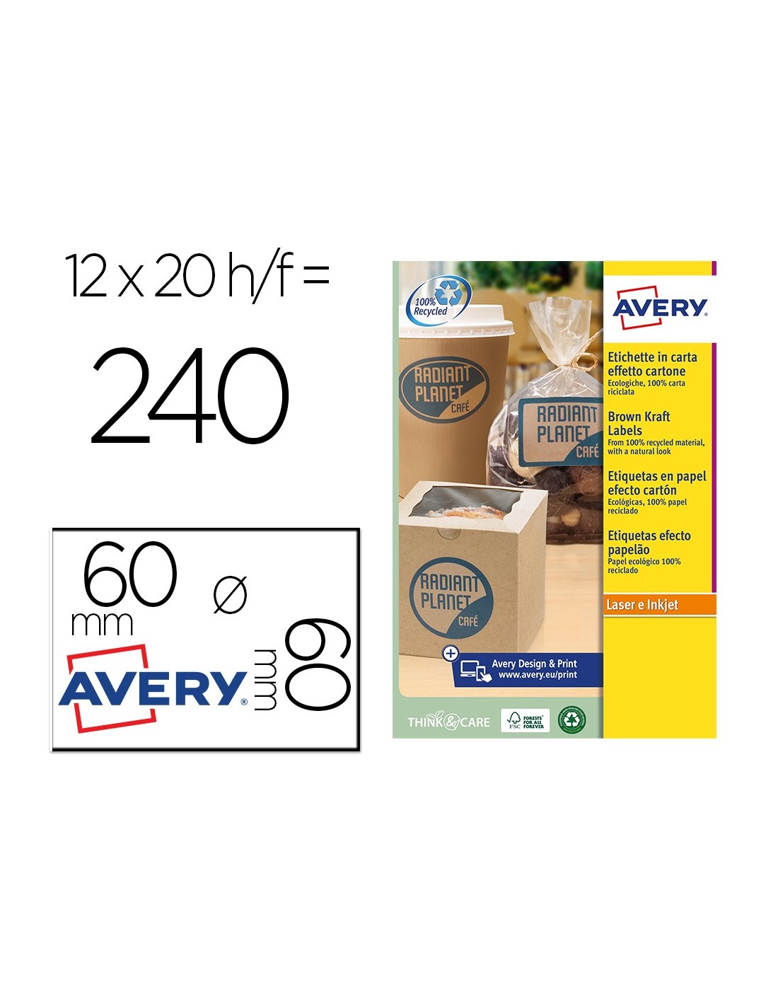 Etiquetas adhesivas de papel kraft recicladas. Adhesivo permanente, perfecta sobre superficies lisas incluso, madera, vidrio, metal y cartón. Compatibles con impresoras ink-jet, láser y fotocopiadoras. Hechas de material proveniente de bosque certificado FSC. Caja de 20 hojas. Se puede utilizar el software crea e imprime gratuito de Avery para realizar el diseño de las etiquetas con pocos clics.