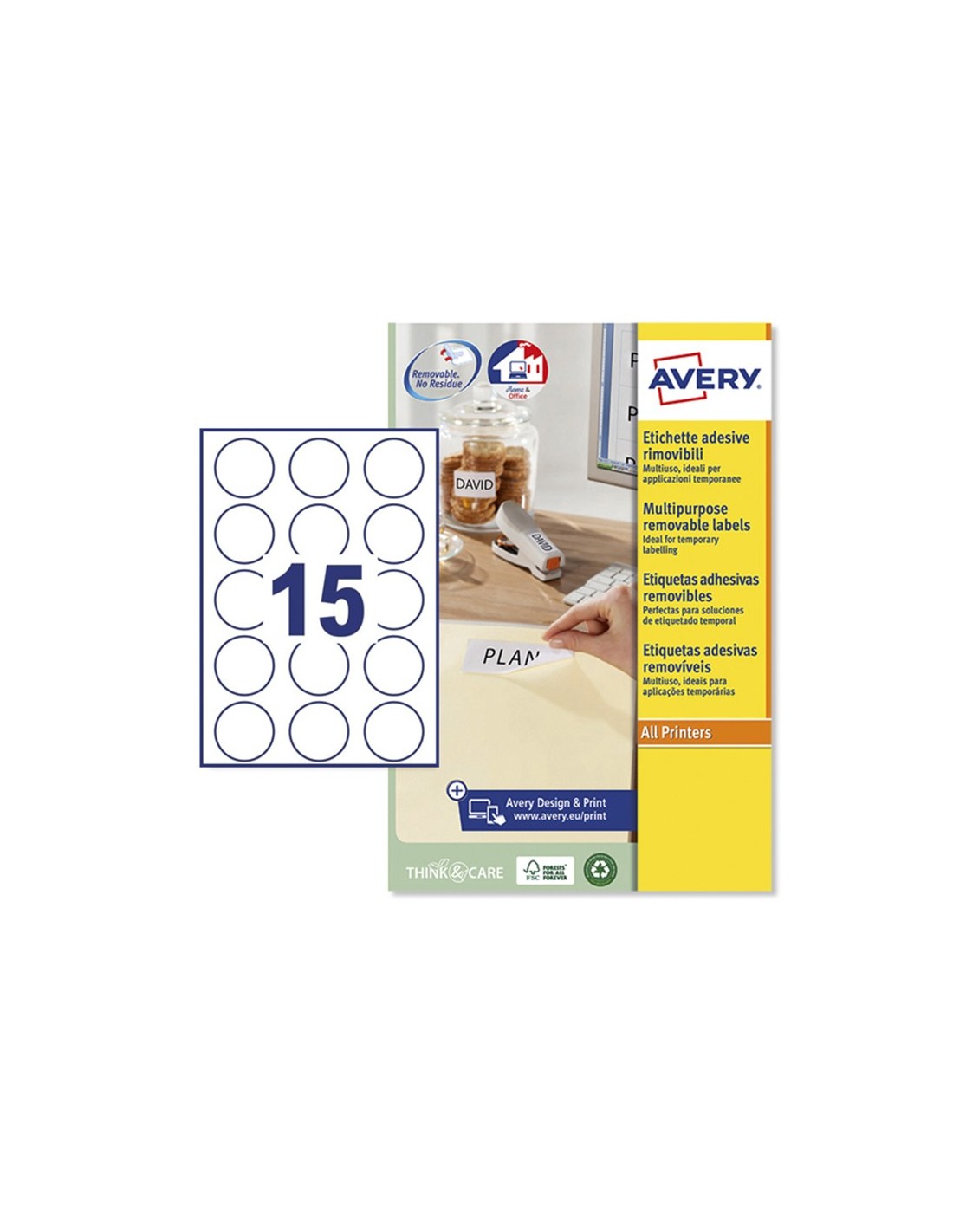 Etiquetas adhesivas blancas removibles. Perfecta para un etiquetado temporal. Ideales para etiquetar productos y sobre El adhesivo no deja residuo de pegamento sobre la superficie. Ideales sobre productos y precios. Compatibles con impresoras ink-jet, láser y fotocopiadoras. Hechas de material proveniente de bosque certificado FSC. Caja de 25 hojas. Se puede utilizarel software crea e imprime gratuito de Avery para realizar el diseño de l as etiquetas con pocos clics.