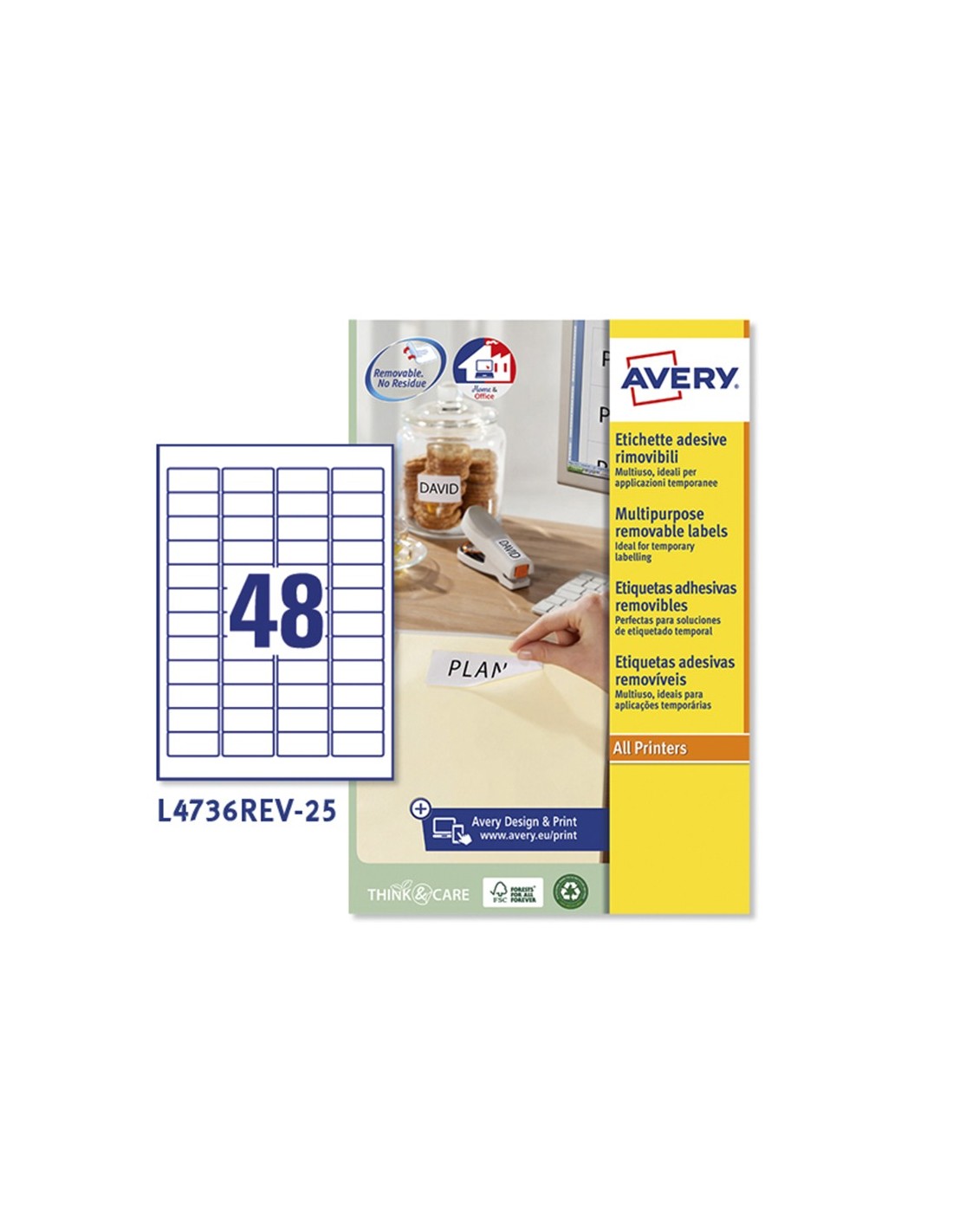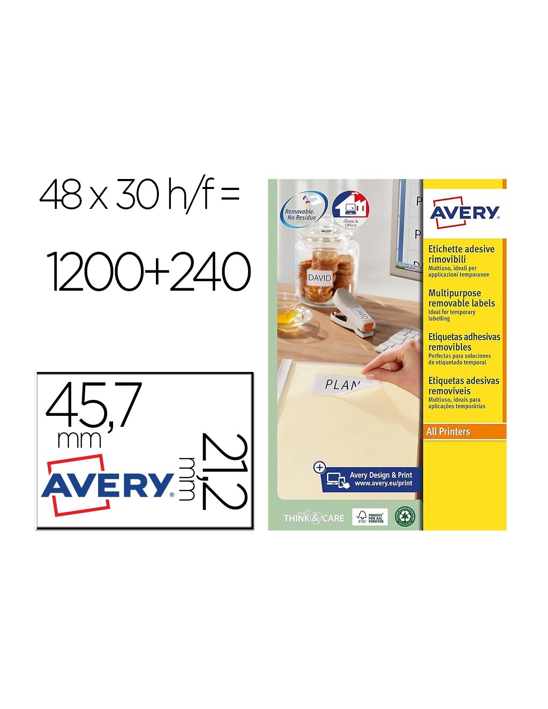 Etiqueta adhesivas Avery en papel blanco, adhesivo removible. Gracias al adhesivo removible, cuando se quitan, no dejan residuos de pegamento en lassuperficies. Ideales para soluciones de etiquetado temporaneo y para cerr ar los paquetes de comida para llevar. Ecológicas, realizadas con papel certificado FSC procedente de bosques gestionados de forma responsable. Se puede utilizar el software crea e imprime gratuito de Avery para realizar el diseño de las etiquetas con pocos clics. Para impresoras láser, inkjet yfotocopiadoras. Medidas: 45,7x21,2 mm. Caja de 25 hojas A4. 1200 etiqueta