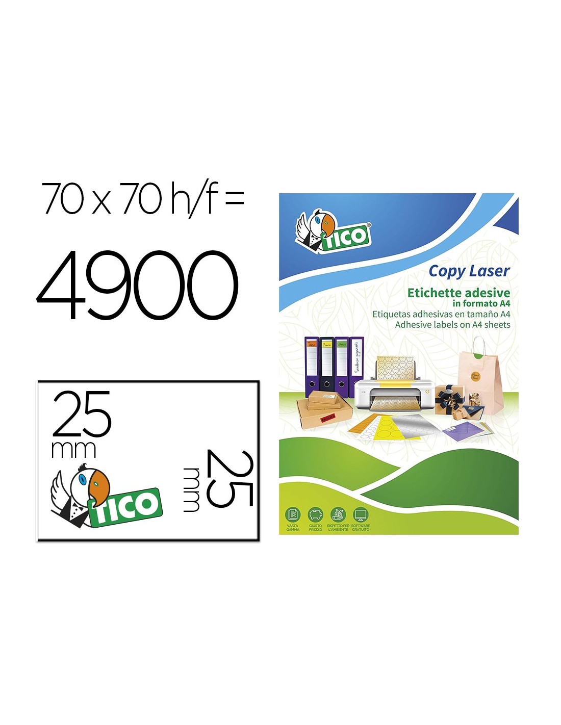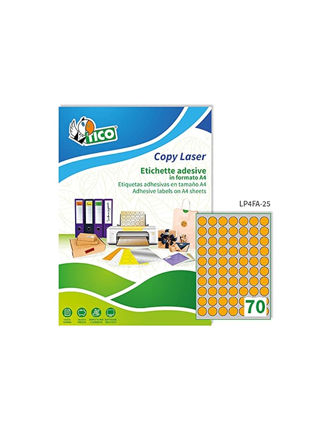 Etiqueta adhesiva de papel fluorescente naranja, ideal para señalización. 4900 Tico. Medidas: 25mm. Utiliza el software crea e imprime gratuito de Tico para realizar el diseño de las etiquetas con pocos clics. Caja de 70 hojas Din A4 fabricada con papel certificado FSC.