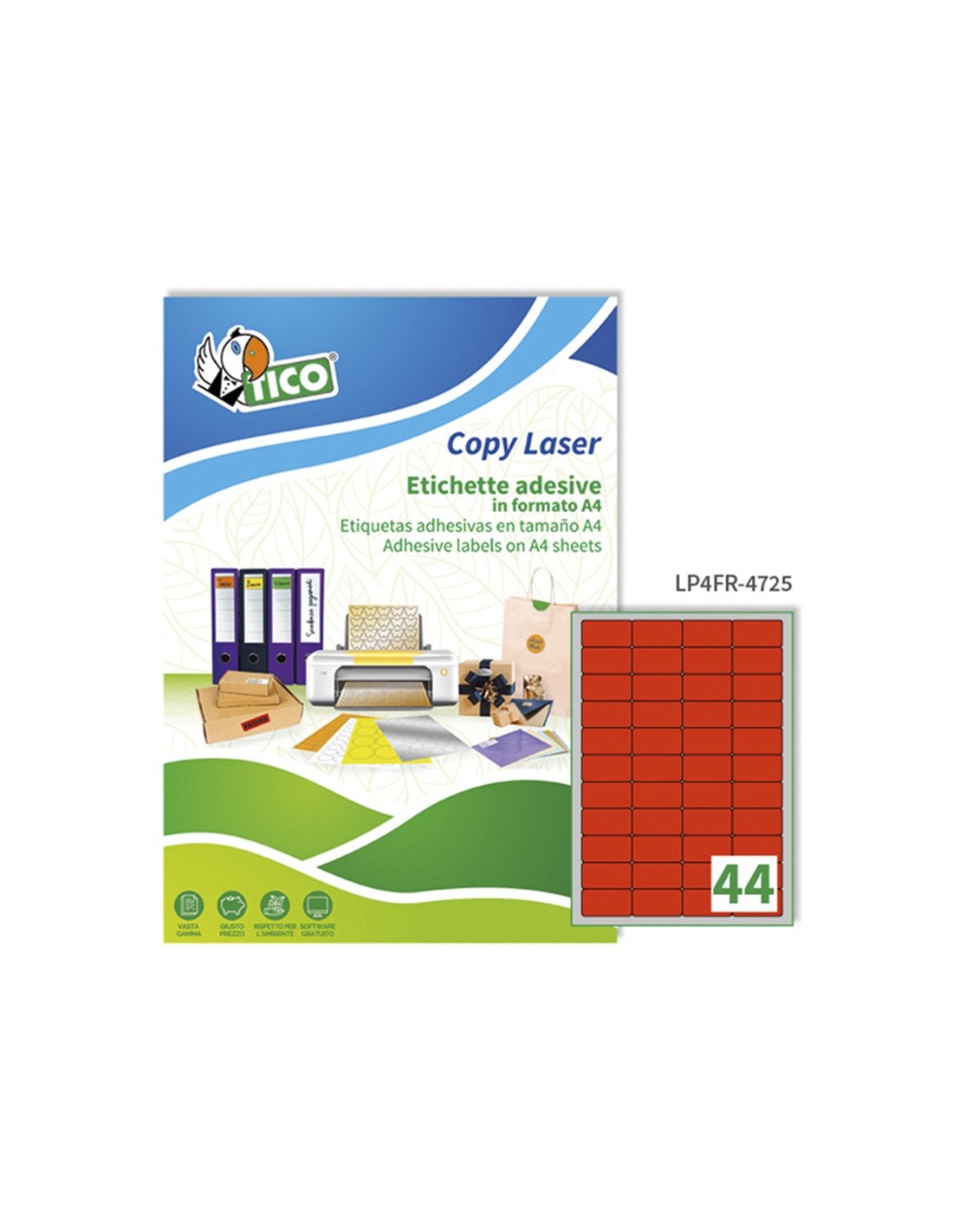 Etiqueta adhesiva de papel fluorescente roja, ideal para señalización. 3080 Tico. Medidas: 47,5x25,5 mm. Utiliza el software crea e imprime gratuitode Tico para realizar el diseño de las etiquetas con pocos clics. Caja de 70 hojas Din A4 fabricada con papel certificado FSC.