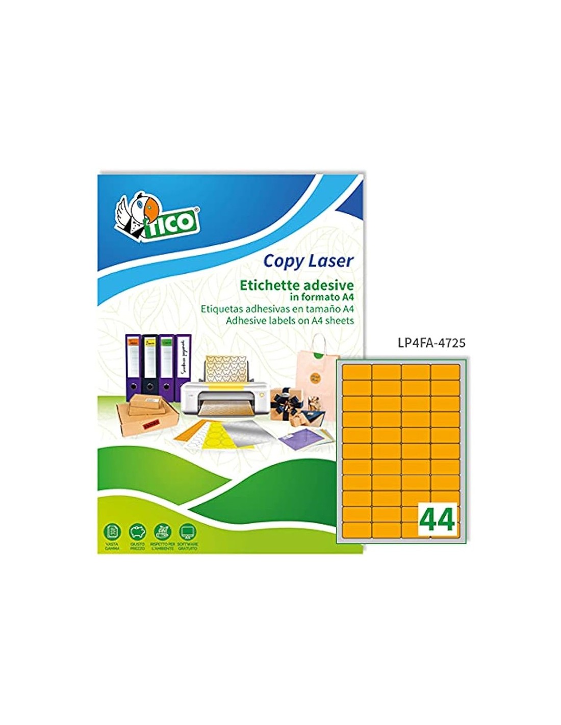 Etiqueta adhesiva de papel fluorescente naranja, ideal para señalización. 3080 Tico. Medidas: 47,5x25,5 mm. Utiliza el software crea e imprime gratuito de Tico para realizar el diseño de las etiquetas con pocos clics. Cajade 70 hojas Din A4 fabricada con papel certificado FSC.