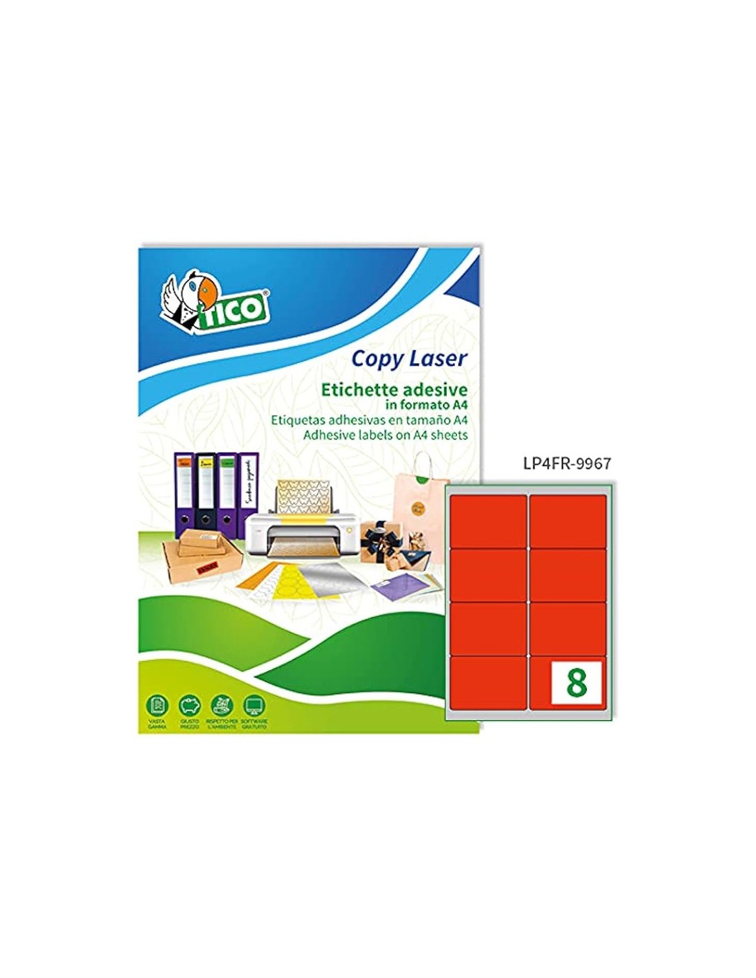 Etiqueta adhesiva de papel fluorescente roja, ideal para señalización. 560Tico. Medidas: 99,1x67,7 mm. Utiliza el software crea e imprime gratuito de Tico para realizar el diseño de las etiquetas con pocos clics. Caja de 70 hojas Din A4 fabricada con papel certificado FSC.