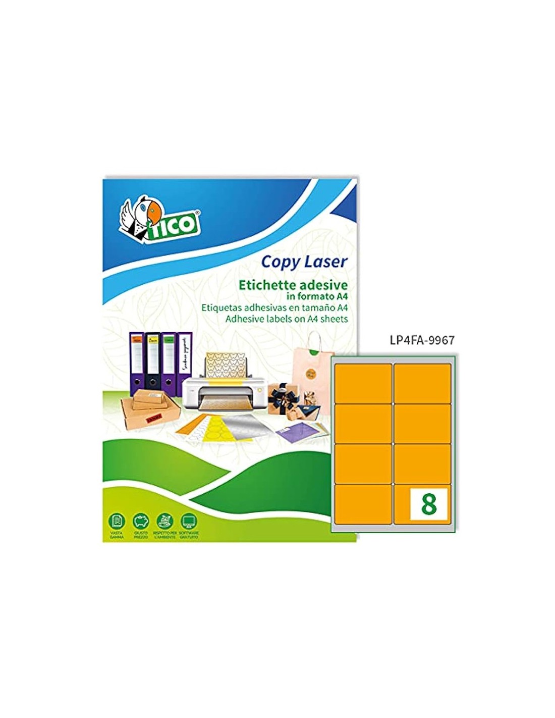 Etiqueta adhesiva de papel fluorescente naranja, ideal para señalización. 560 Tico. Medidas: 99,1x67,7 mm. Utiliza el software crea e imprime gratuito de Tico para realizar el diseño de las etiquetas con pocos clics. Caja de 70 hojas Din A4 fabricada con papel certificado FSC.