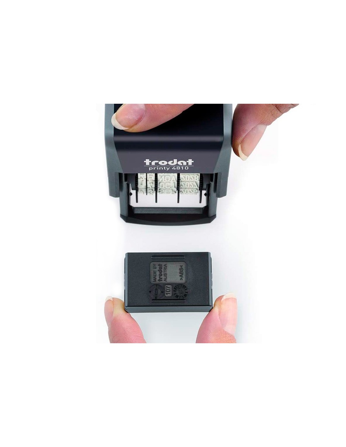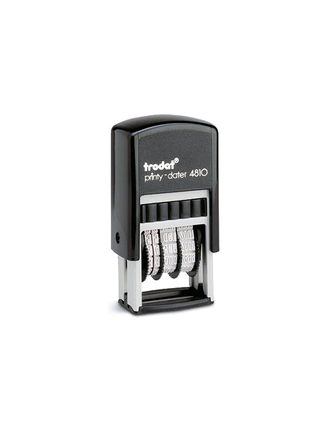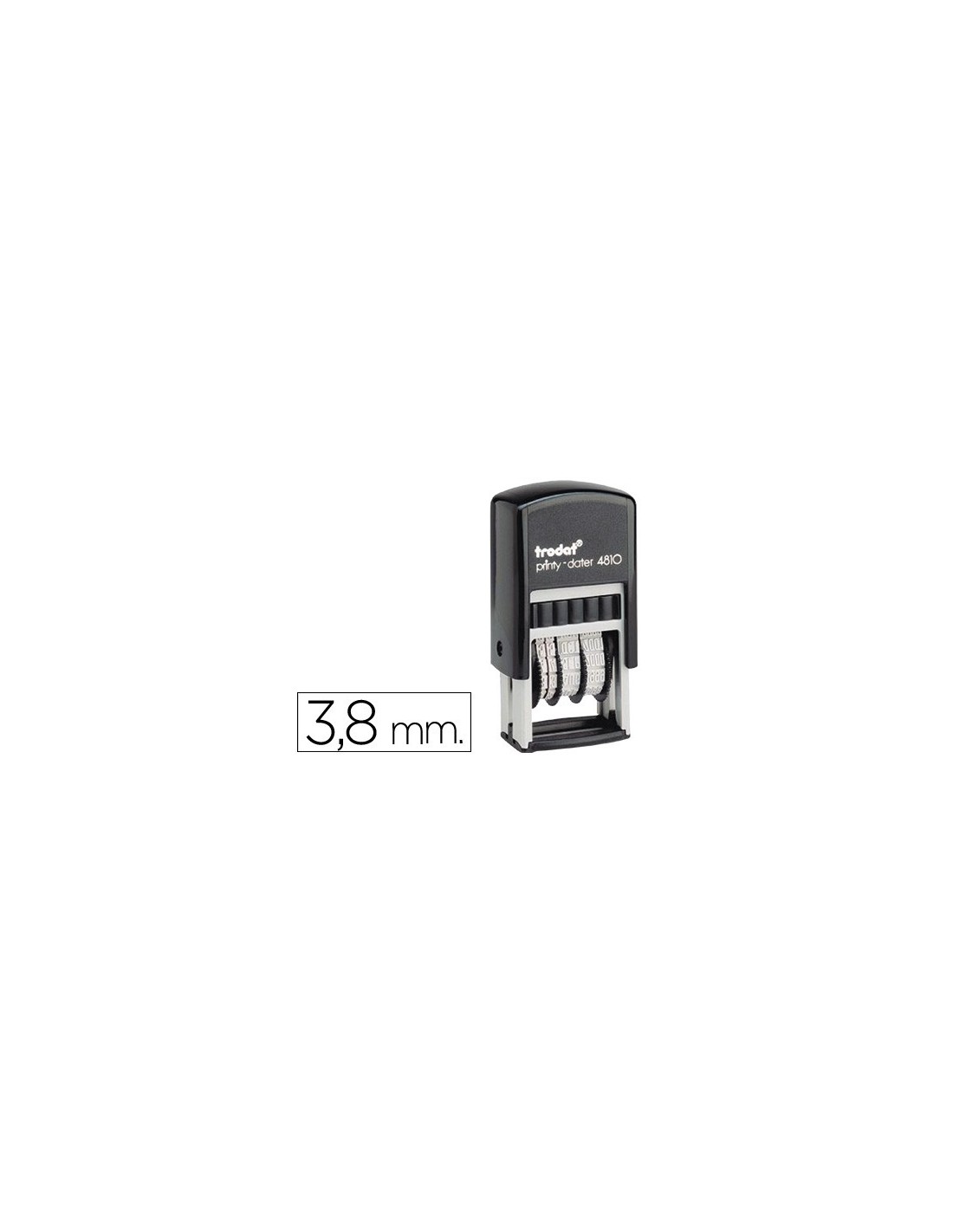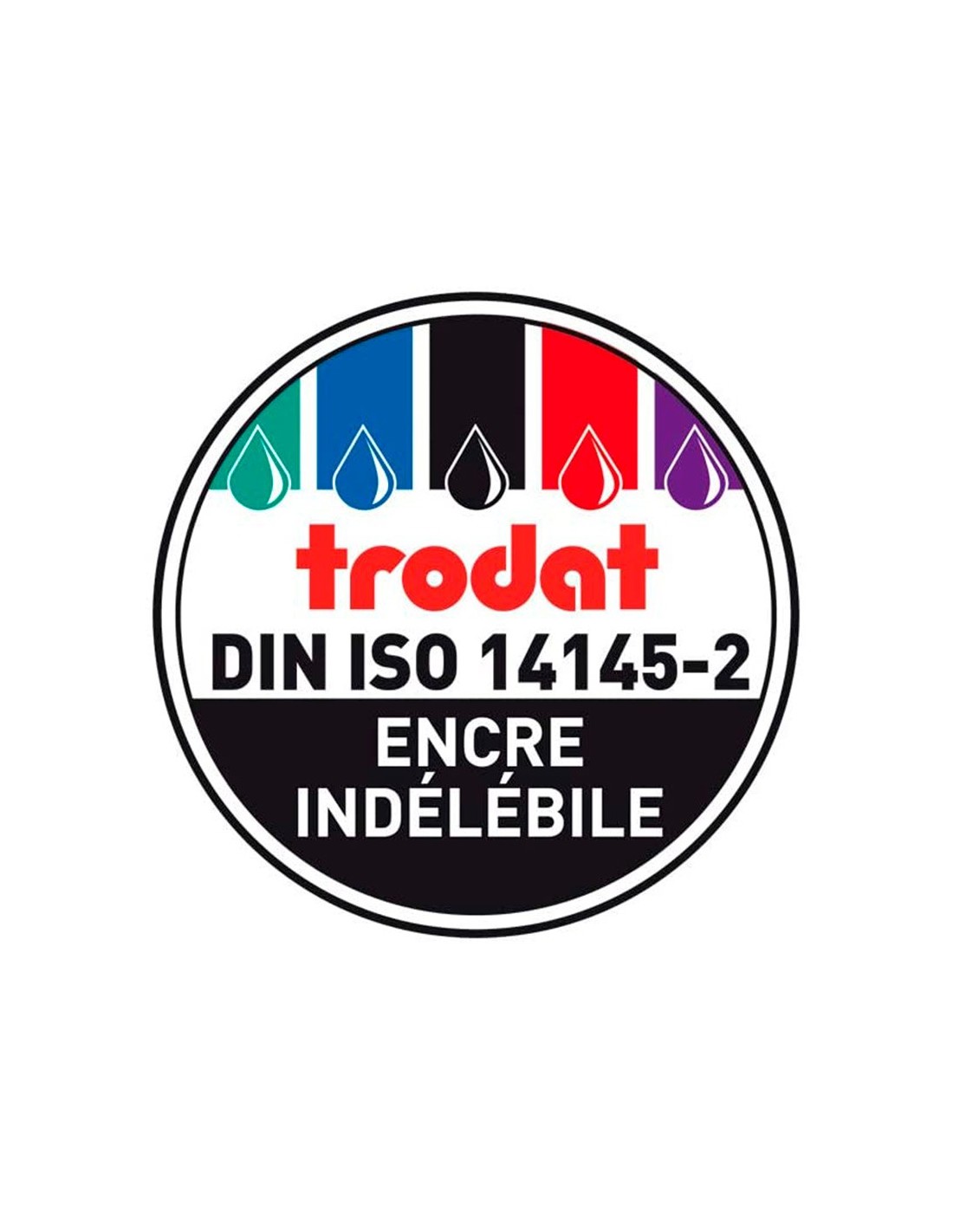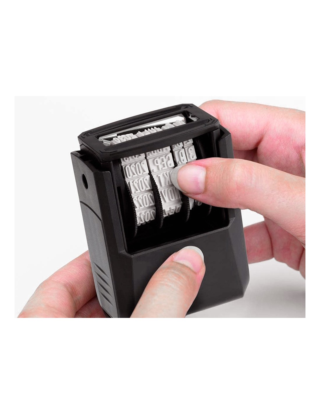 Entintaje automático. Incluye día/mes/año. Fecha de 3,8mm de altura. Con banda para 12 años. Disponible en castellano, catalán, euskera y portugués. Color de la tinta a elegir entre negro,azul,rojo,verde,violeta o sin tinta