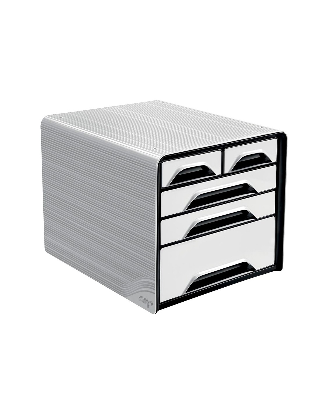 Fichero muy resistente. Acabado con textura en relieve, contemporáneo y refinado. 5 cajones con asas ergonómicas y un agujero de agarre para facilitar la entrada del contenido. Indicado para carpetas de hasta formato 24 x 32 cm. Con almohadillas antideslizantes y etiquetas de indización. Capacidad útil de un cajón: 322 x 244 x 40 mm.