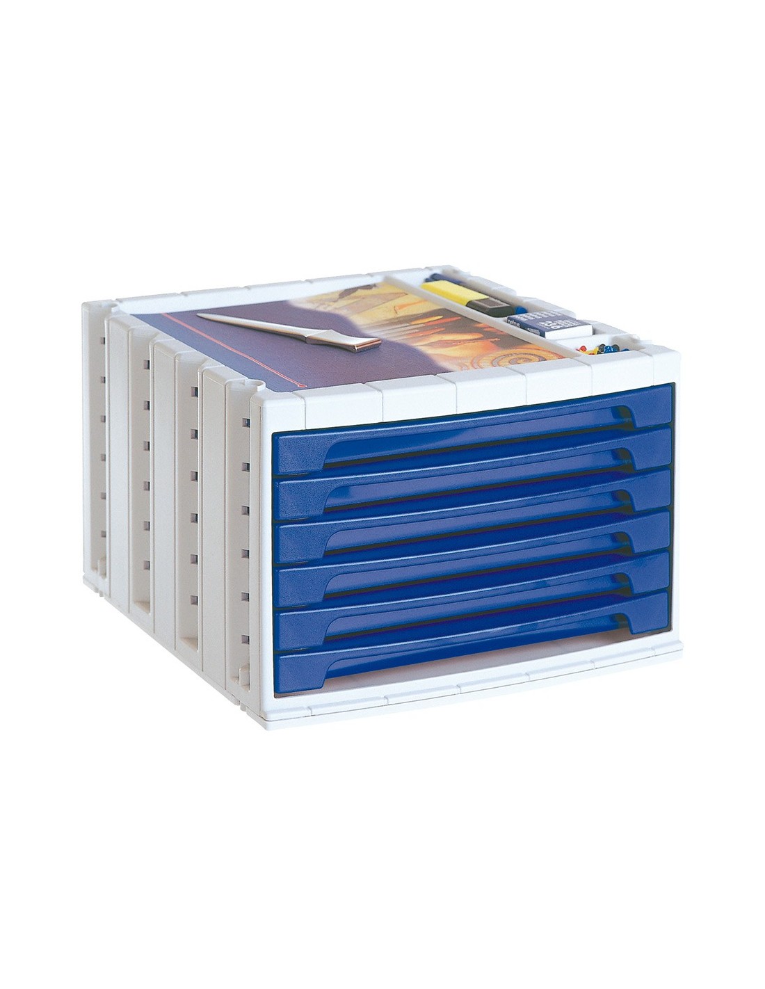 Módulo de 6 cajones sostenible Archivo 2000 Archivotec. Fabricado en poliestireno 100% reciclado y reciclable. Cajones con tope de seguridad y suave deslizamiento. Incluye una bandeja organizadora en la parte superior. La incorporación de ruedas permite formar carritos de oficina sin necesidad de añadir una plataforma adicional. Apilamiento perfecto y estable, con la simple colocación de un módulo de cajones sobre otro. Válido para formatos A4, folio y documentos de hasta 270x325 mm. Carcasa gris, cajones azules. Medidas interiores cajones: 325x270x24 mm. Medidas exteriores: 370x305x215 mm. Fabricado en España.