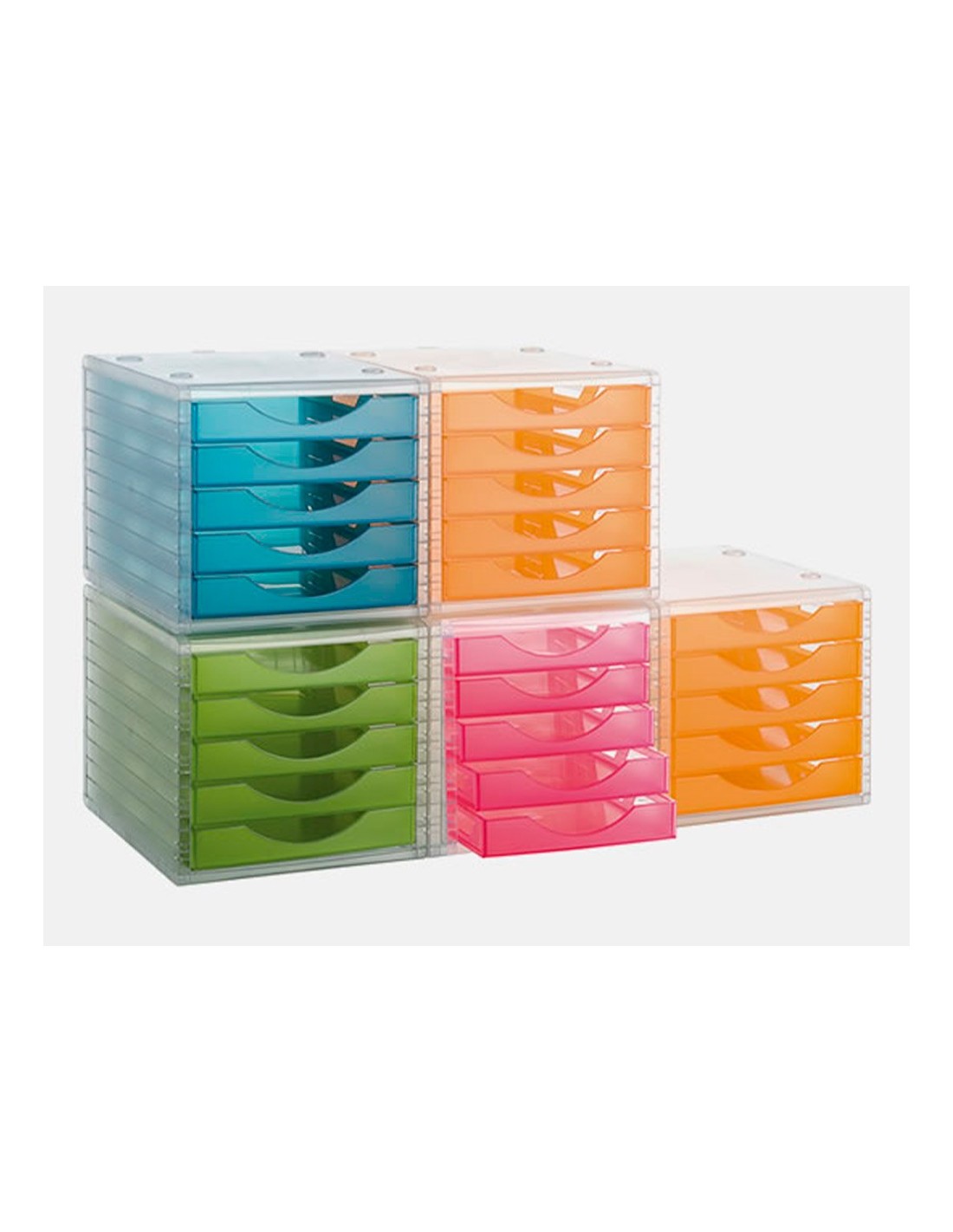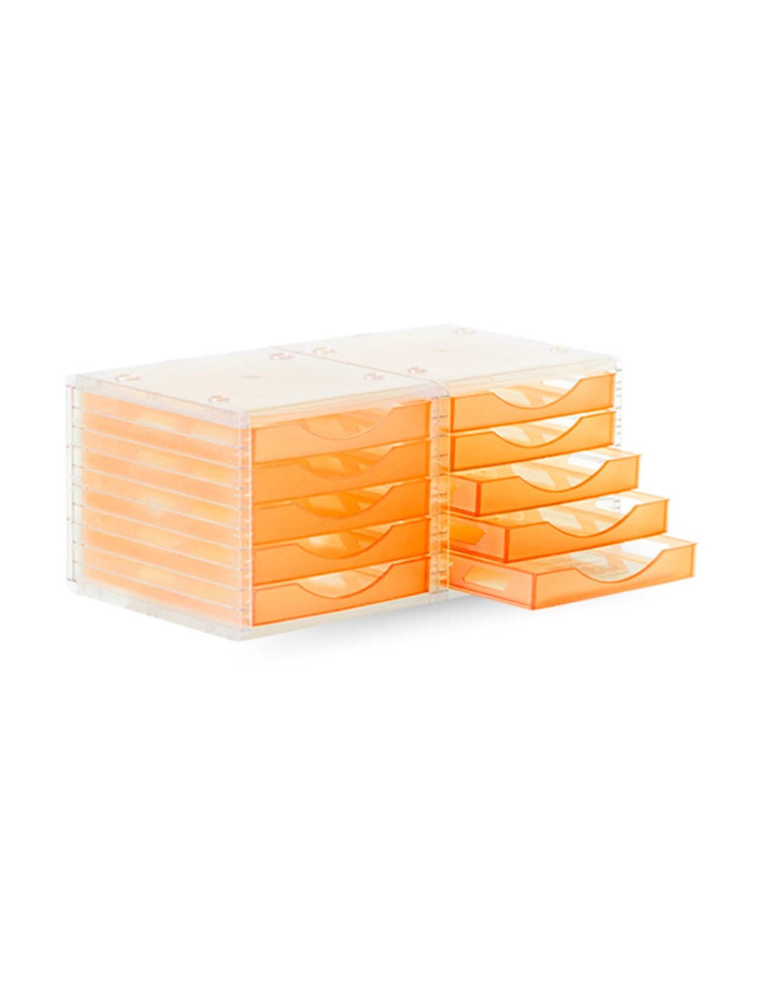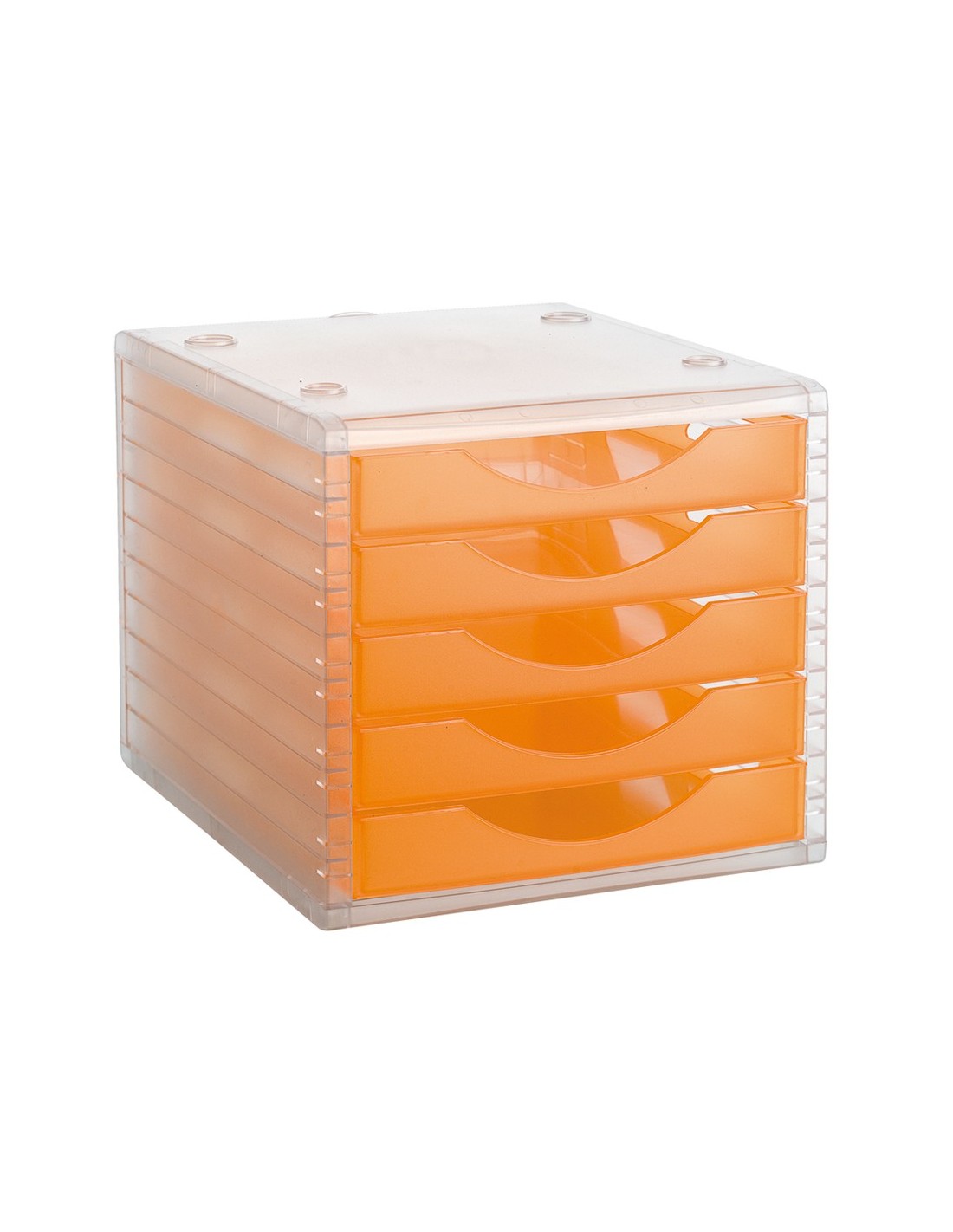 Módulo organizador de 5 cajones Archivo 2000 Archivotec traslúcido. Fabricado en poliestireno de gran calidad y resistencia. Cajones traslúcidos con tope de seguridad y suave deslizamiento. Apilamiento perfecto y estable, con la simple colocación de un módulo de cajones sobre otro. Válido para formatos A4, folios y subcarpetas. Se entrega montado, listo para utilizar. Carcasa color cristal y cajones naranja traslúcido. Medidas interiores cajones: 323 x 234 x 38 mm. Medidas exteriores: 340x270x260 mm. Fabricado en España.