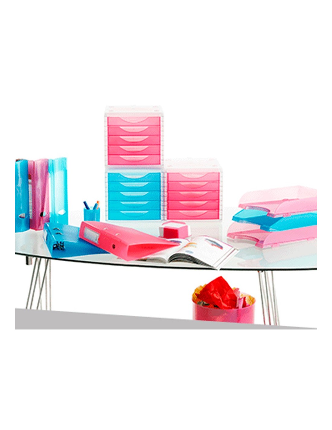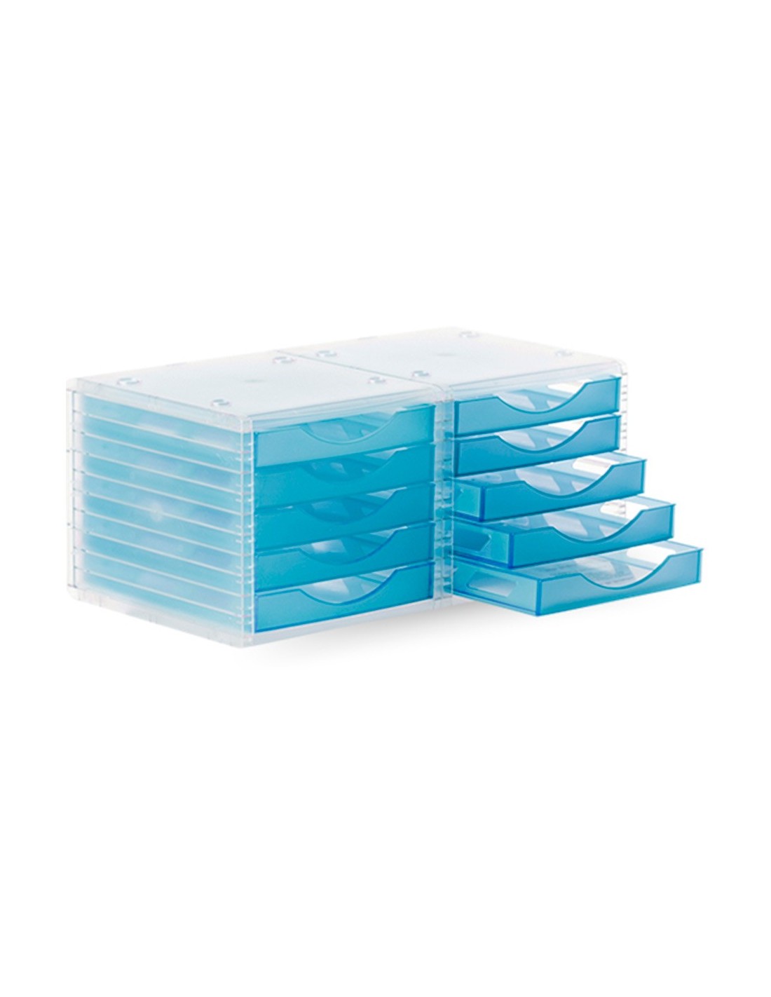 Módulo organizador de 5 cajones Archivo 2000 Archivotec traslúcido. Fabricado en poliestireno de gran calidad y resistencia. Cajones traslúcidos con tope de seguridad y suave deslizamiento. Apilamiento perfecto y estable, con la simple colocación de un módulo de cajones sobre otro. Válido para formatos A4, folios y subcarpetas. Se entrega montado, listo para utilizar. Carcasa color cristal y cajones azul mar traslúcido. Medidas interiores cajones: 323 x 234 x 38 mm. Medidas exteriores: 340x270x260 mm. Fabricado en España.