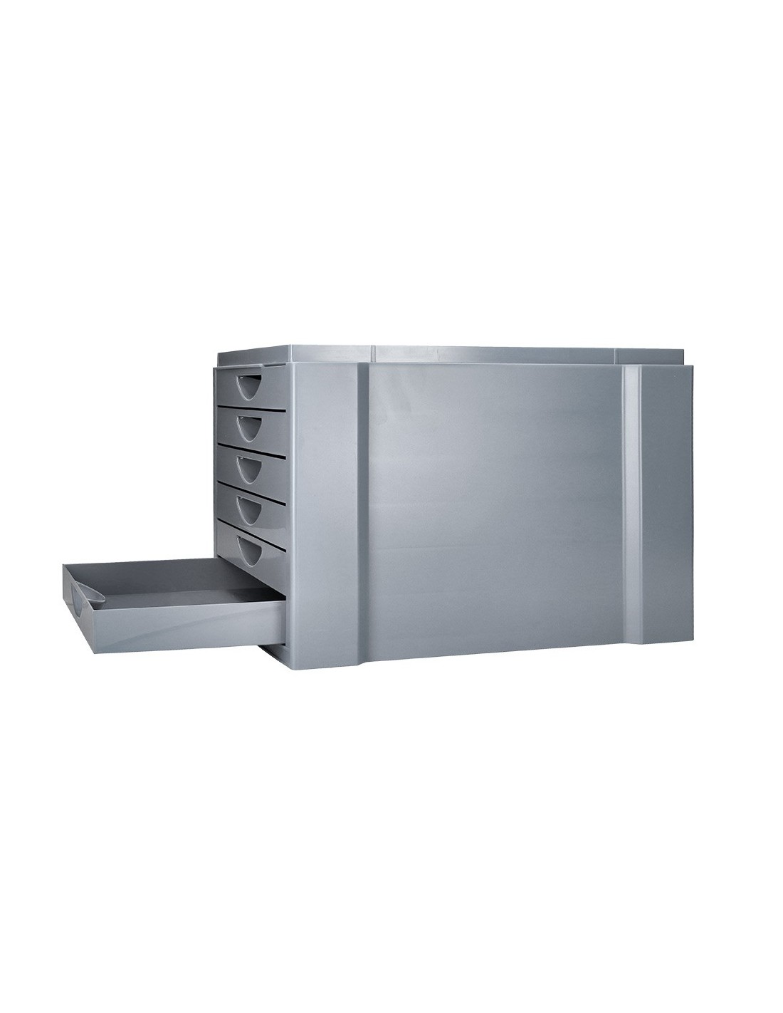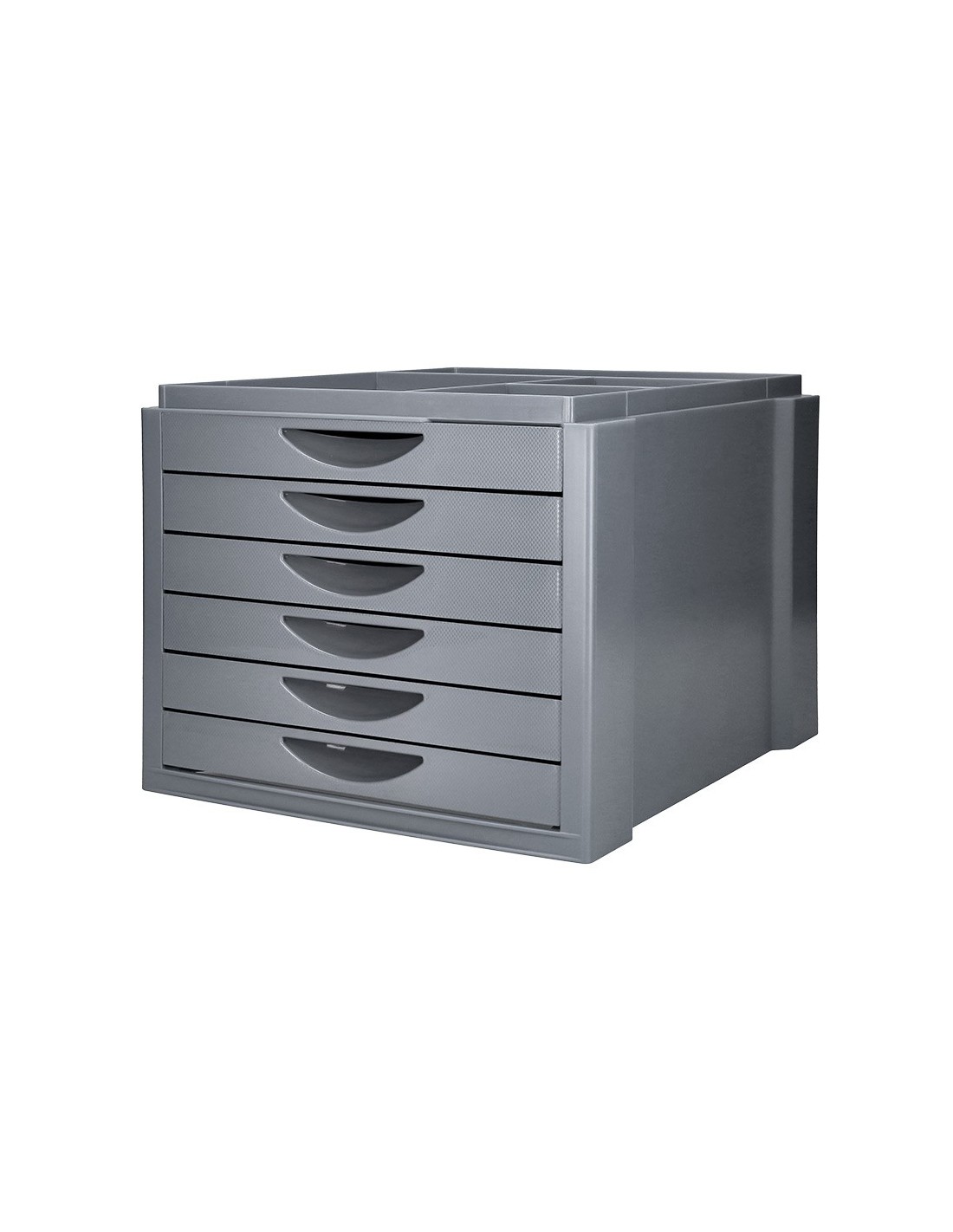 Módulo de sobremesa con carcasa gris y 6 cajones. Fabricado en poliestireno de gran calidad y resistencia. Apilable. Cajones con tope de seguridad y suave deslizamiento. Válido para formatos DIN A4, folio y subcarpetas. Incluye bandeja organizadora con 4 compartimentos en la parte superior para tener siempre a mano los accesorios de oficina. Medidas: 350 x 255 x 280 mm.