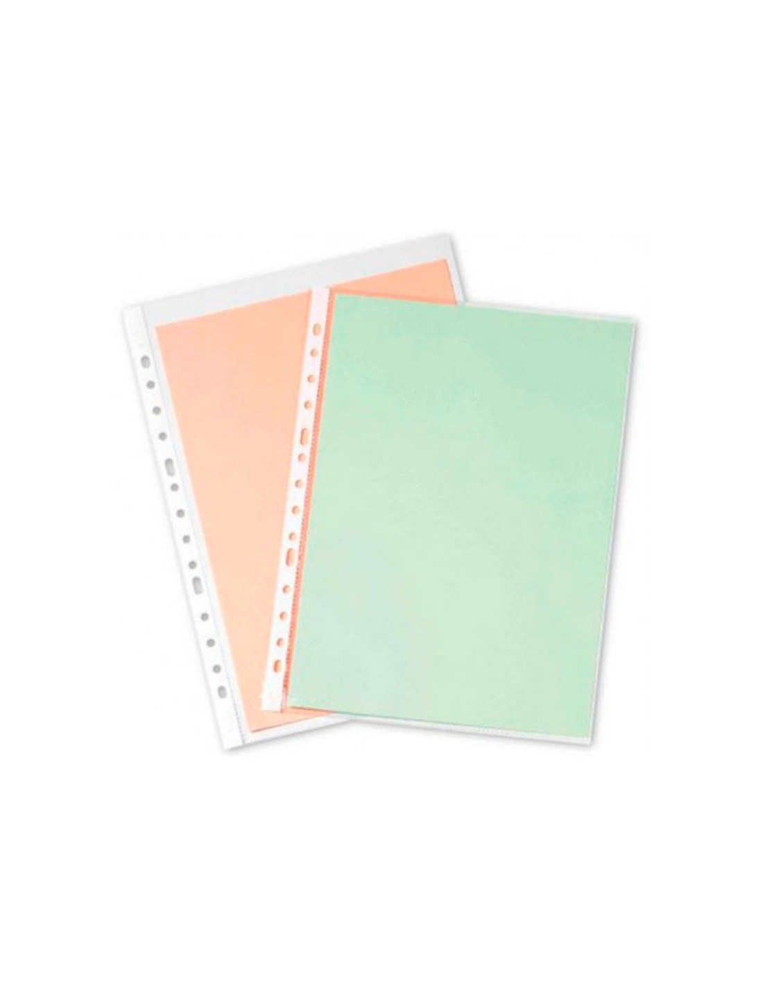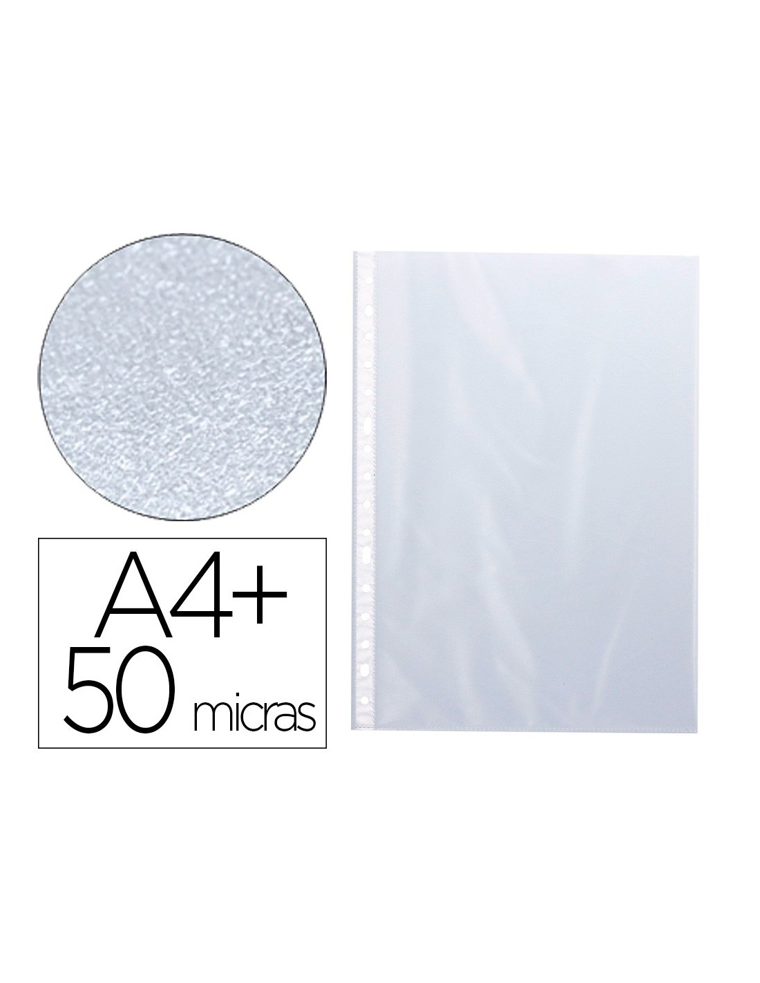 Funda para la protección y archivo de documentos. Fabricada en polipropileno transparente piel de naranja. 11 taladros. Grosor: 50 micras. Formato DIN A4+. La bolsa de 10 unidades.