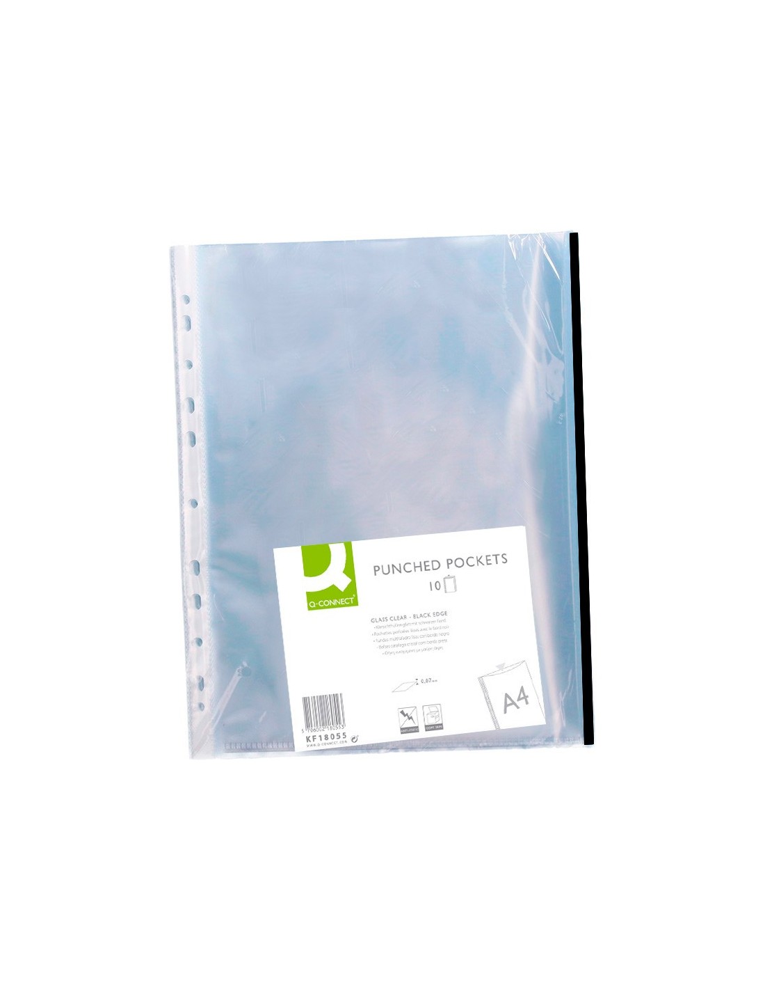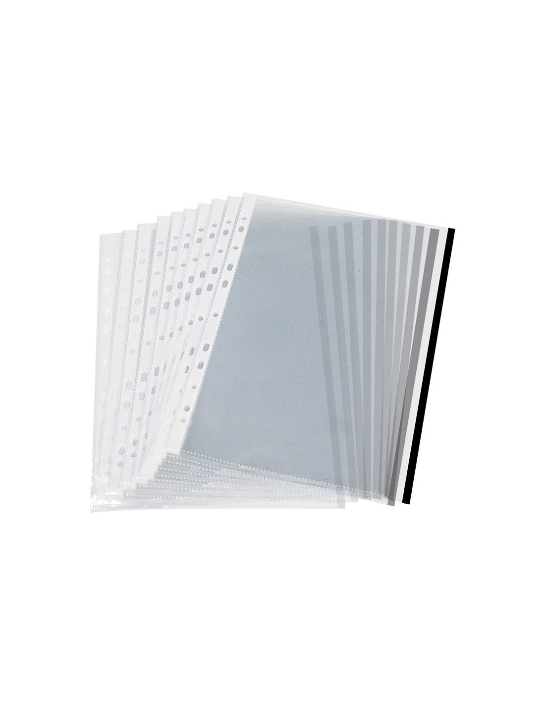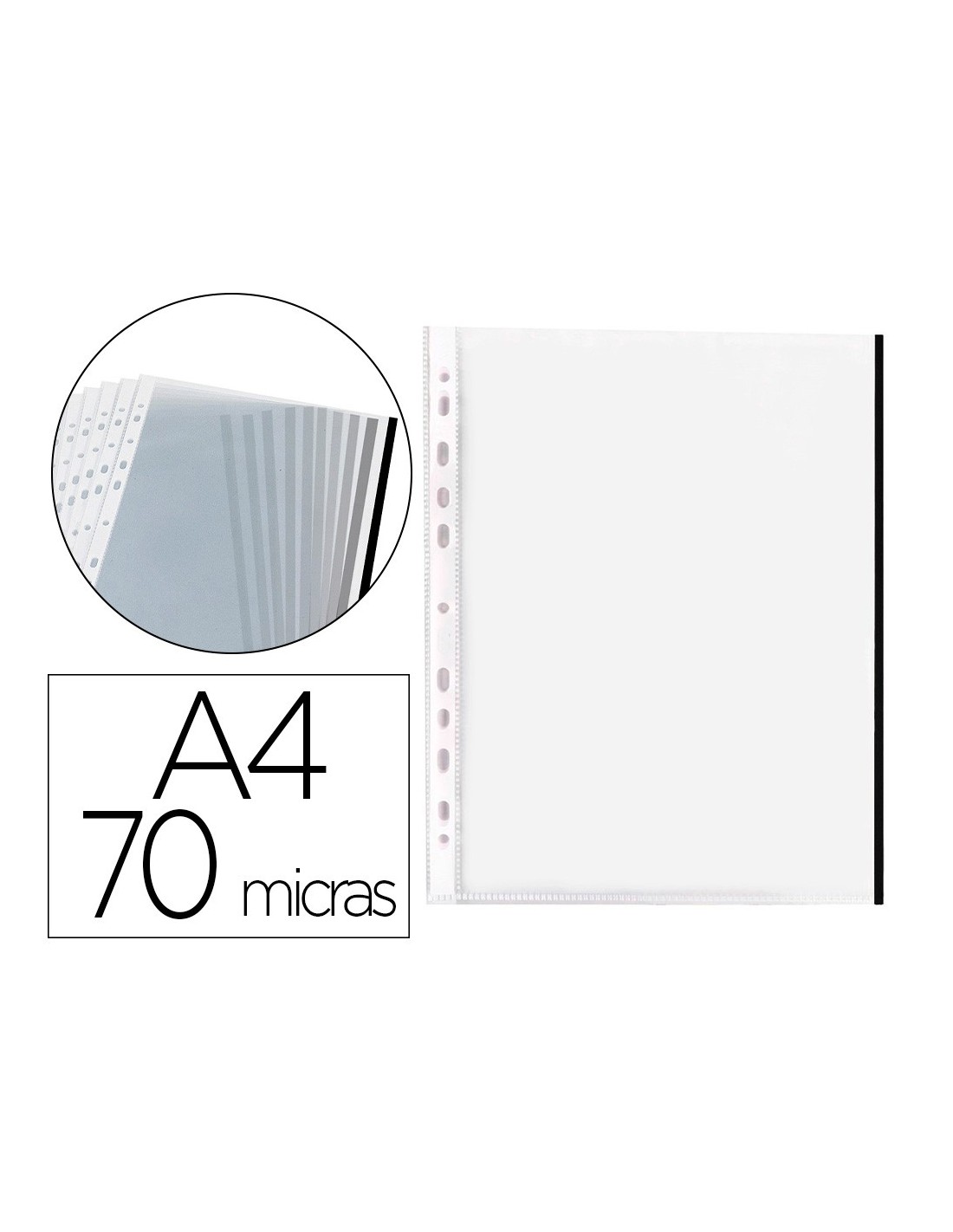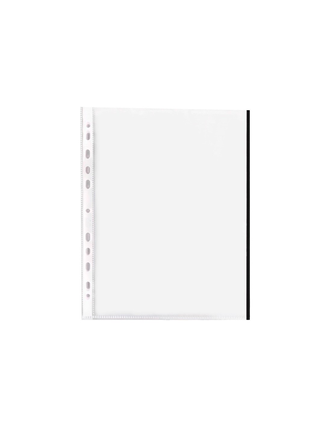 Funda para la protección y archivo de documentos. Con borde de color que ayuda a clasificar y distinguir la información. Fabricada en polipropileno cristal liso. 8 taladros. Grosor: 70 micras. Colores: amarillo, azul, negro, rojo y verde. Formato DIN A4. La bolsa de 10 unidades.