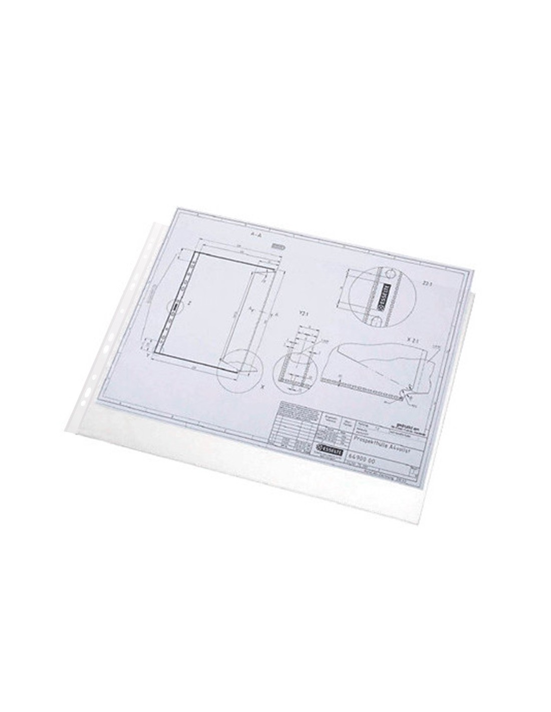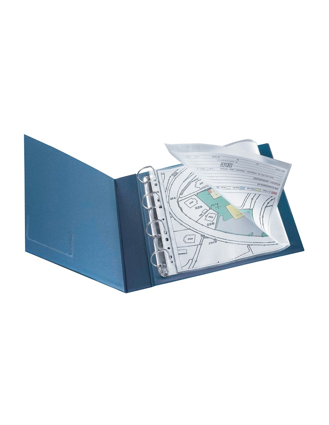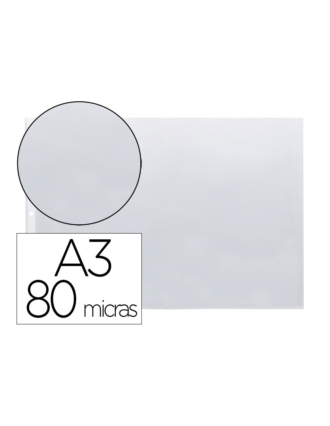 Funda multitaladro para protección y archivo de documentos. Con abertura lateral plegable, que permite convertir el formato DIN A3 apaisado en DIN A4 vertical. Fabricada en polipropileno transparente liso. 11 taladros. Grosor: 80 micras. Formato DIN A3. La bolsa de 10 unidades.