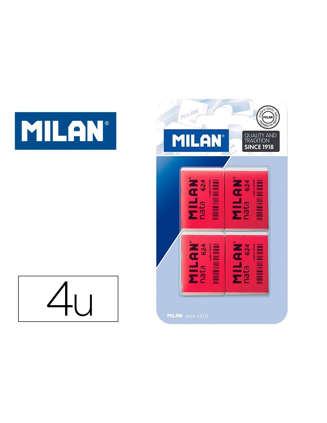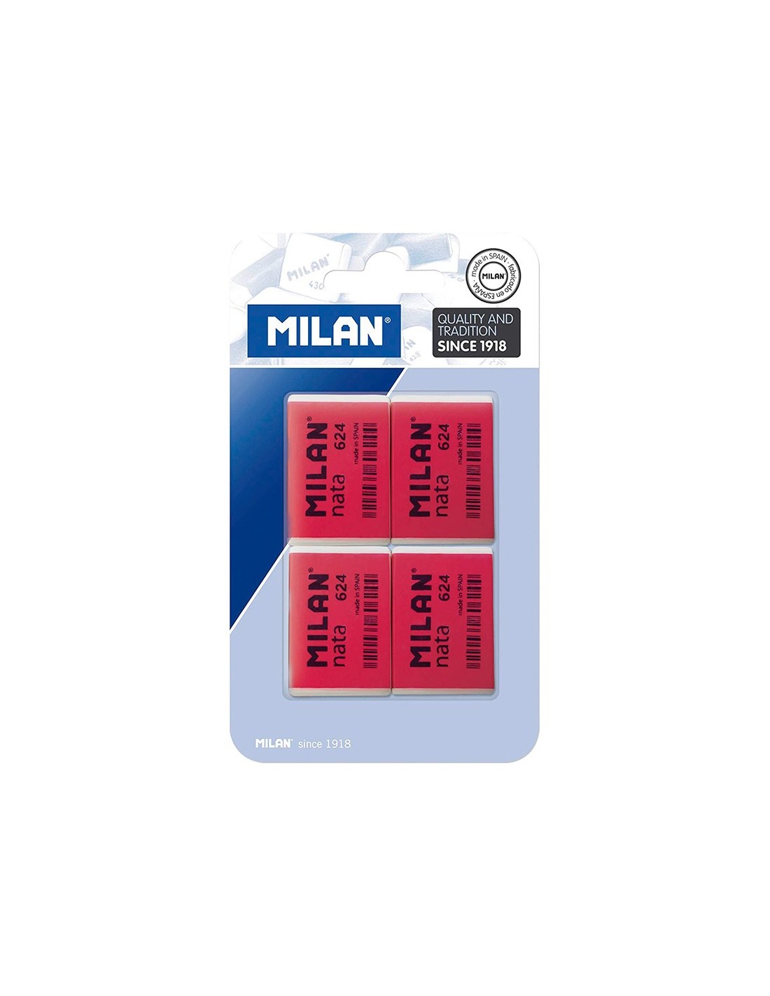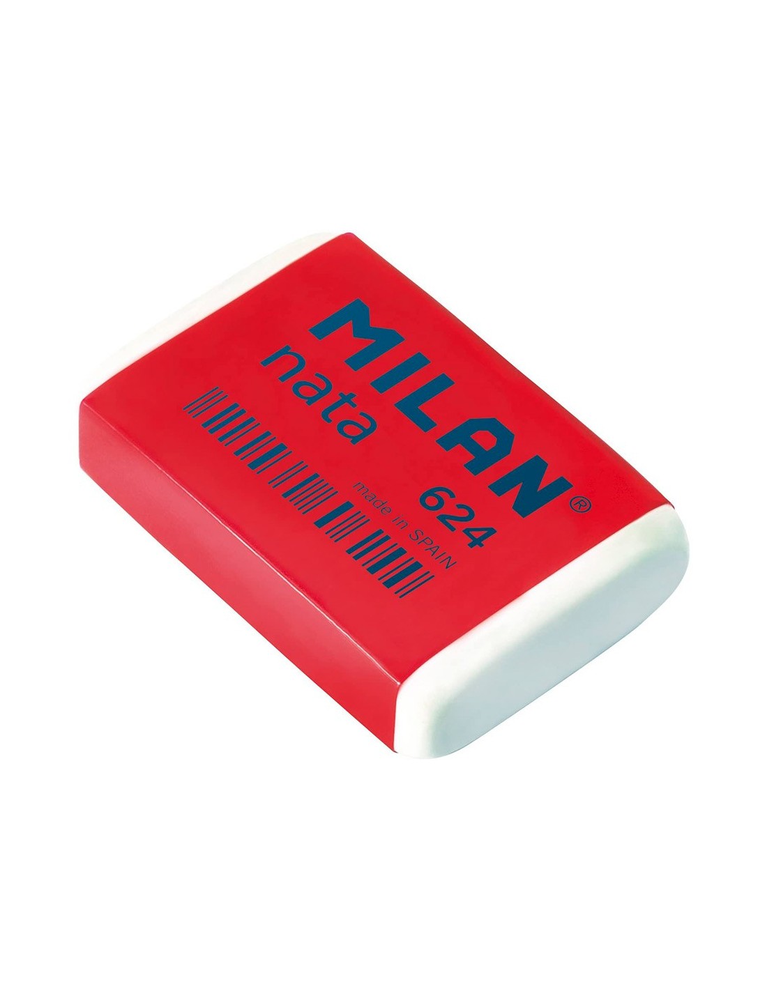 GOMA NATA® DE PLÁSTICO BLANCA, SUAVE, VERSÁTIL Y NO ABRASIVA PARA BORRAR SOBRE TODO TIPO DE SUPERFICIES. NO DAÑA EL PAPEL. ENVUELTA EN CELOFÁNROSA. NACIDA EN 1964, ES UNA DE LAS GOMAS MILAN MÁS ICÓNICAS. MEDIDAS GOMA: 3,9 X 2,7 X 0,9