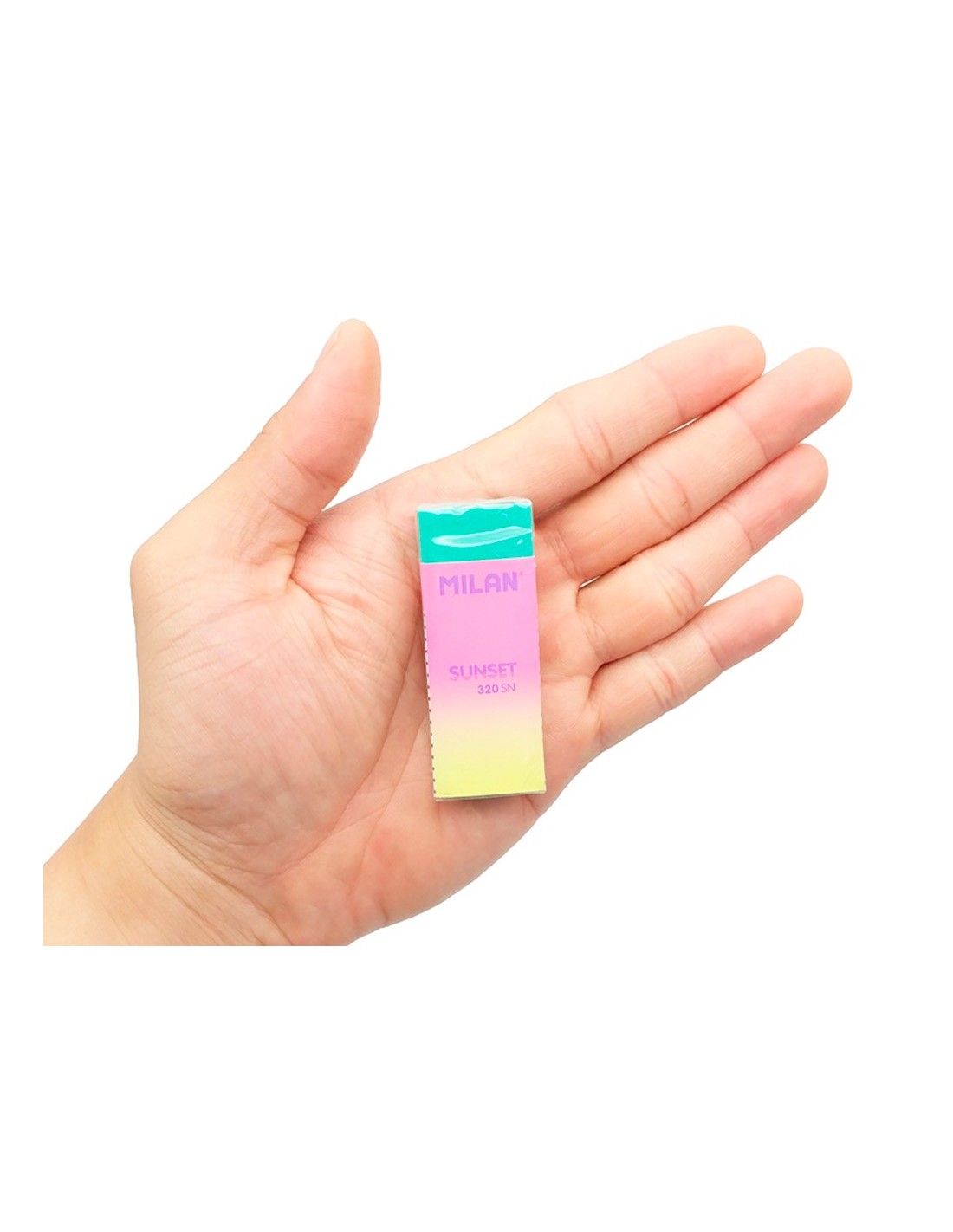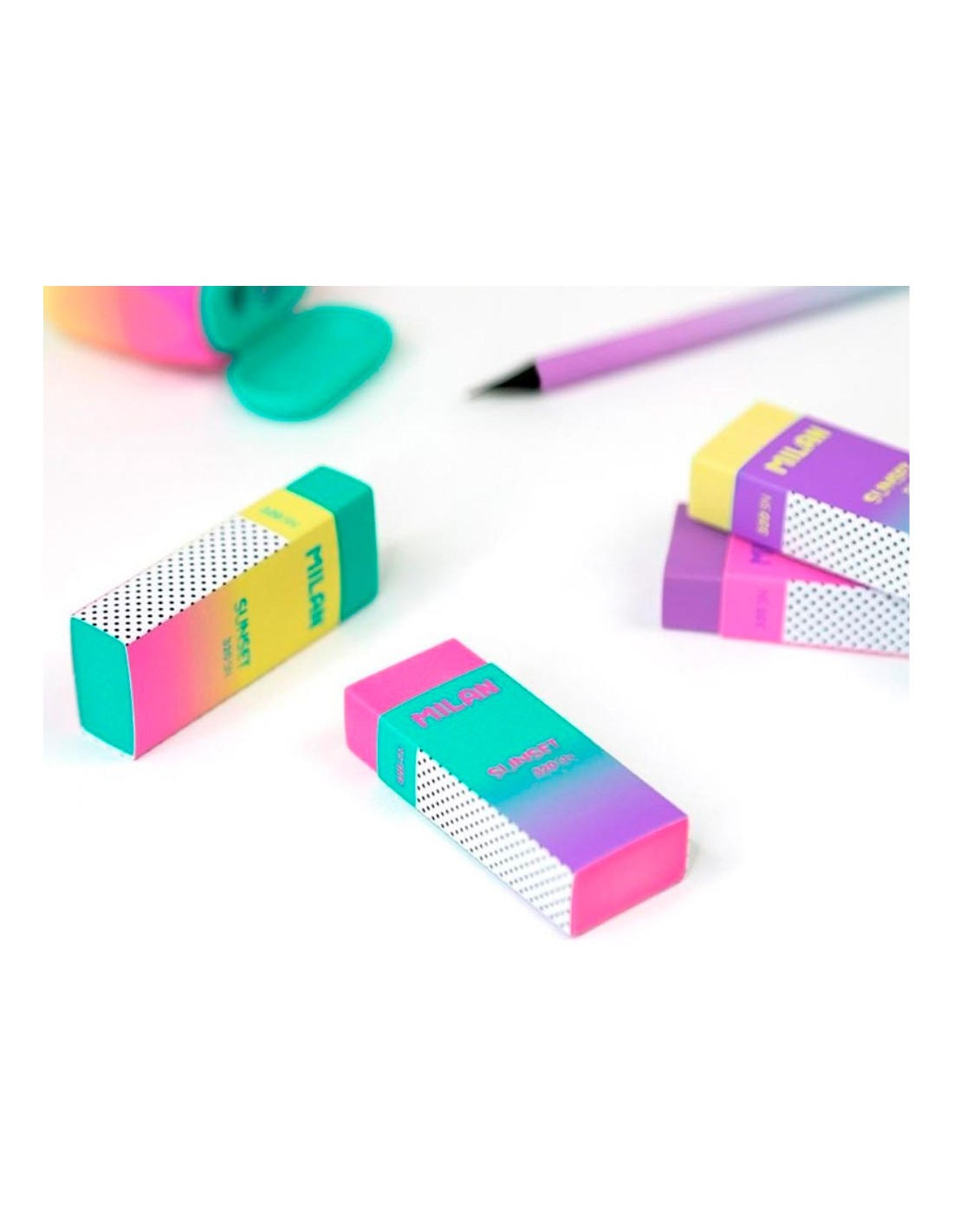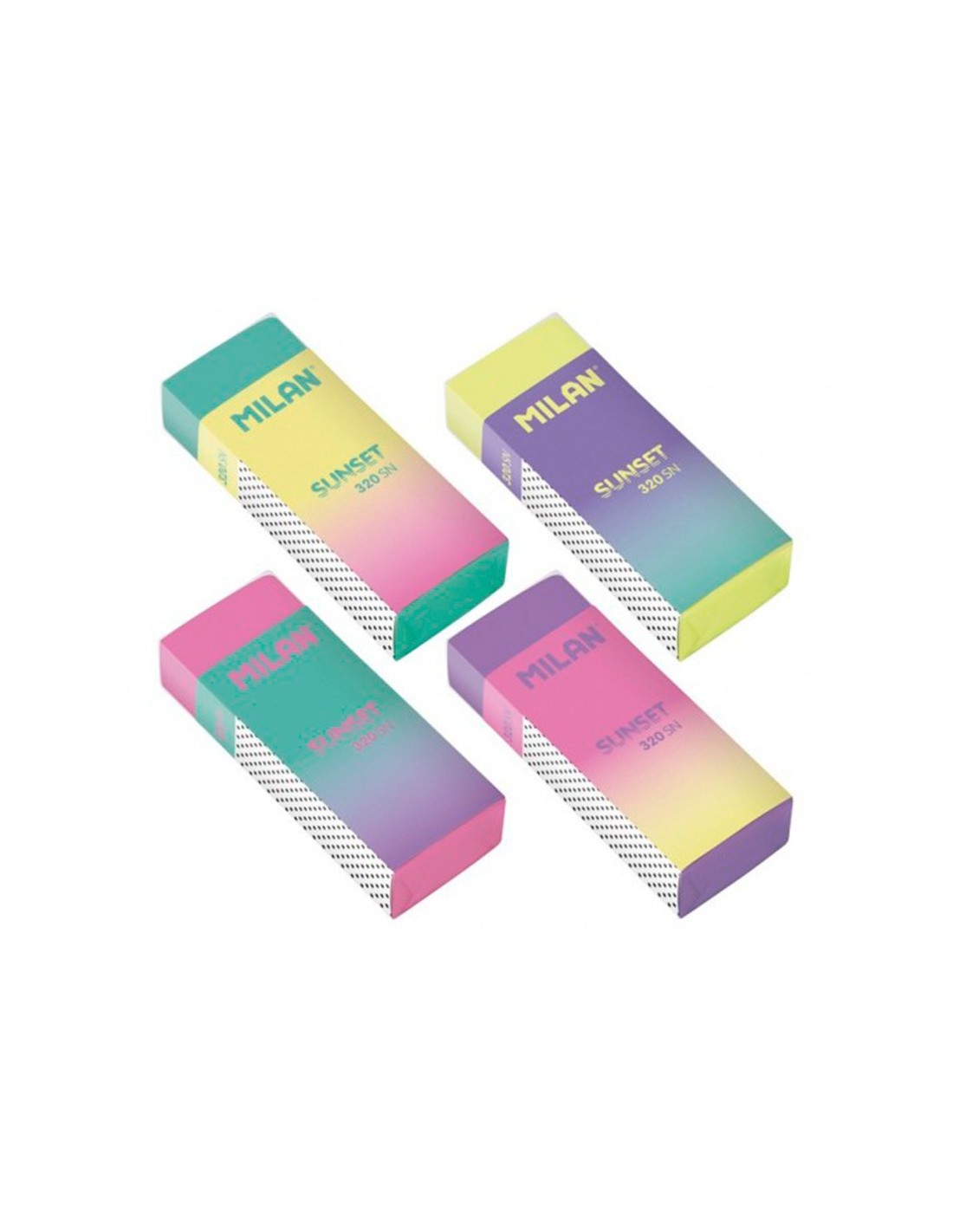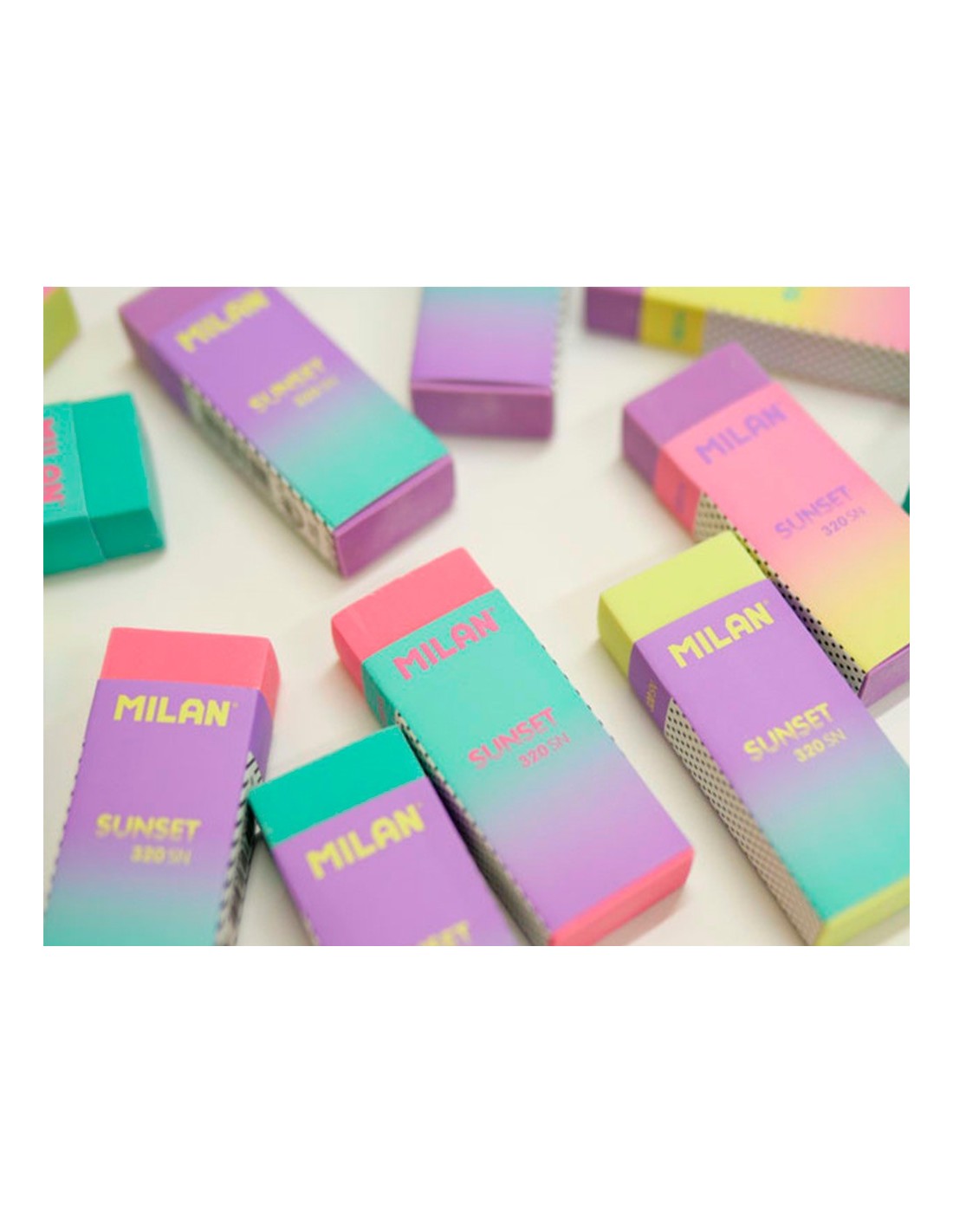 Goma nata® 320 serie Sunset. 4 colores surtidos disponibles: amarillo, lila, rosa y verde. Goma de plástico suave y versátil, no abrasiva. Para borrar lápiz sobre todo tipo de superficies. Con faja de cartón Sunset y envuelta individualmente. Medidas goma: 6,1 x 2,3 x 1,2 cm. Las gomas de borrar MILAN están fabricadas en España desde 1918.