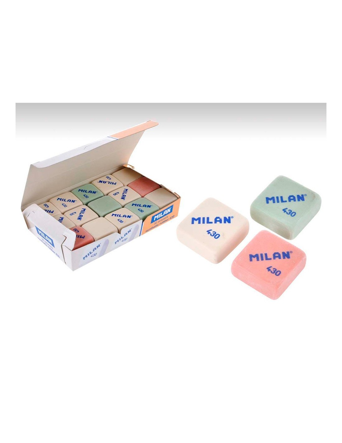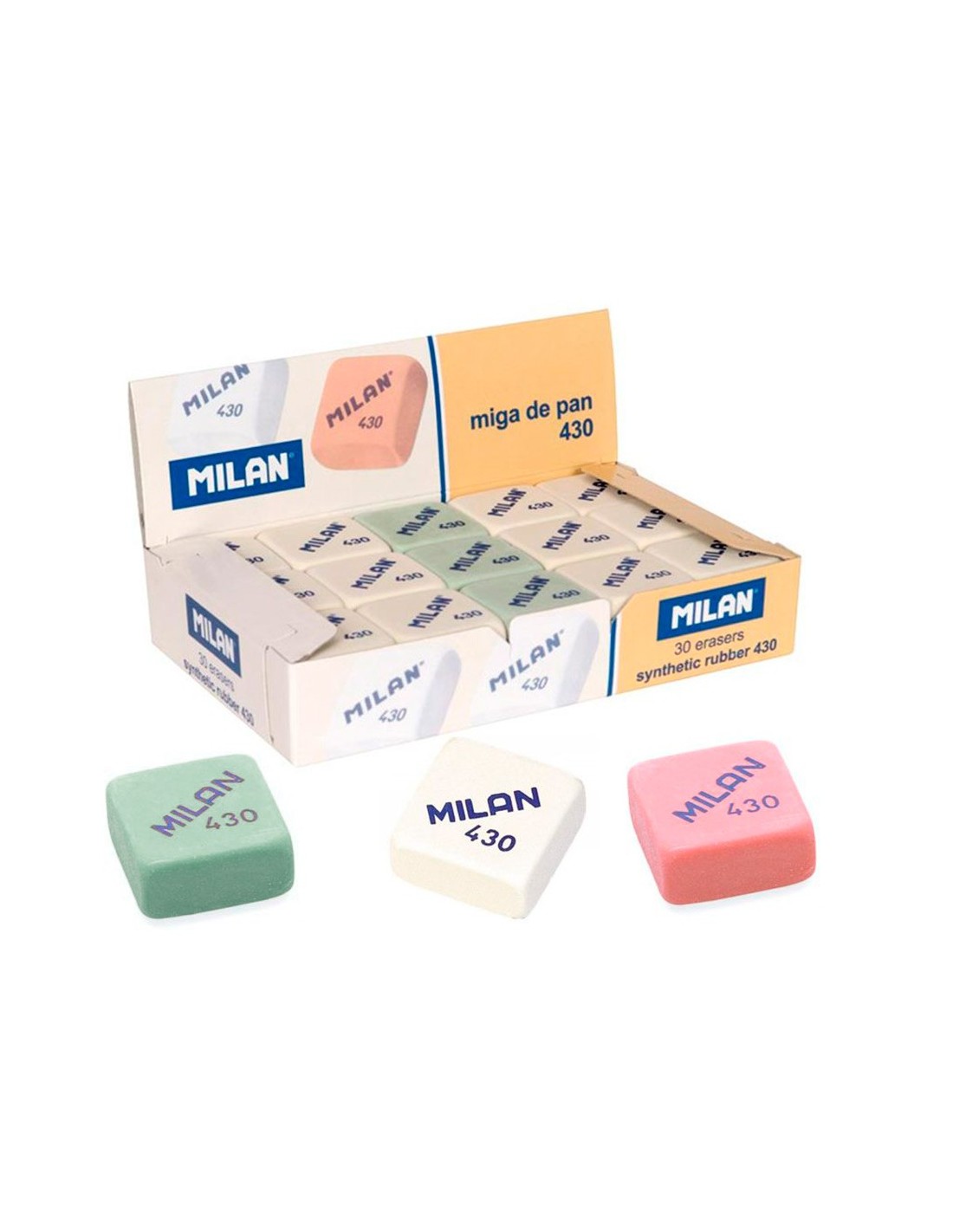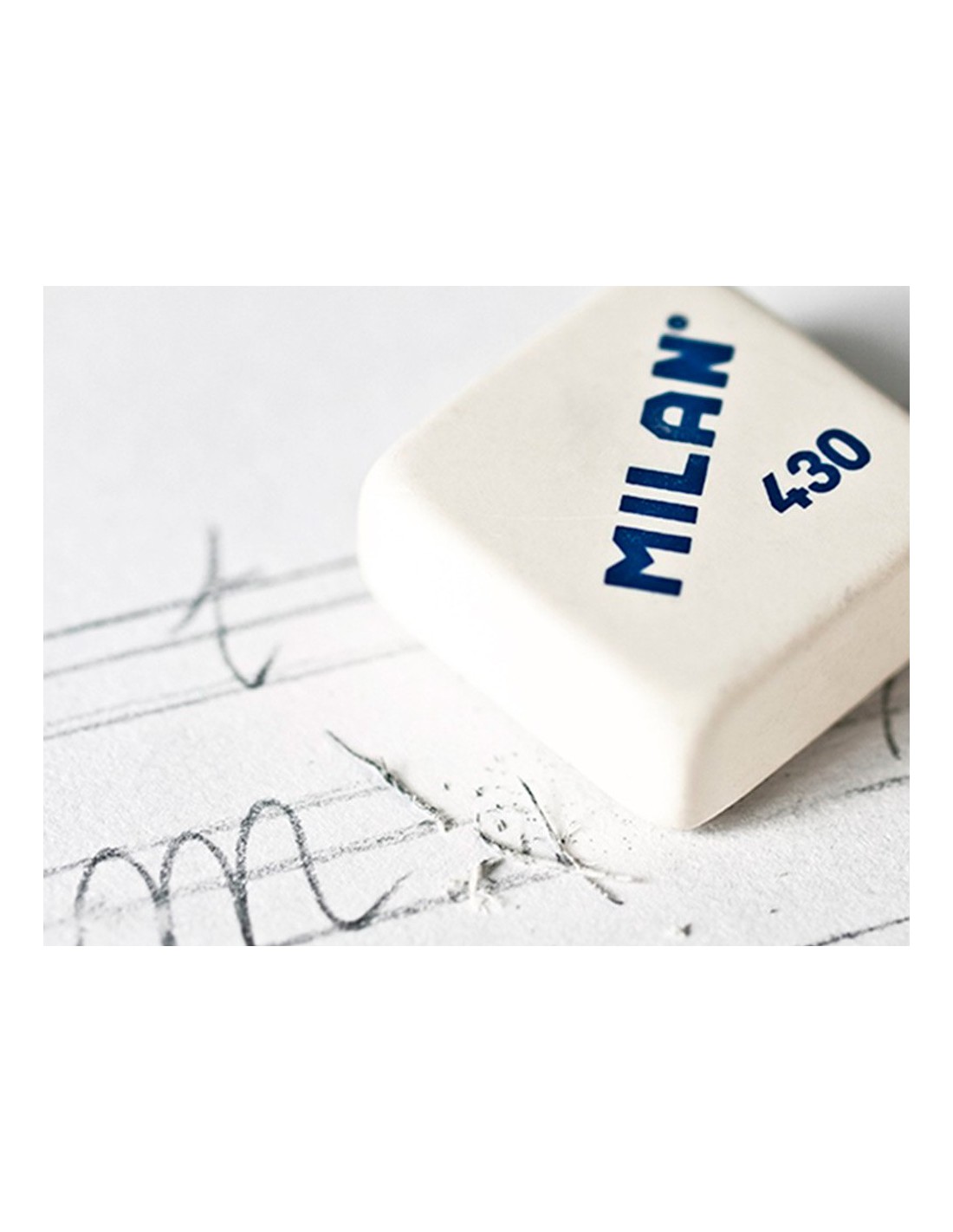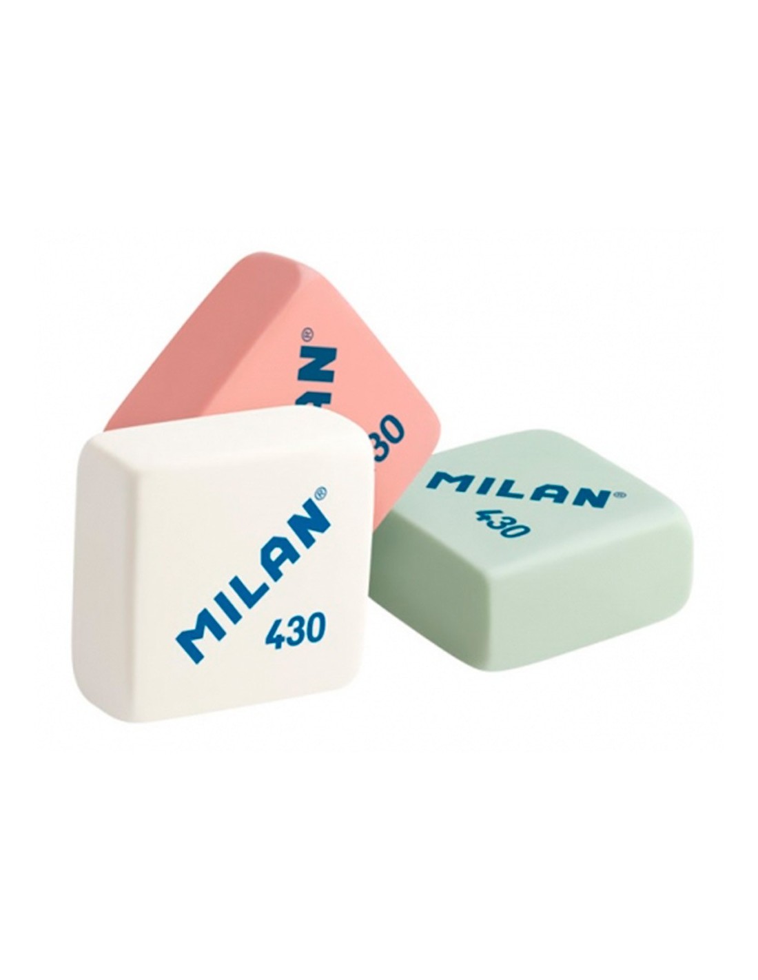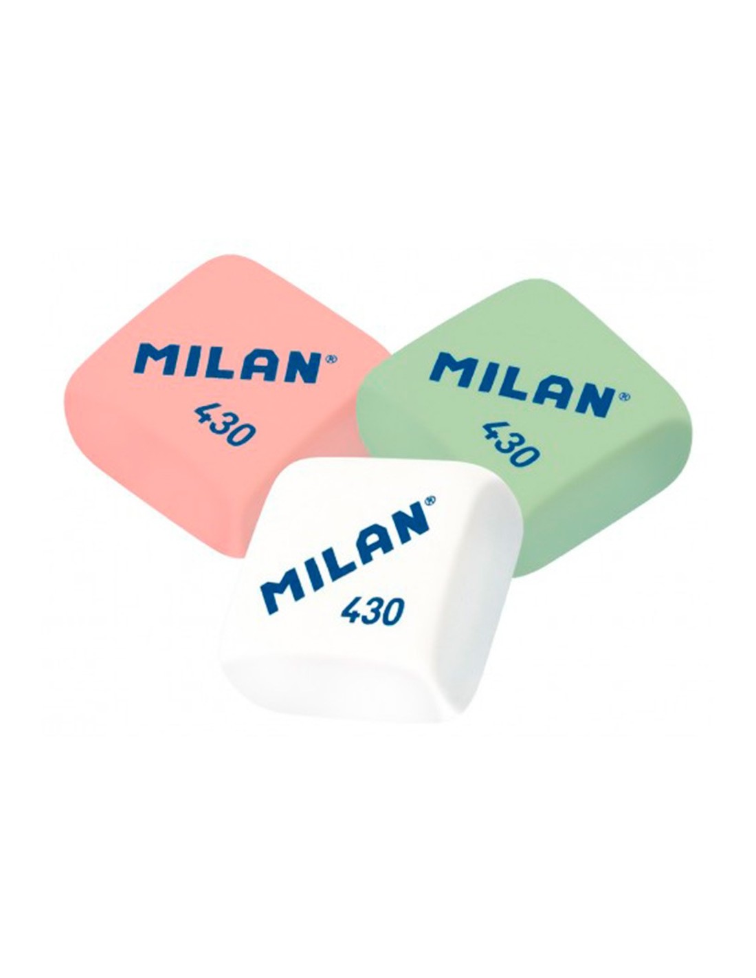 Goma suave de caucho sintético tipo 'miga de pan'. Para borrar una amplia gama de lápices de grafito sobre toda clase de papeles. La clásica goma MILAN 430 es una de las más vendidas. Colores surtidos: blanco, rosa y verde. Medidas goma: 2,8 x 2,8 x 1,3 cm. Goma de recambio para cualquier goma de borrar con afilalápices o eraser&brush de la familia COMPACT. Disponible también con funda. Las gomas de borrar MILAN están fabricadas en España desde 1918.