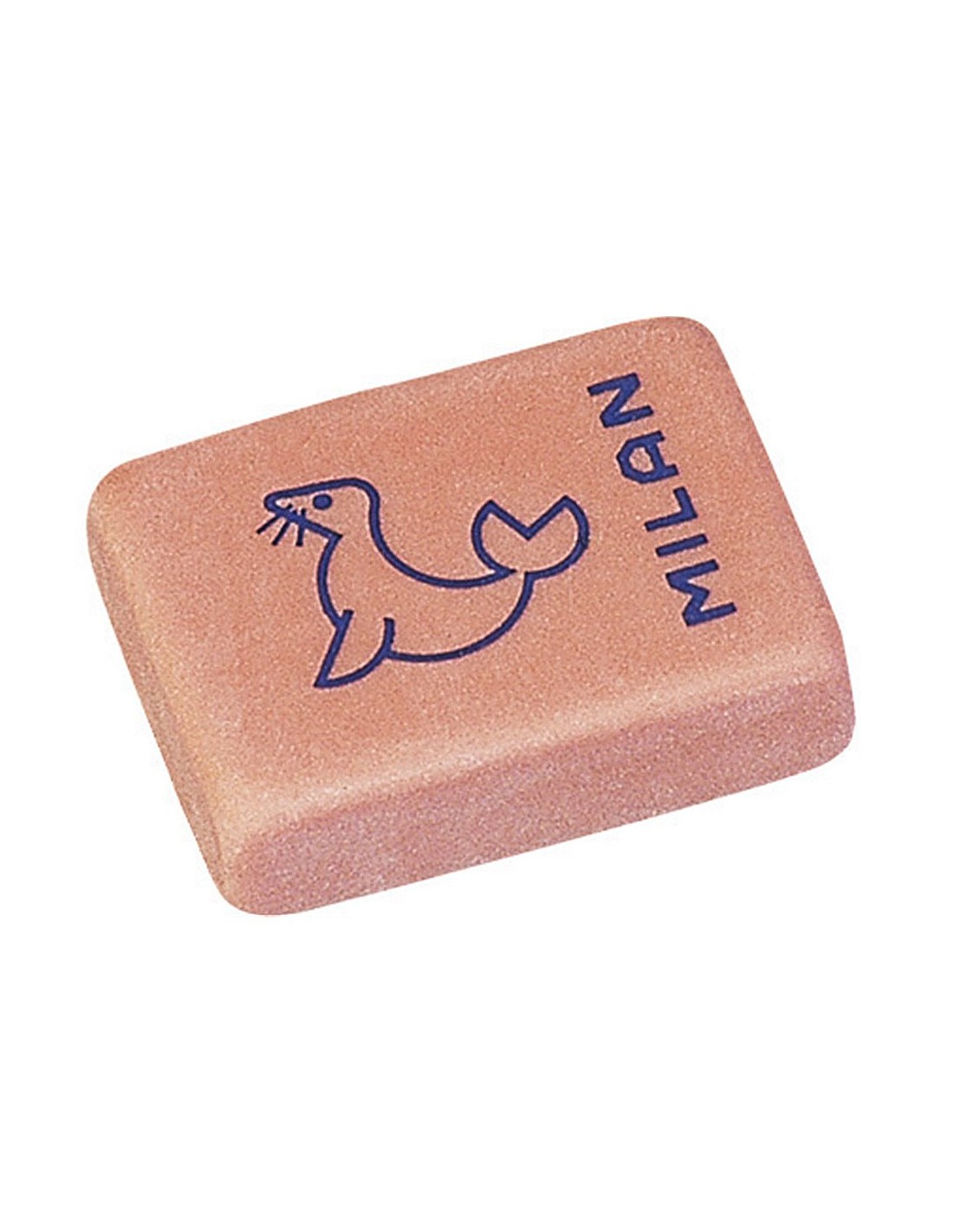 Goma suave de caucho sintético tipo miga de pan rectangular. Para borrar una amplia gama de lápices de grafito sobre toda clase de papeles. Con dibujos infantiles y colores surtidos: blanco y rosa. Medidas goma: 3,1 x 2,3 x 0,9 cm. Las gomas de borrar MILAN están fabricadas en España desde 1918.