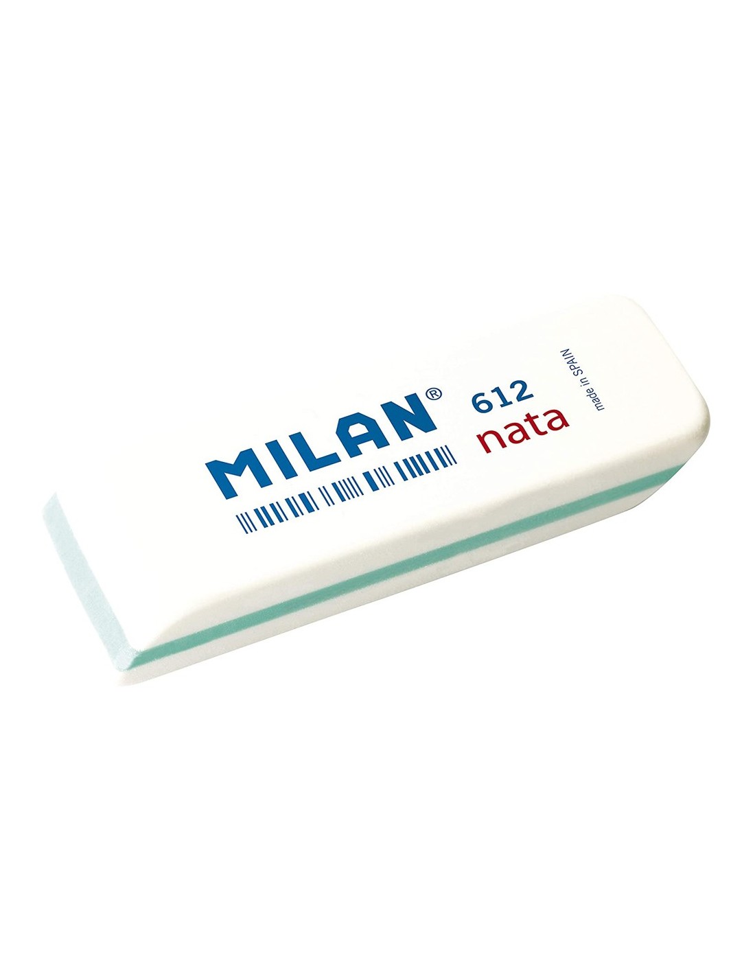 Goma nata® de plástico blanca, suave, versátil y no abrasiva. Para borrar sobre todo tipo de superficies. No daña el papel. Goma biselada blanca con un ribete de color rojo. Medidas goma: 7,8 x 2,3 x 1,2 cm. Las gomas de borrar MILAN están fabricadas en España desde 1918.