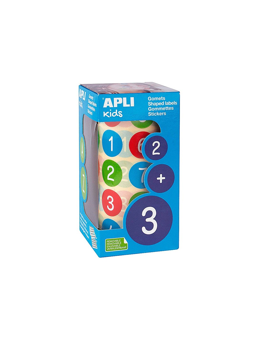 Gomets autoadhesivos precortados, fabricados en adhesivo removible que permite despegar sin dejar rastro. Números en colores surtidos. Incluye signos matemáticos como suma, resta e igual. Diámetro: 20 mm. Cantidad por rollo: 900 gomets.