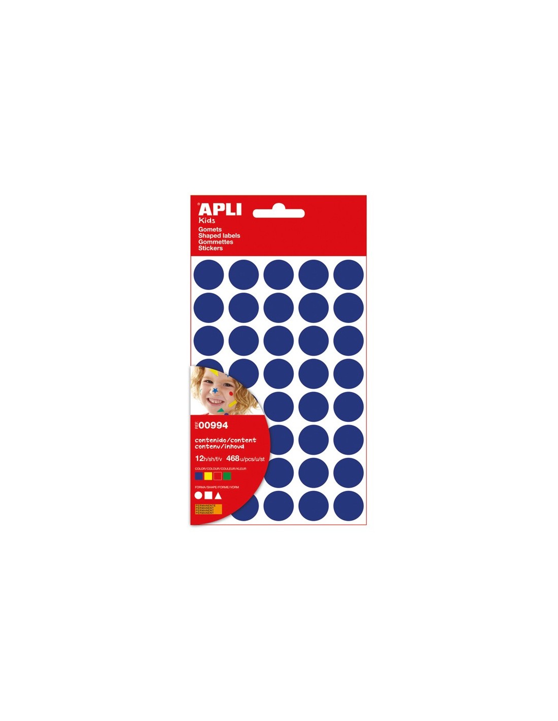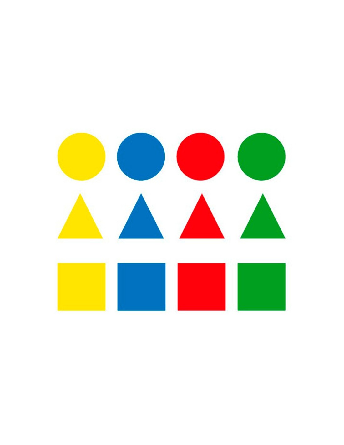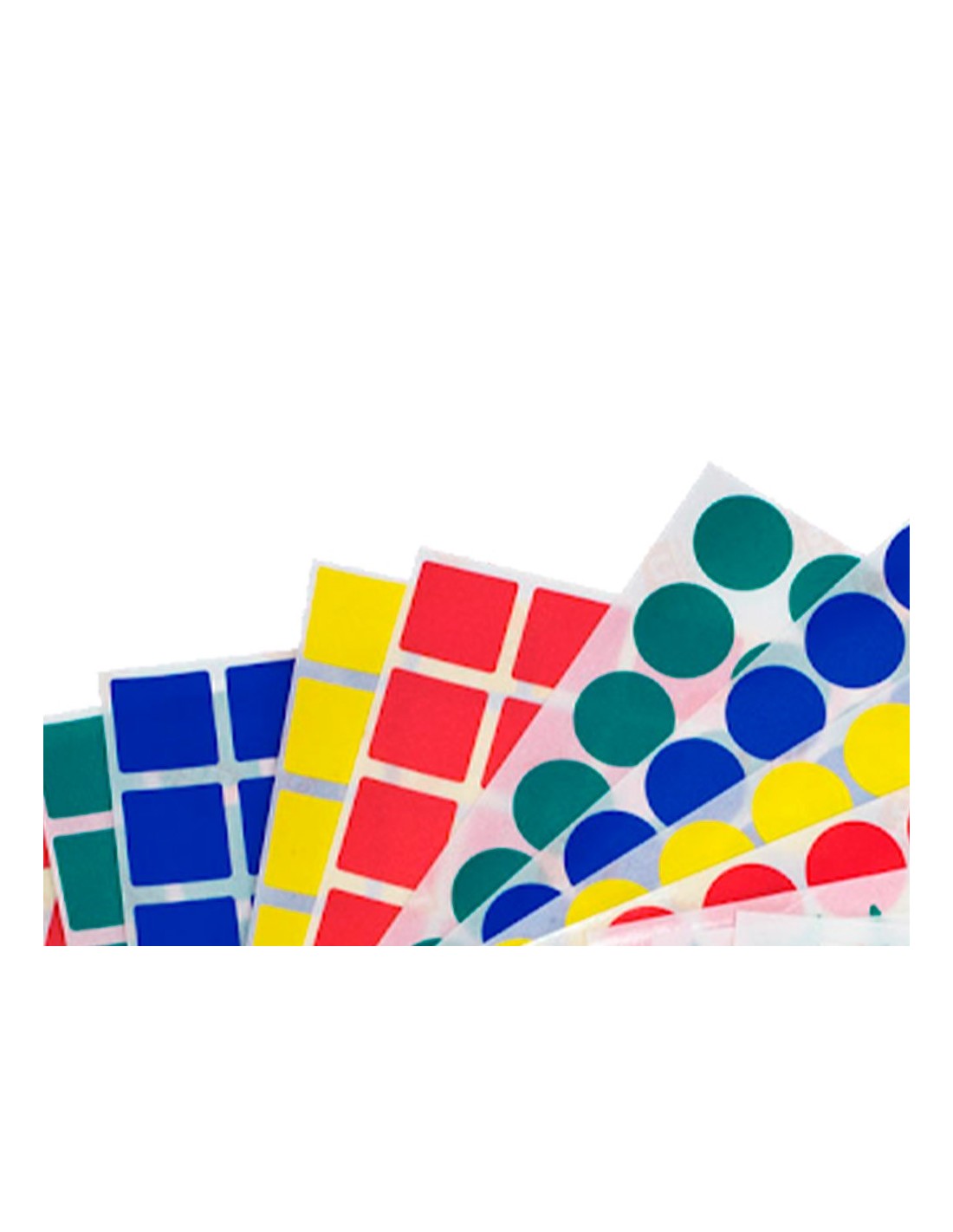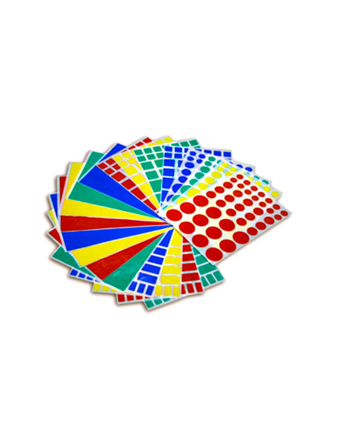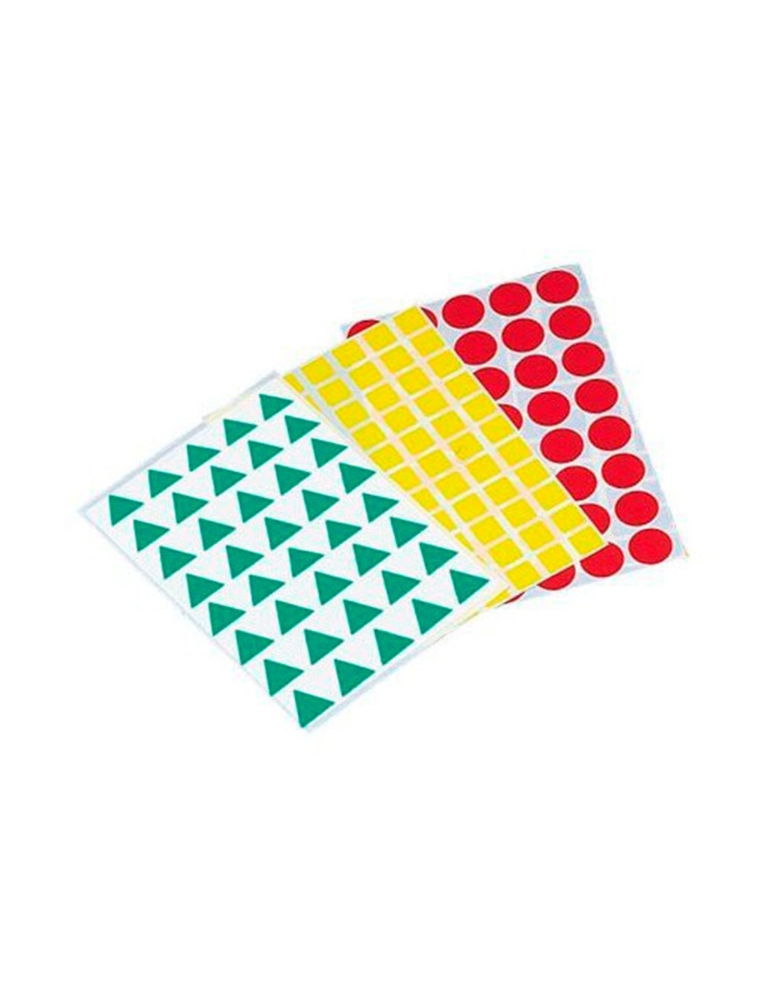 Etiquetas de diferentes formas geométricas en tamaño grande. Cículos: 19 mm. Triángulos: 26 mm. Cuadradros: 19 mm. Colores surtidos: amarillo, azul, rojo y verde. 351 gomets. La bolsa de 12 hojas.