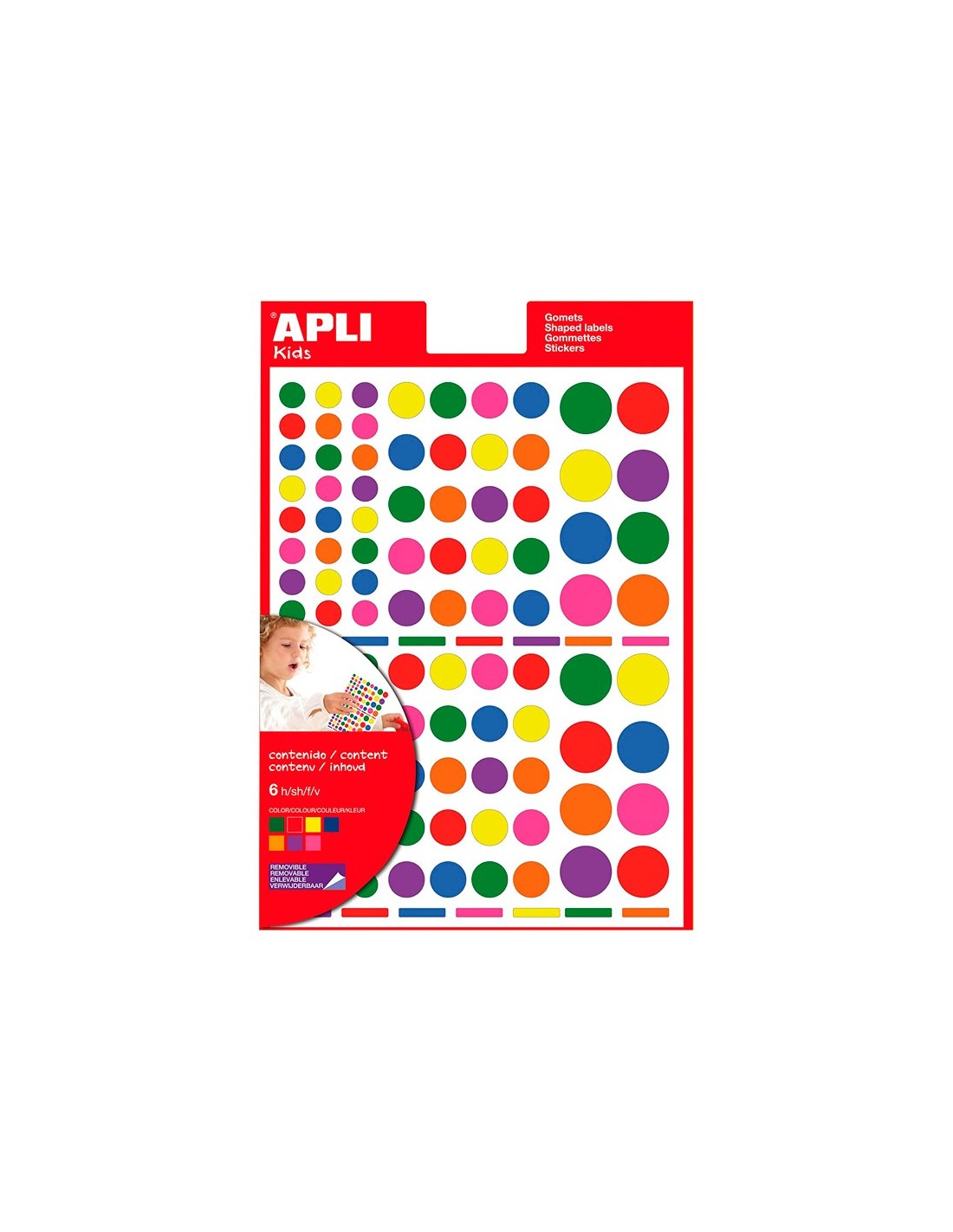 Etiquetas autoadhesivas multicolor en diferentes formas: cuadrados, círculos y triángulos. Tamaños variados para que los niños se diviertan y hagan volar su imaginación. El blíster de 6 hojas.