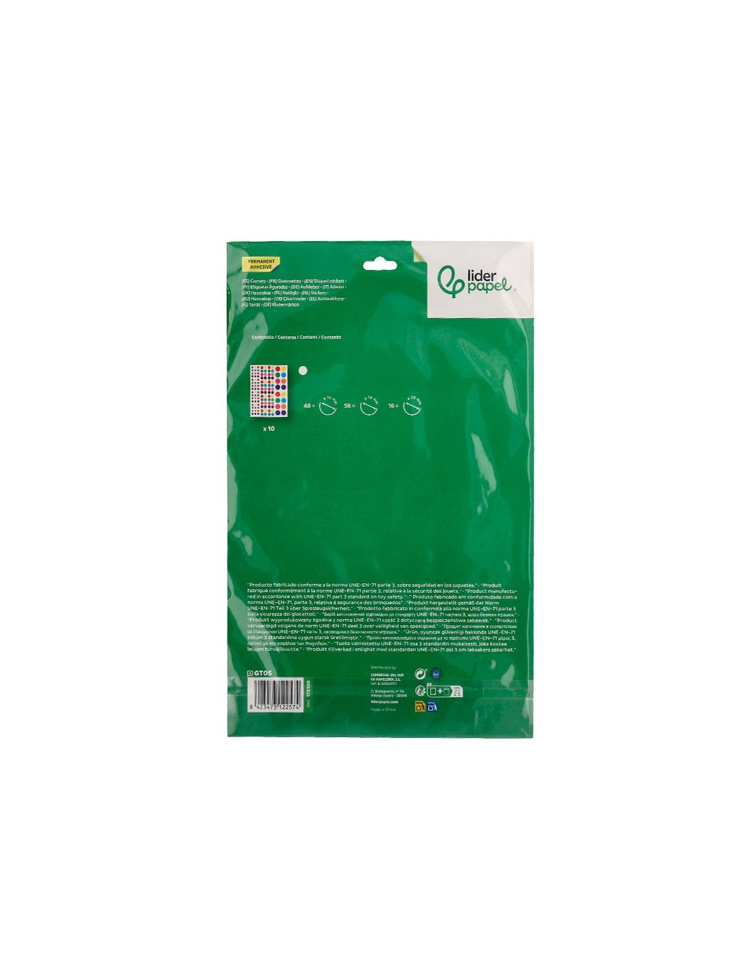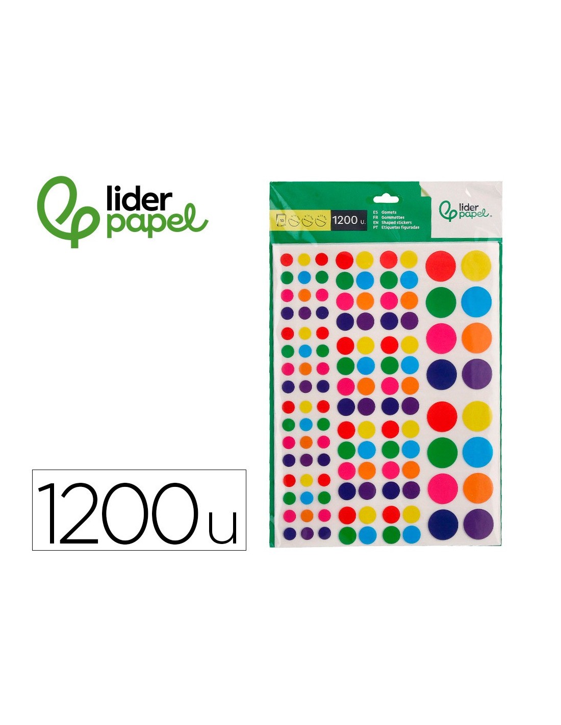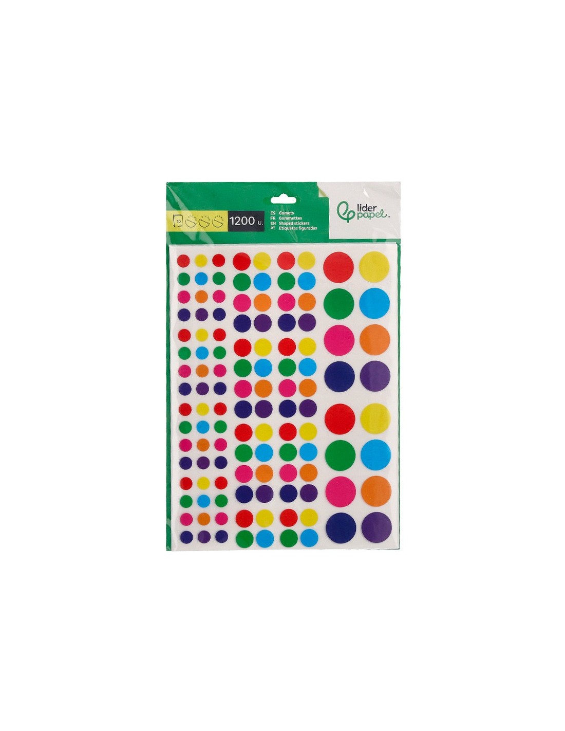 GOMETS AUTOADHESIVOS DE LIDERPAPEL, INCLUYE 1200 GOMETS EN 10 HOJAS DE 24X18 CM, CON CÍRCULOS EN TAMAÑOS Y COLORES SURTIDOS. SON TRES TAMAÑOS: 480 GOMETS Ø 10 MM, 560 GOMETS Ø 14 MM Y 160 GOMETS Ø 20 MM, PERMITIENDO UNA AMPLIA VARIEDAD DE APLICACIONES EN PROYECTOS ESCOLARES Y MANUALIDADES. ESTOS GOMETS AUTOADHESIVOS SON PERFECTOS PARA DECORAR, ETIQUETAR Y ORGANIZAR, PROPORCIONANDO UNA FORMA DIVERTIDA Y PRÁCTICA DE ESTIMULAR LA CREATIVIDAD Y HABILIDADES MOTRICES EN NIÑOS. CADA HOJA ESTÁ CUIDADOSAMENTEDISEÑADA PARA OFRECER UN SURTIDO DE COLORES VIBRANTES Y TAMAÑOS VARIADOS QUE SE ADAPTAN A DIVERSAS NECESIDADES CREATIVAS Y EDUCATIVAS.