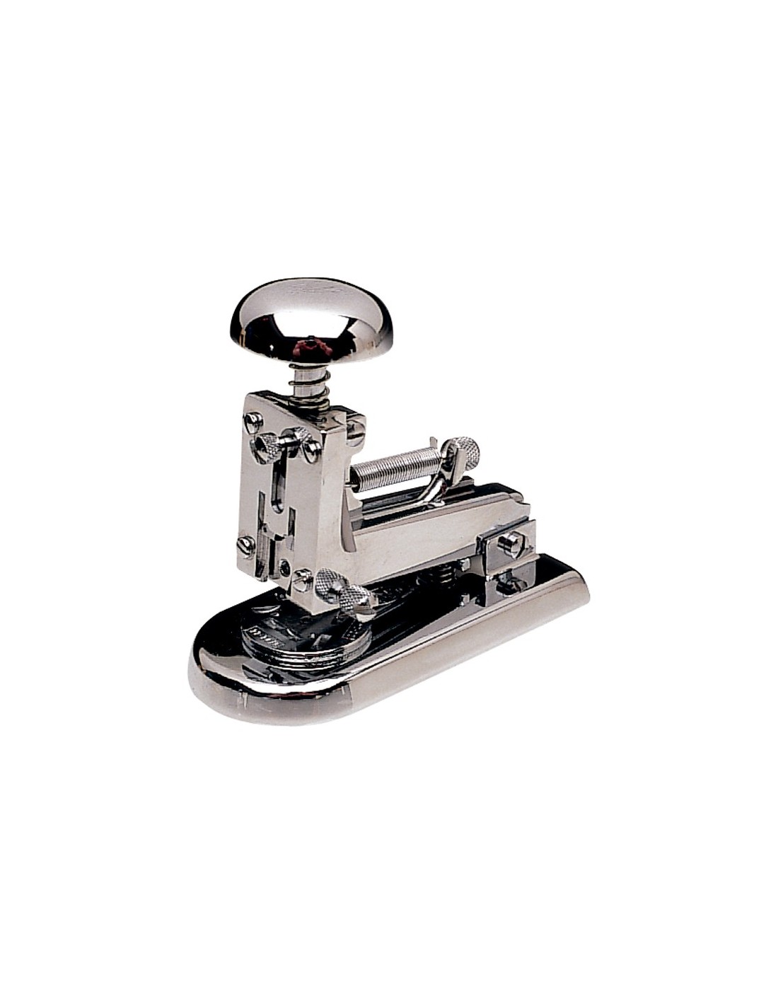 Fabricada en acero cromado. Usa grapas nº 22/6 y 24/6. Longitud del grapado a 50 mm del borde de la hoja. Carga 1 peine (50 grapas). Capacidad de grapado: 25 hojas. Carga trasera. Fácilmente desmontable, con tornillo antiatasco. Color cromado. Longitud de la base: 103 mm. Medidas: 51 x 95 x 115 mm.