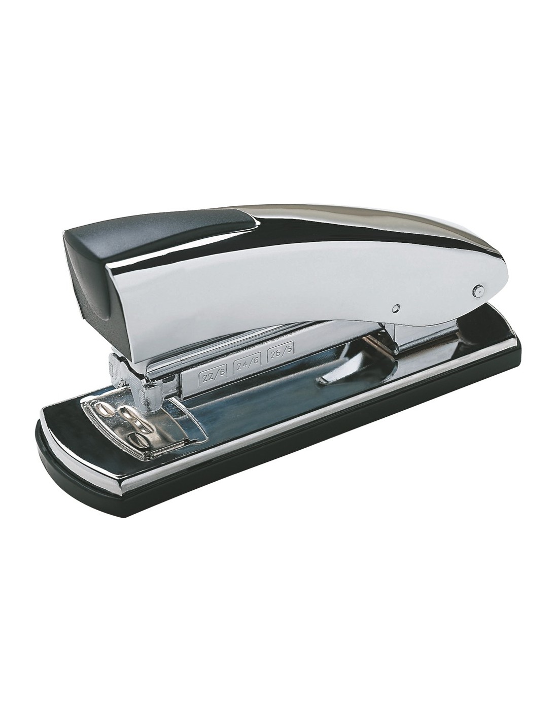 Metálica cromada. Longitud del grapado a 72 mm del borde de la hoja. Carga 2 peines (100 grapas) nº 22/6, 24/6 y 26/6. Con base plástica antideslizante. Con cargador frontal doble guía antiatascos. Incorpora el grapado PGT (Paper Grip Tecnology) para un grapado siempre perfecto. Longitud de la base: 135 mm. Medidas: 50 x 70 x 150 mm.