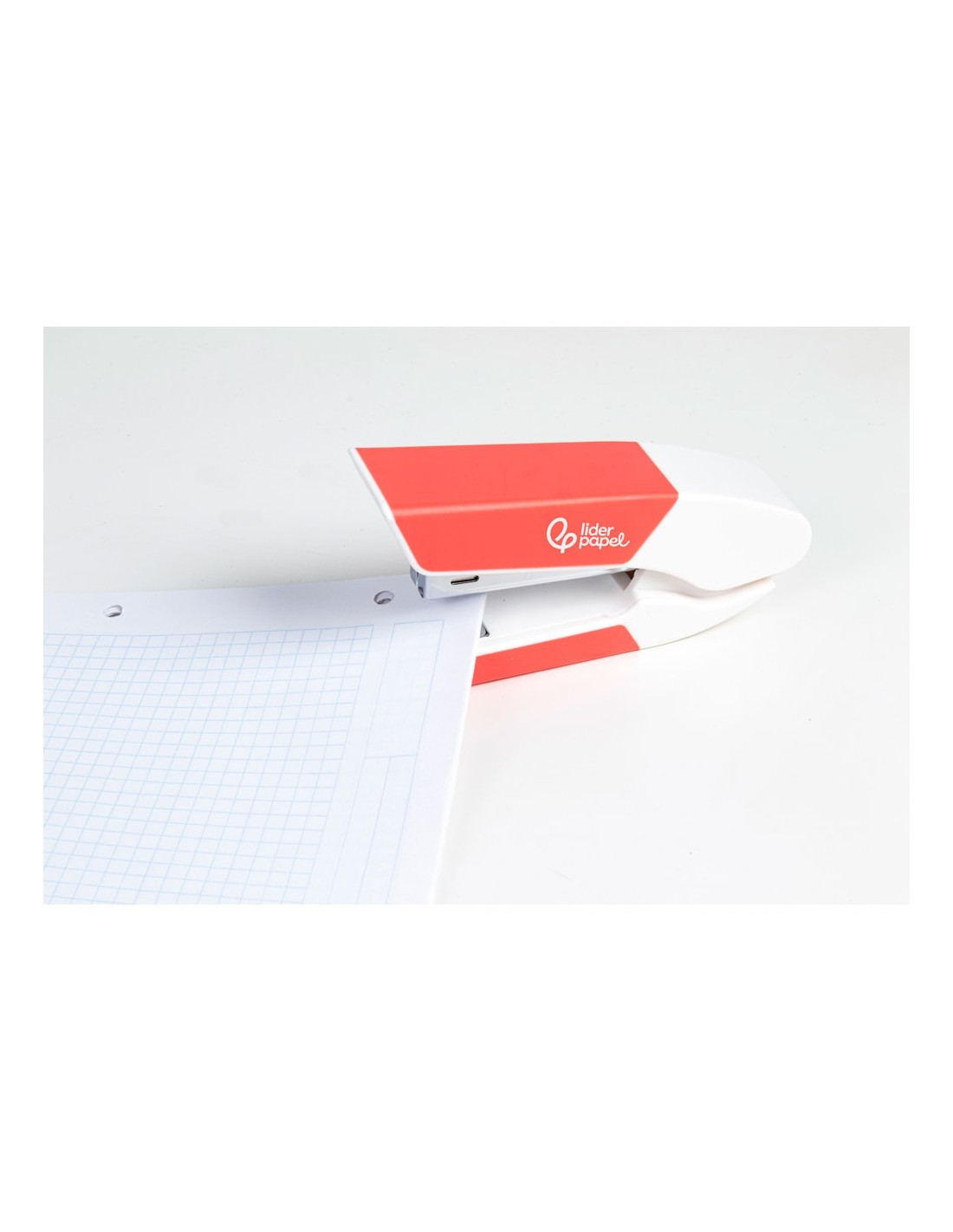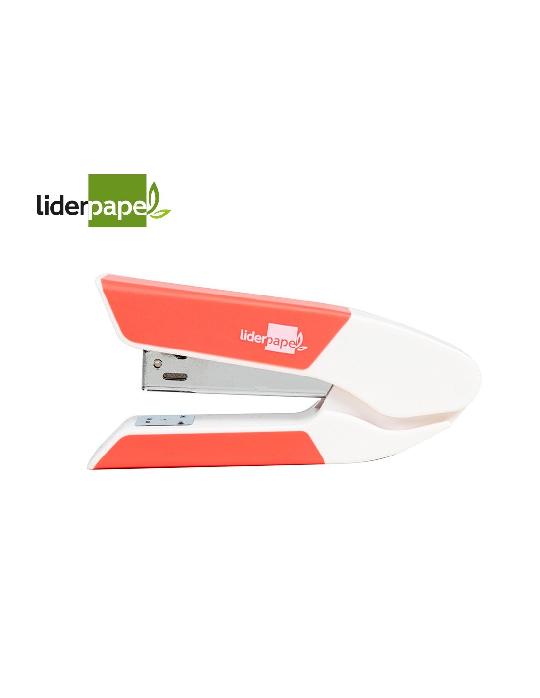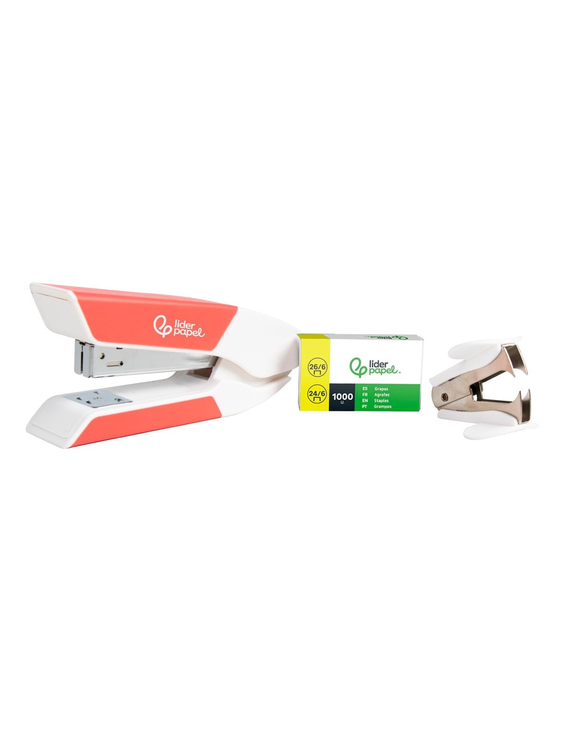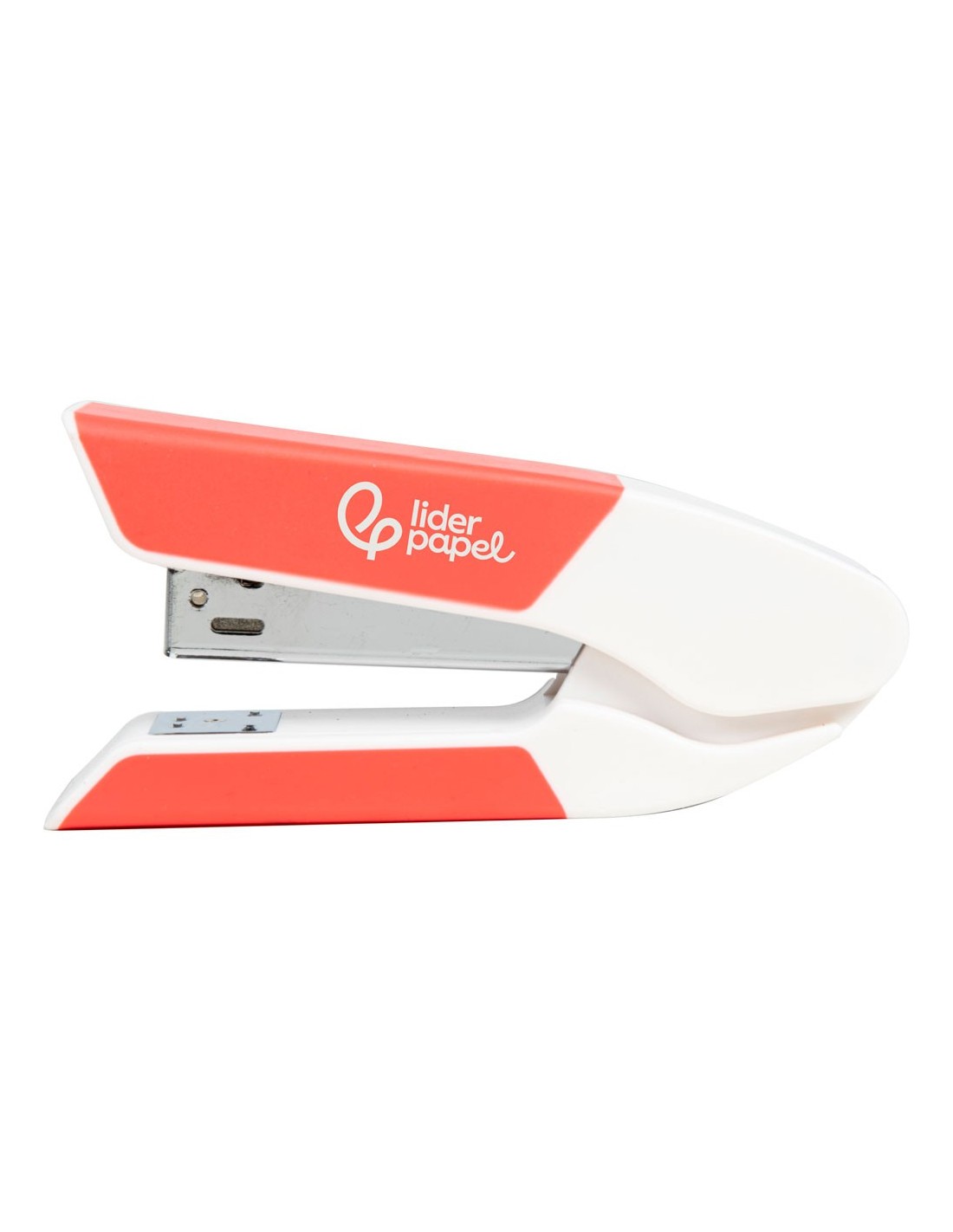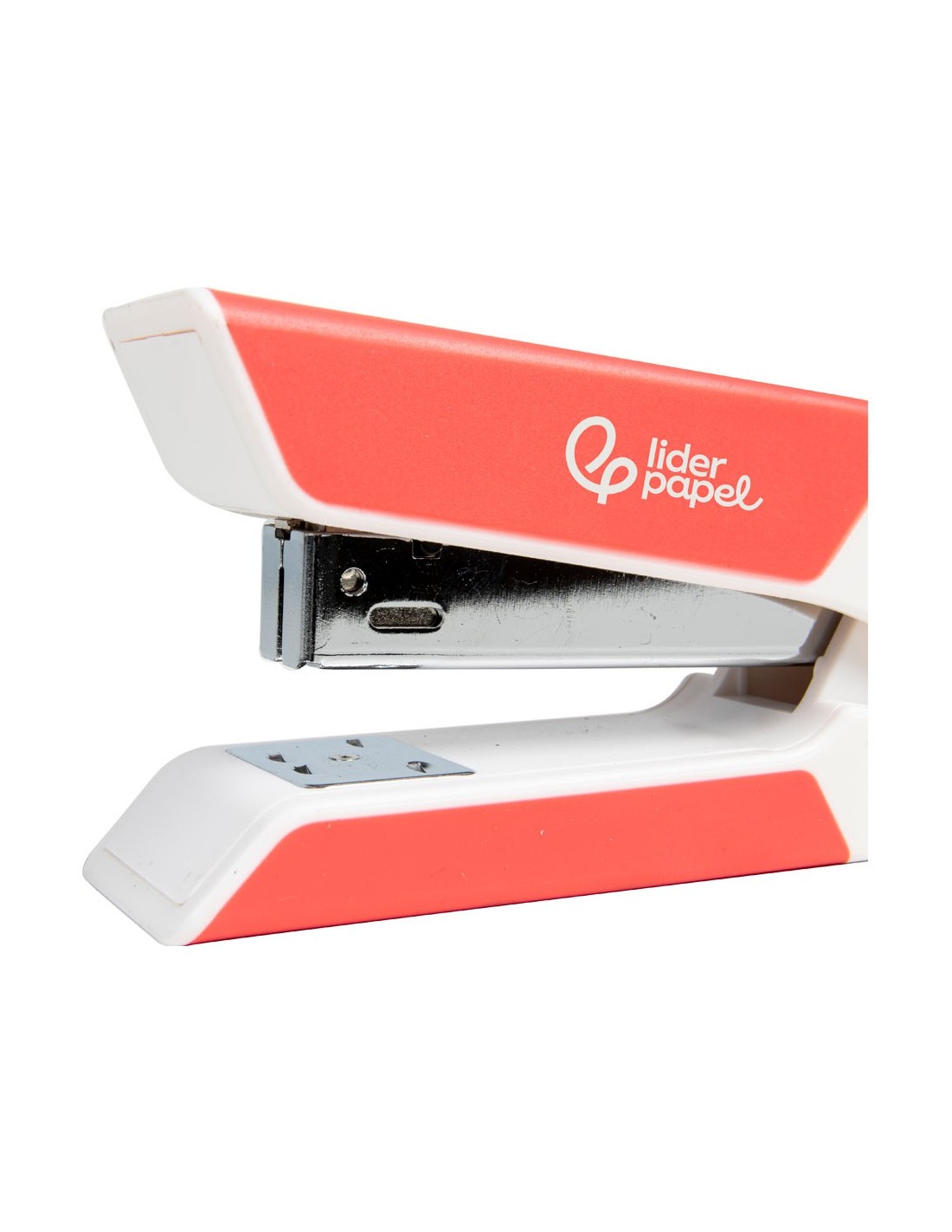 Grapadora fabricada en plástico con mecanismo metálico. Usa grapas 26/6. Longitud del grapado a 60 mm del borde de la hoja. Carga 2 peines (100 grapas). Incluye una caja de 1 000 grapas y un extraegrapas. Colores surtidos: coral, gris y turquesa. Longitud de la base: 130 mm. Medidas: 35 x 65 x 130 mm.
