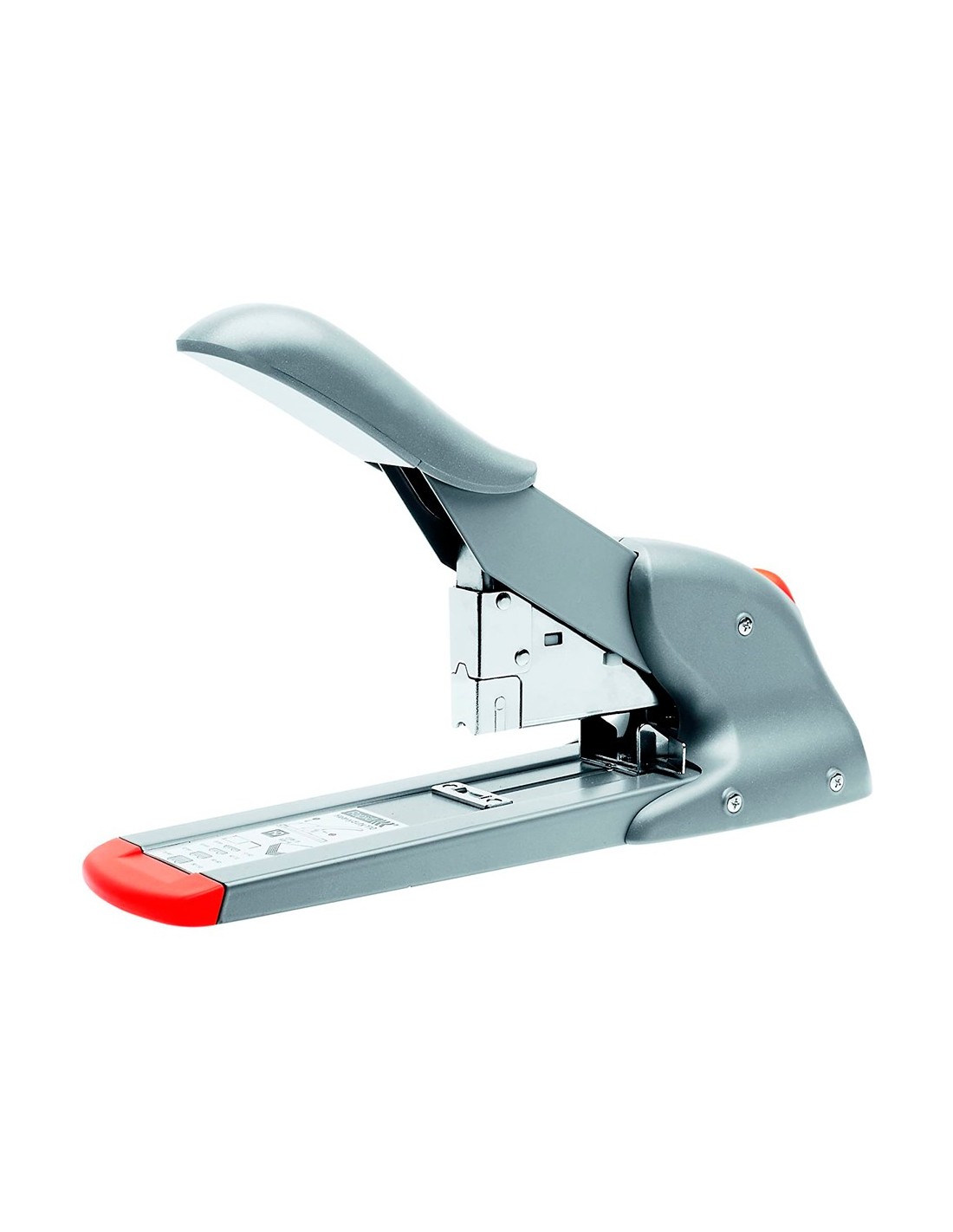 Robusta grapadora de carga frontal, con mecanismo de palanca para una gran capacidad de grapado. Ideal para servicios postales y oficinas. Capacidad de grapado de 110 hojas. Utiliza grapas 23/8-15 y 9/8-14. Profundidad de grapado: 66 mm. Color plata/naranja. Medidas: 100 x 154 x 325 mm.