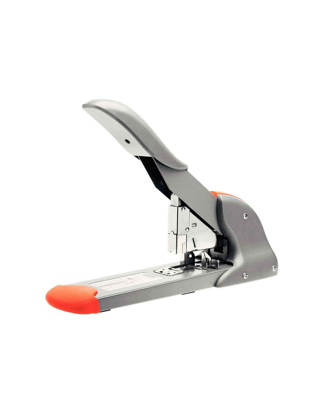 Fabricada en acero. Carga frontal. Con mecanismo de palanca para grandes pilas de papel. Ideal para servicios postales e imprentas. Grapa hasta 210 hojas. Usa grapas 23/8, 24/8, 24/9. Profundidad de grapado: 66 mm. Color combinado plata/naranja. Medidas: 117 x 210 x 387 mm.