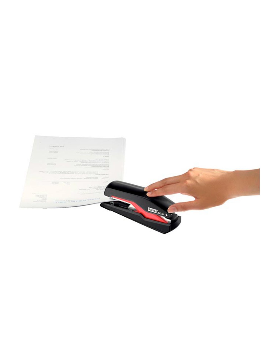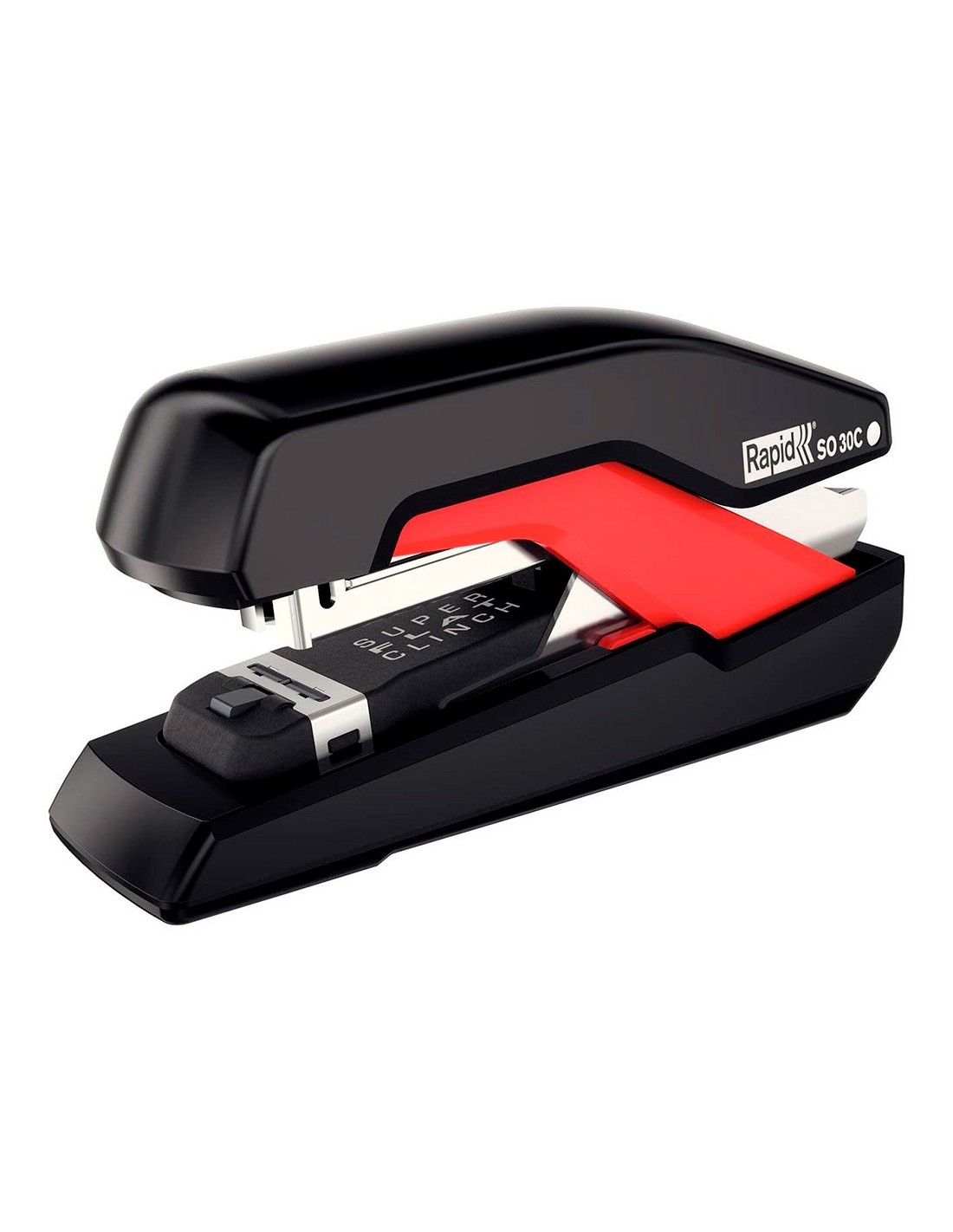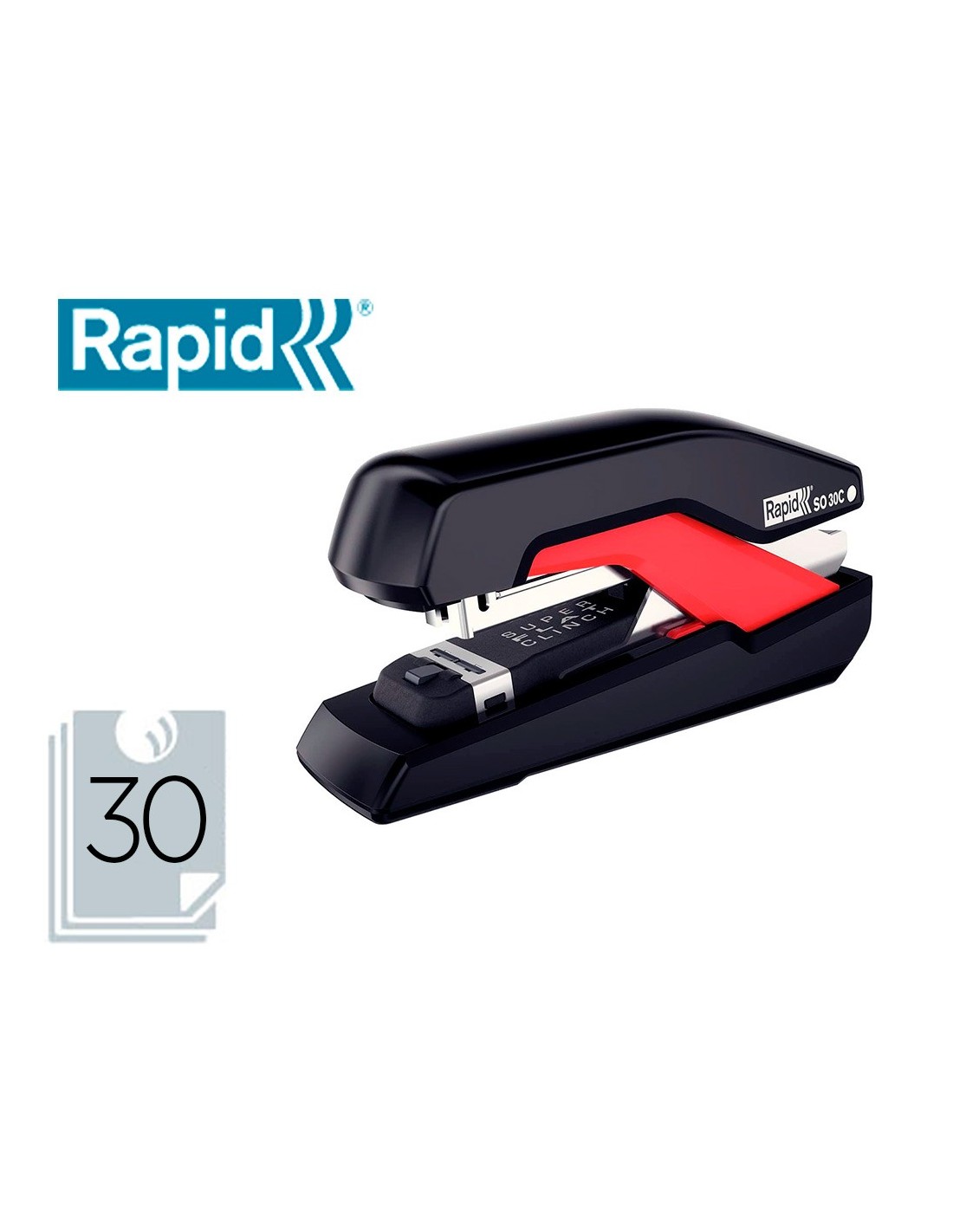 Grapa sin esfuerzo. Puede ser presionada desde cualquier punto de su tapa y grapar sin esfuerzo tanto sobre la mesa como en la mano. La tecnología SuperFlatClinch patentada reduce el volumen de papel apilado en un 40%. Grapa hasta 30 hojas de 80 g/m². Carga superior para una fácil recarga. Para grapas Rapid Omnipress 30. Medidas: 39 x 69 x 134 mm.