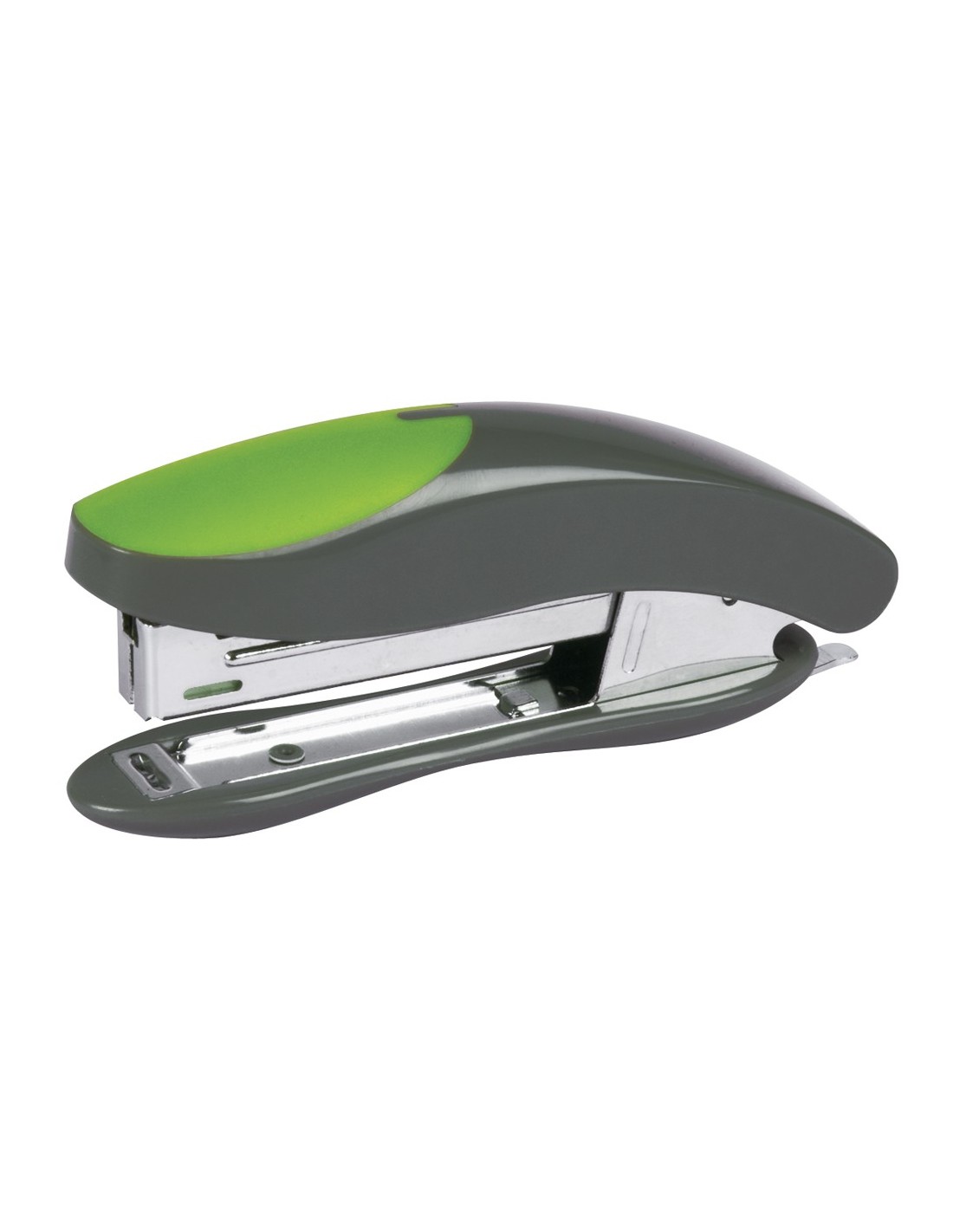 Grapadora de plástico gris y verde con mecanismo metálico. Usa grapas nº 10. Longitud del grapado al borde de la hoja: 55 mm. Carga 2 peines (100 grapas). Superficie verde de caucho antideslizante. Con extraegrapas trasero. Longitud de la base: 105 mm. Medidas: 24 x 45 x 105 mm.