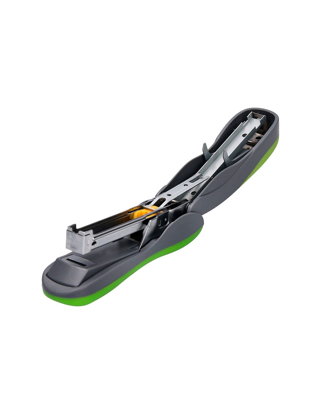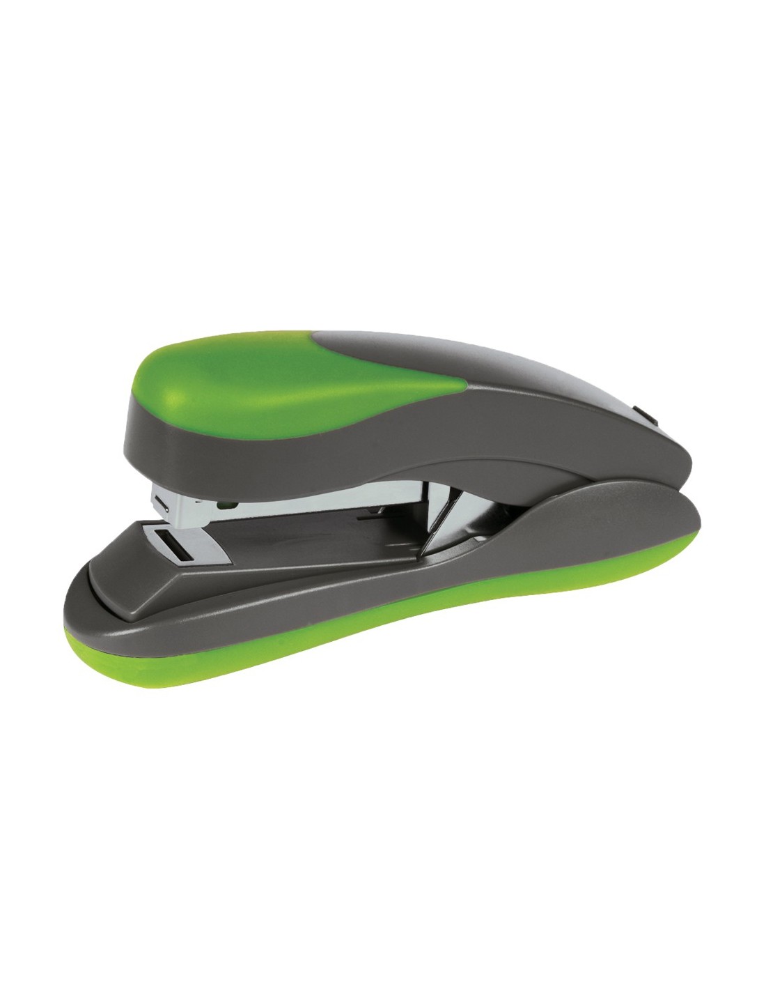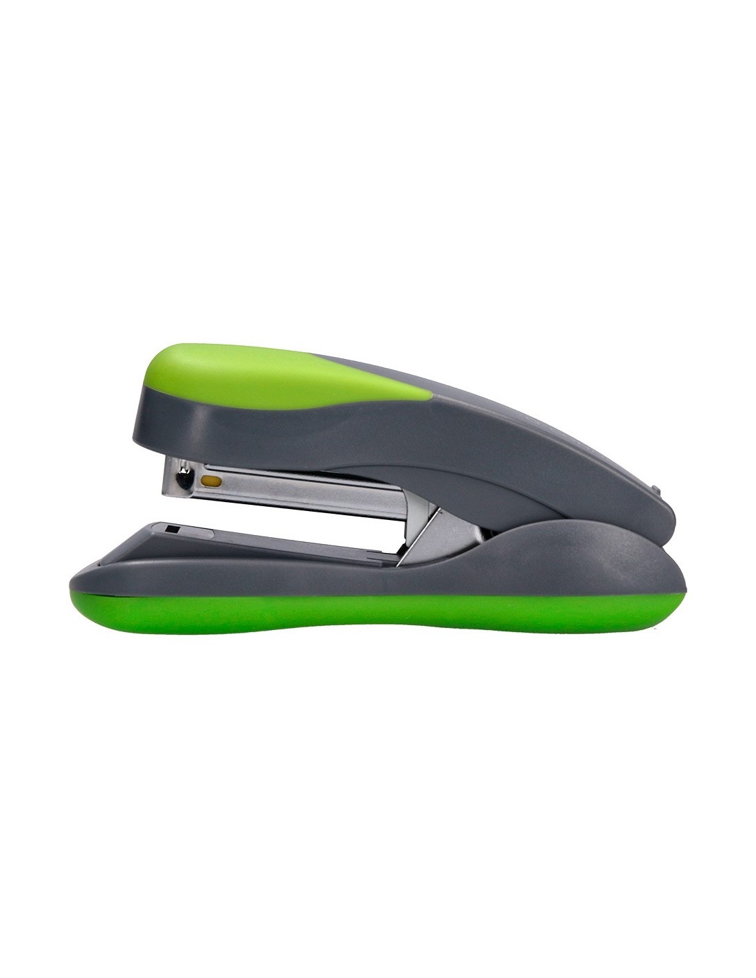 Grapadora de plástico verde y gris con mecanismo metálico. Usa grapas de 22/6, 24/6 y 26/6. Longitud del grapado al borde de la hoja: 55 mm. Carga 3 peines (150 grapas). Grapado cerrado plano. Superficie verde de caucho antideslizante. Longitud de la base: 147 mm. Medidas: 43 x 68 x 147 mm.