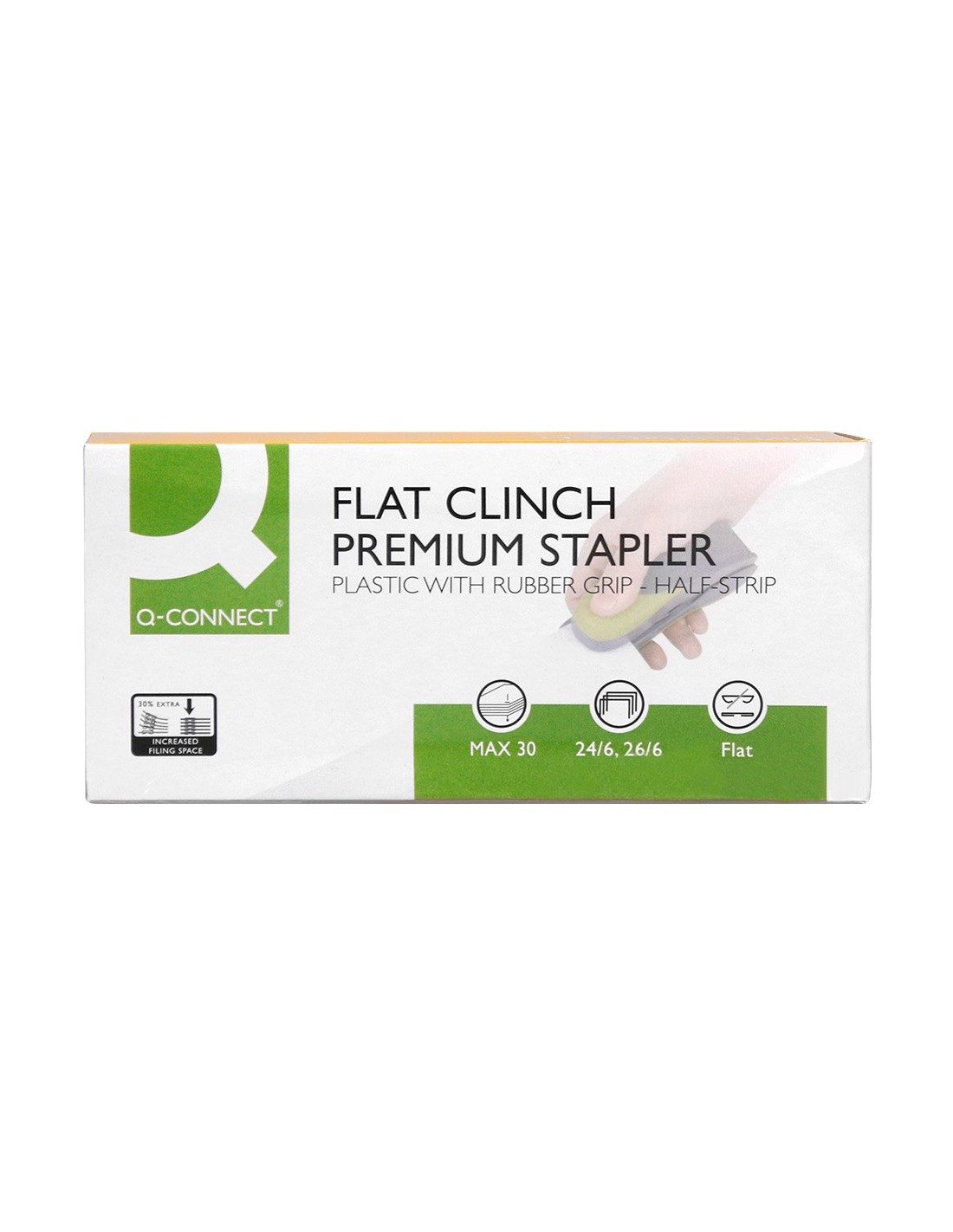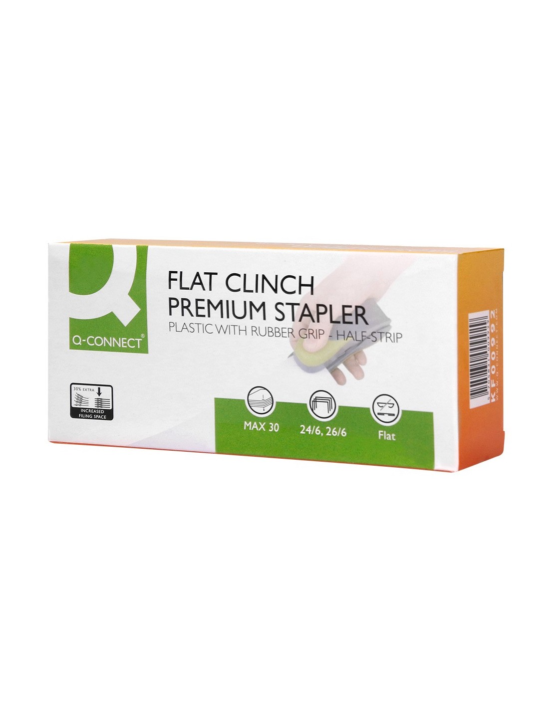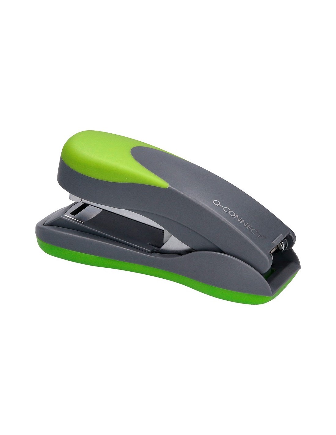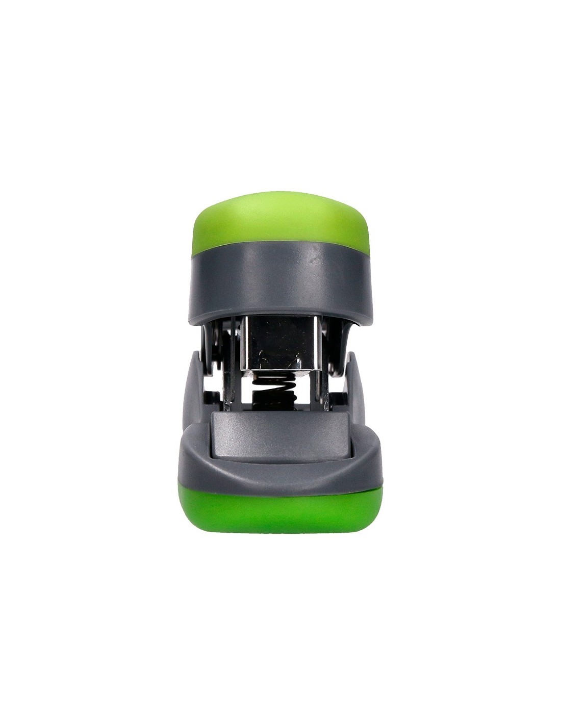 Grapadora de plástico verde y gris con mecanismo metálico. Usa grapas de 22/6, 24/6 y 26/6. Longitud del grapado al borde de la hoja: 55 mm. Carga 3 peines (150 grapas). Grapado cerrado plano. Superficie verde de caucho antideslizante. Longitud de la base: 147 mm. Medidas: 43 x 68 x 147 mm.