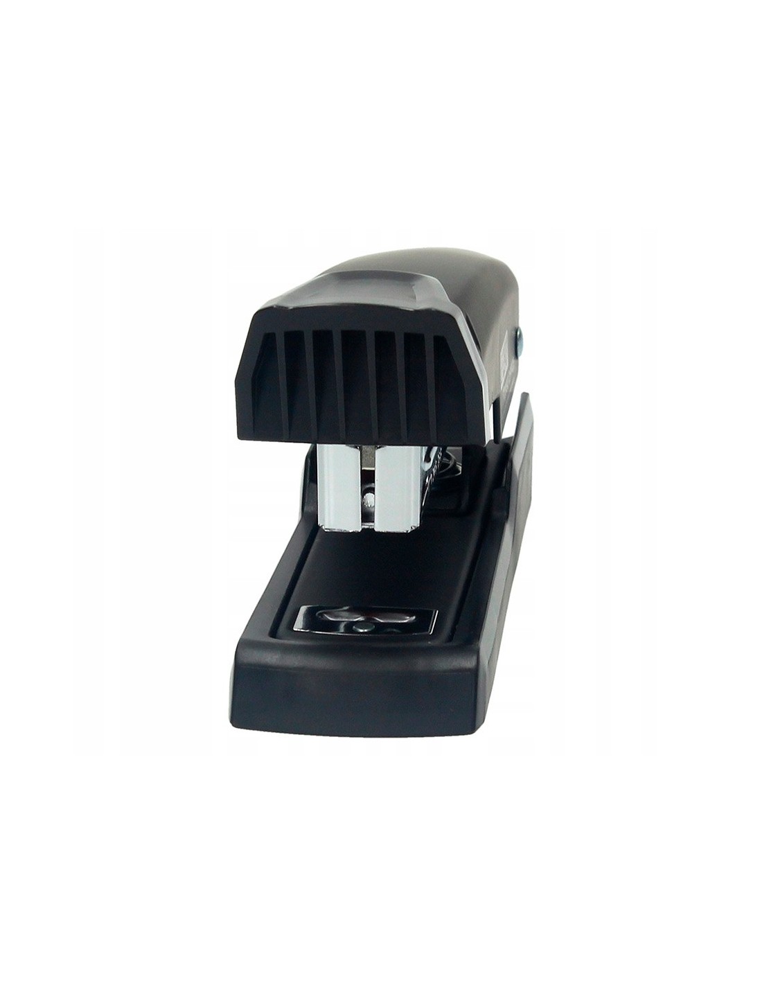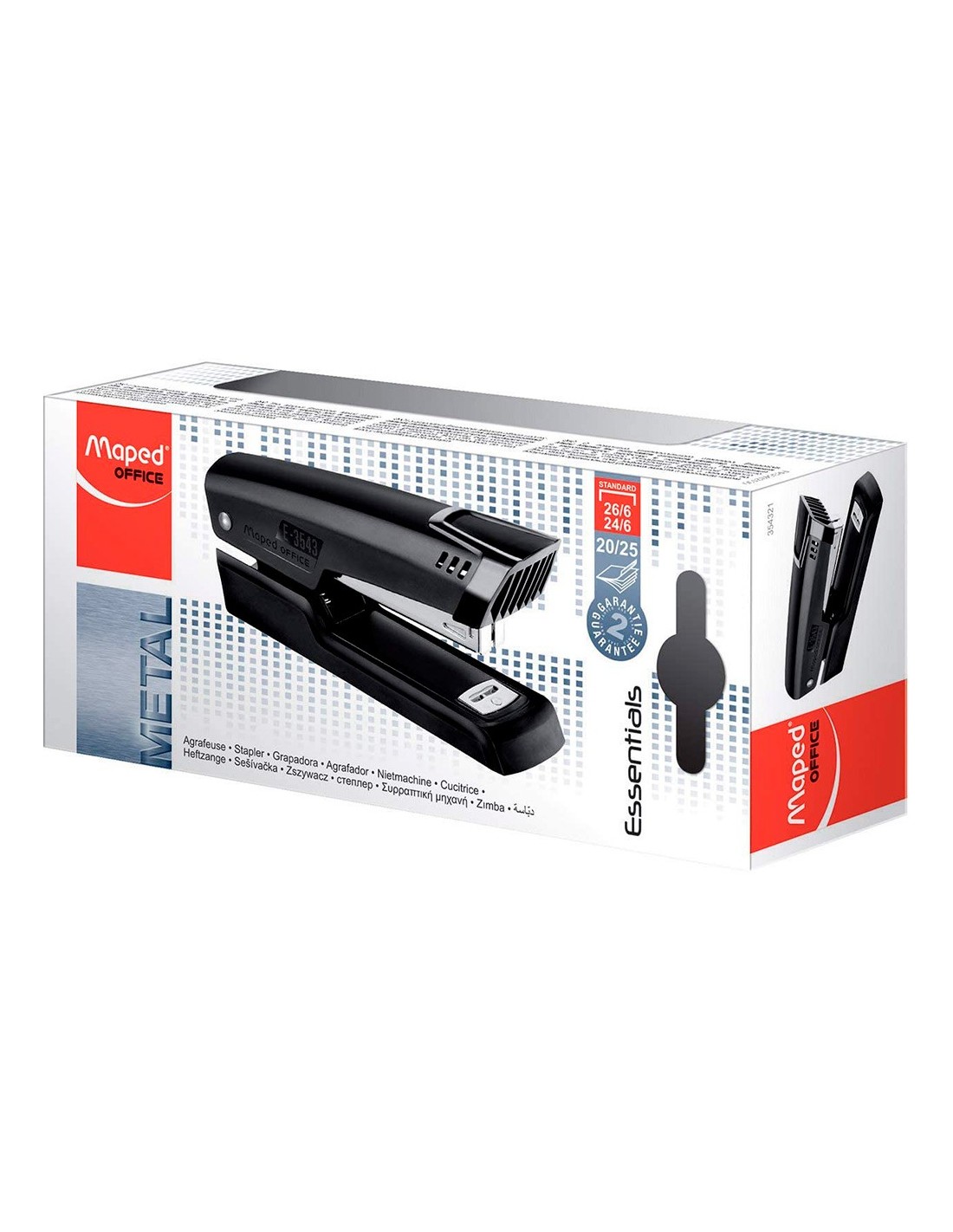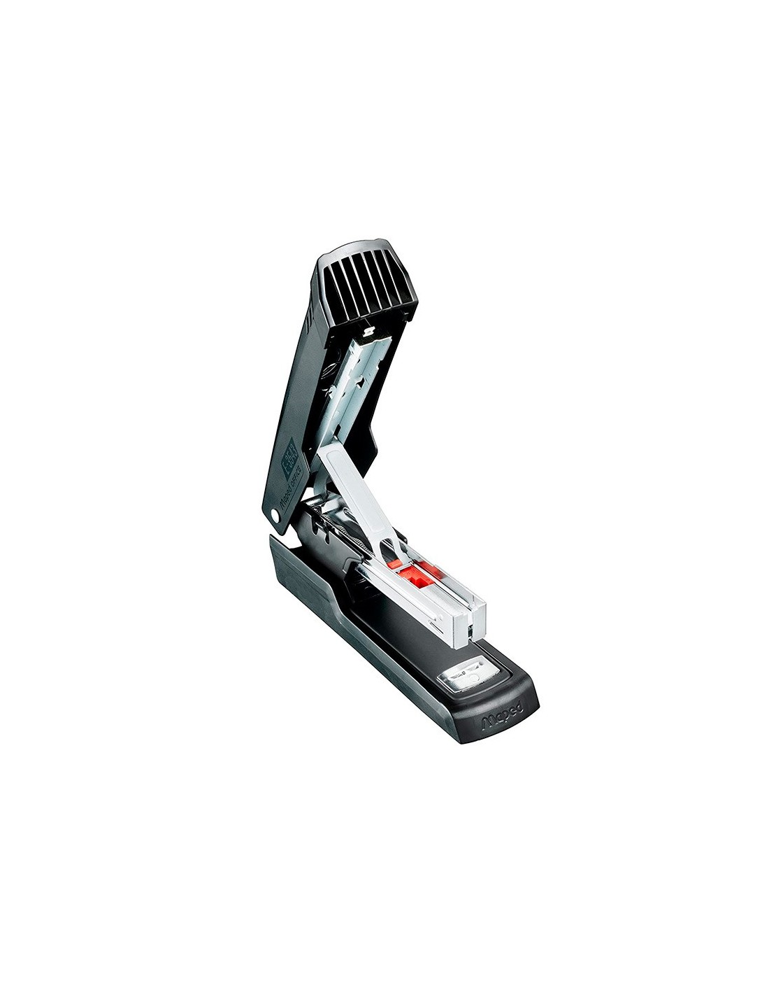 Grapadora metálica. Color negro. Con visualización de la reserva de grapas. Realiza 2 funciones: grapado y clavado. Usa grapas 24/6 y 26/6. Capacidad de carga: 100 grapas 24/6 ó 140 grapas 26/6. Carga superior. Capacidad de grapado hasta 25 hojas. Profundidad de grapado: 61 mm. Longitud de la base: 120 mm. Medidas: 32 x 62 x 120 mm.
