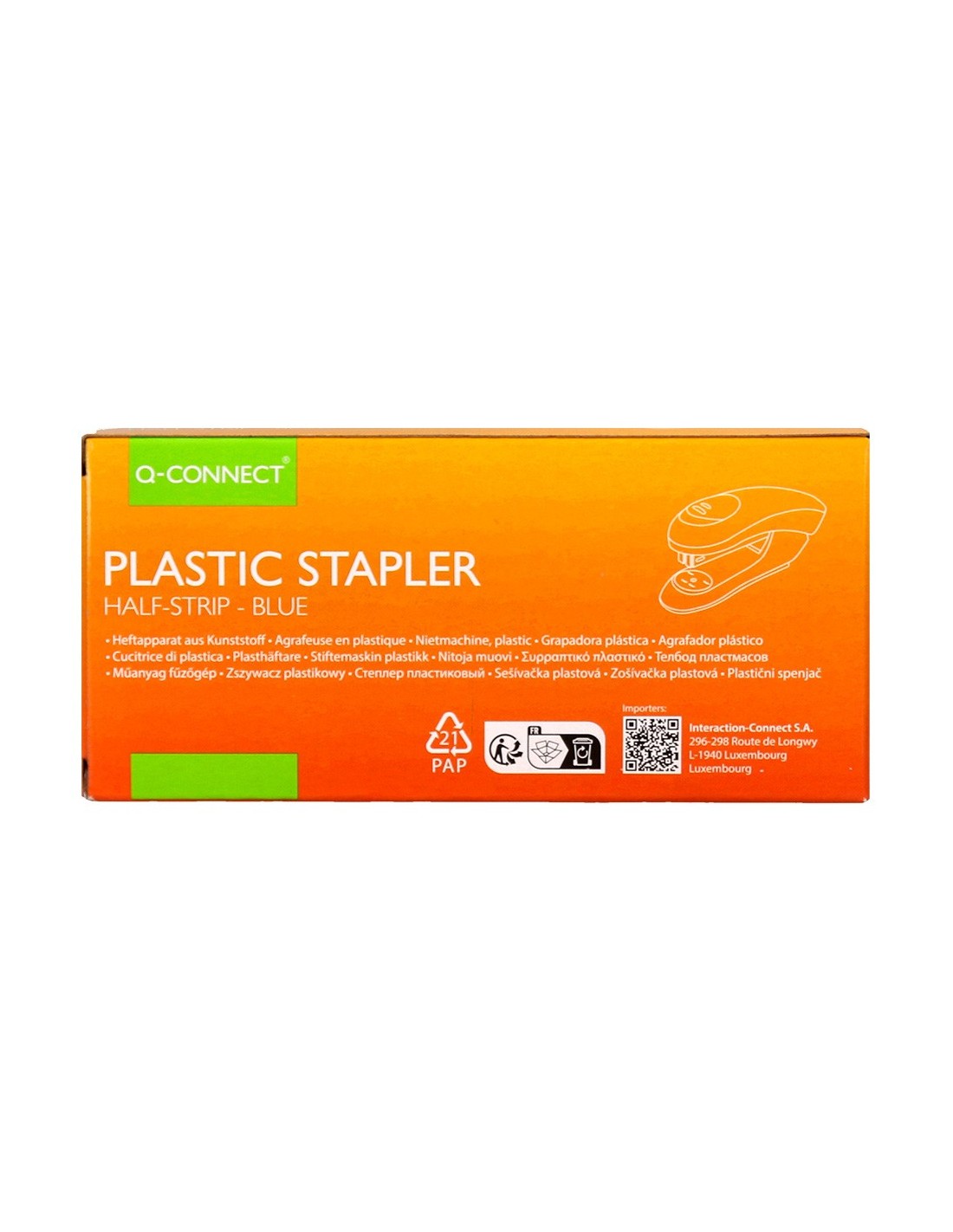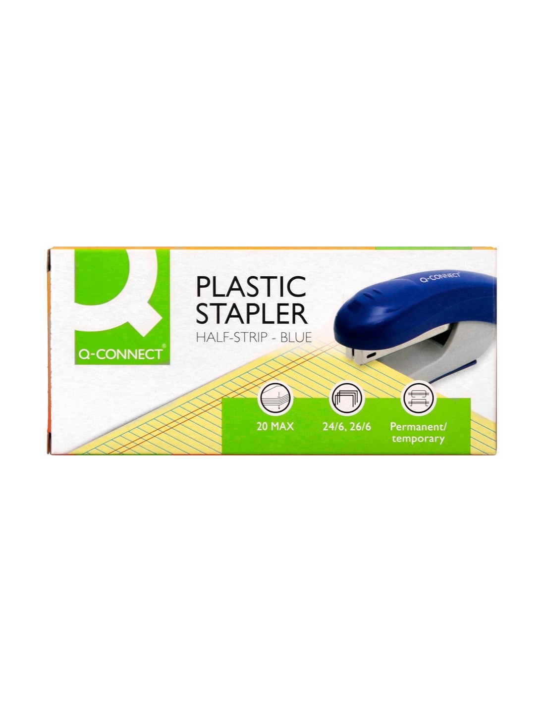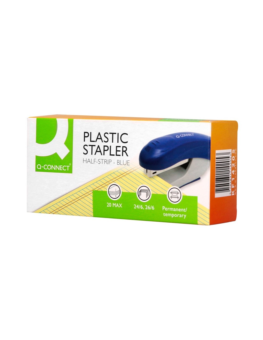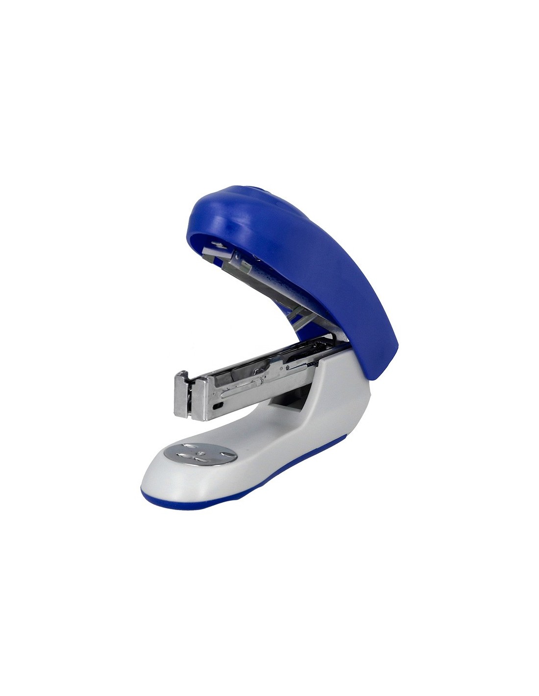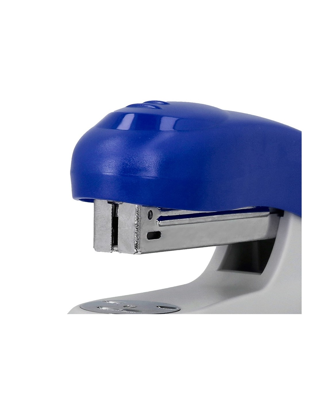 Grapadora de plástico ABS con mecanismo metálico. Usa grapas nº 24/6 y 26/6. Carga 2 peines (100 grapas). Longitud del grapado a 55 mm del borde de la hoja. Longitud de la base: 141 mm. Medidas: 39 x 65 x 141 mm. Color azul.