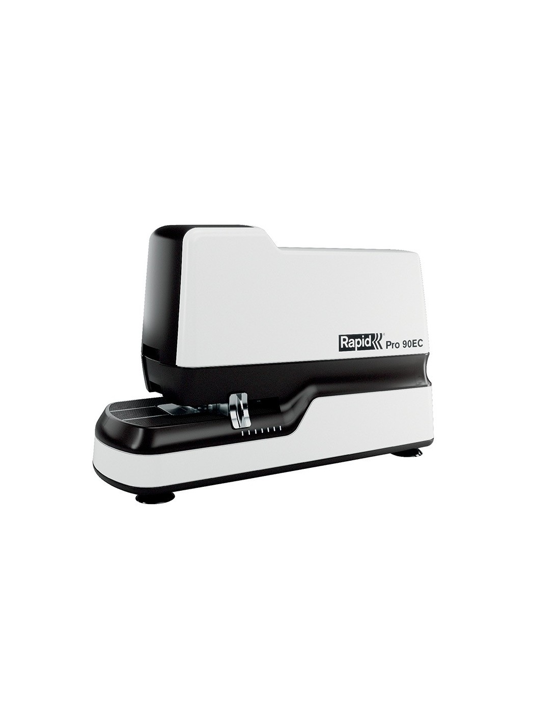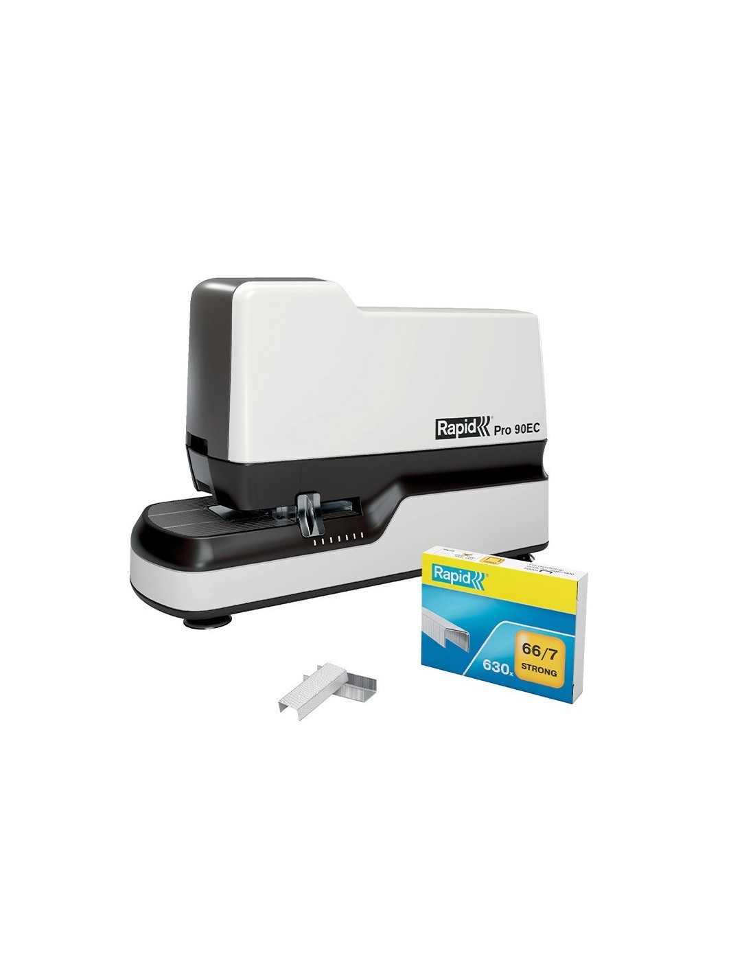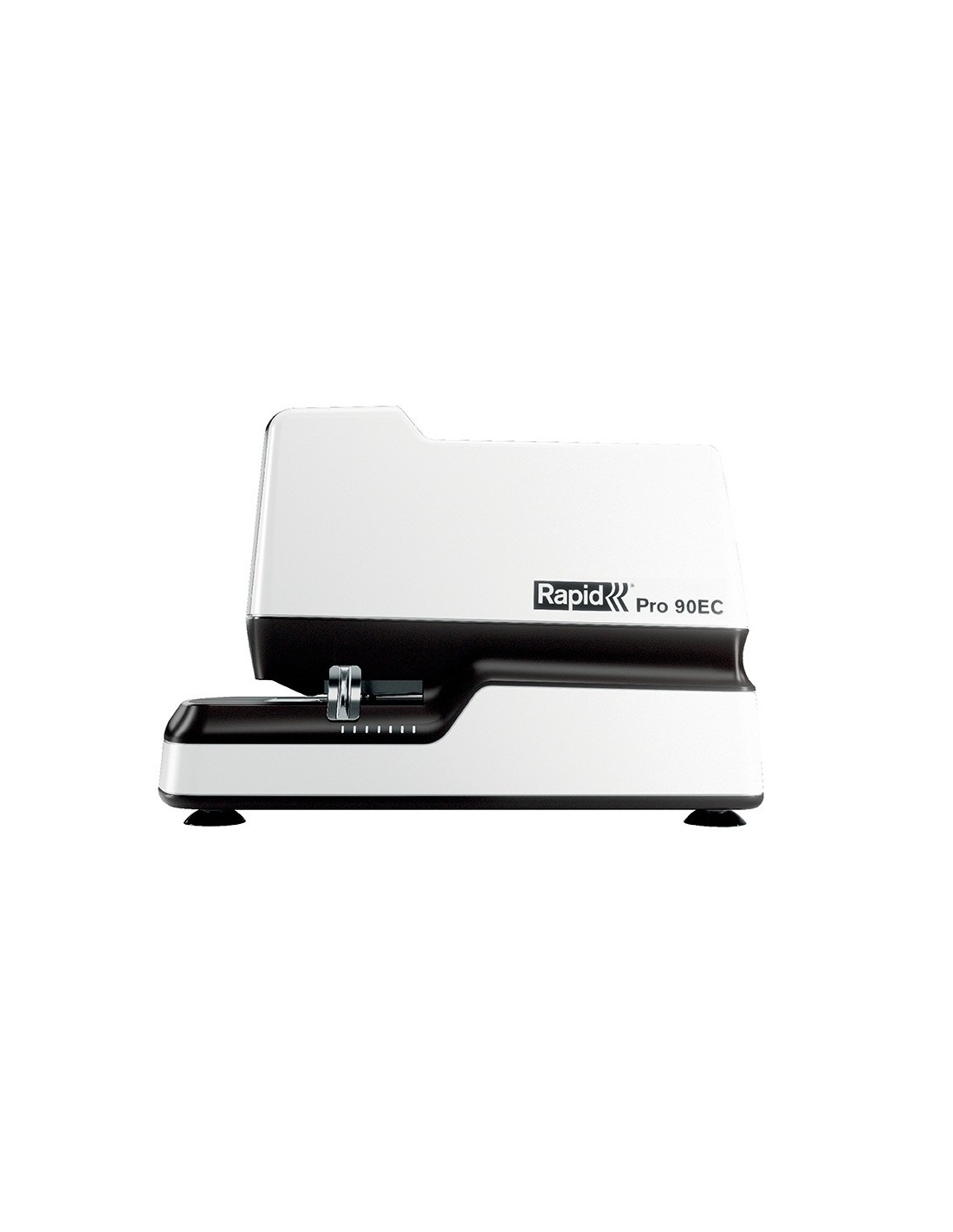 La grapadora eléctrica Pro 90EC permite grapar a alta velocidad y sin esfuerzo hasta 50 hojas de papel a la vez (80 g/m²), ahorrándole tiempo en el trabajo. Esta grapadora Fullstrip de alta capacidad, es totalmente automática y resulta ideal para un uso intensivo en oficinas o entornos industriales. La 90EC grapa 3 veces más rápido que, por ejemplo, la grapadora eléctrica Rapid 5050e, a la vez que ajusta automáticamente la fuerza de grapado. La profundidad de inserción del papel ajustable y la guía de colocación de grapas impresa permiten una colocación flexible pero precisa de las grapas. Nunca te quedarás sin grapas gracias a la luz LED indicadora de grapas bajas que parpadea cuando se están agotando. Cargador de grapas de fácilcil carga frontal. Garantiza un grapado sin atascos cuando utilices grapasRapid nº 66 o nº 44. Grapado higiénico gracias al uso sin contacto. Las v entosas de goma de la base garantizan una mayor estabilidad sobre una supena. Funciona con un adaptador de corri