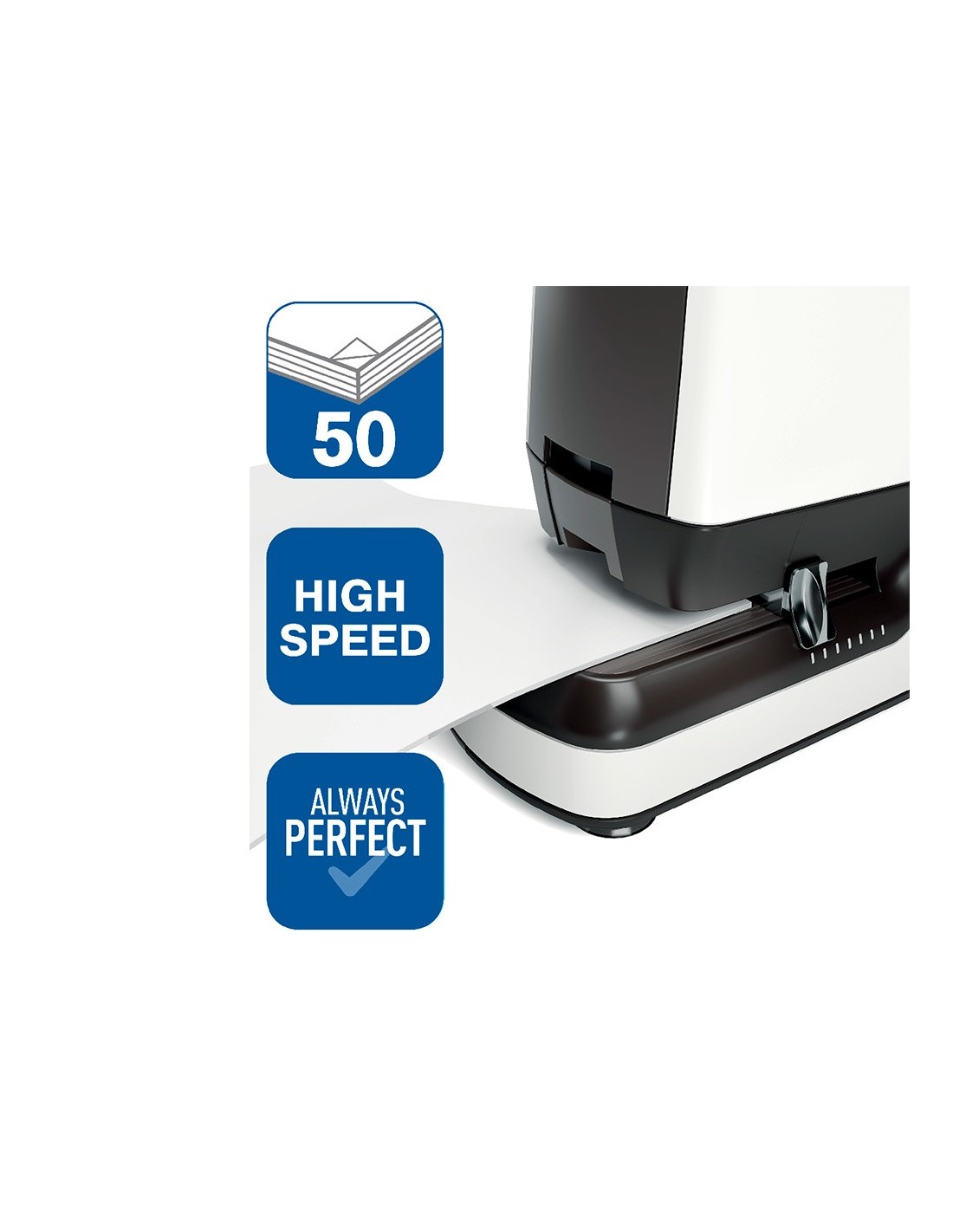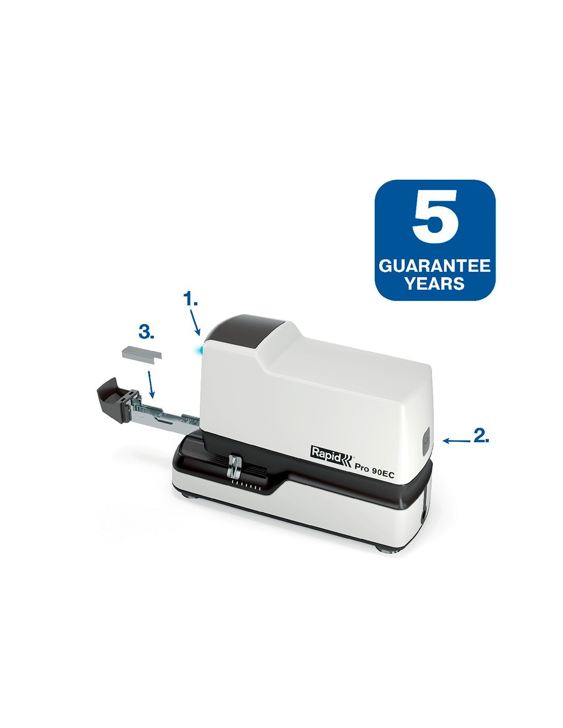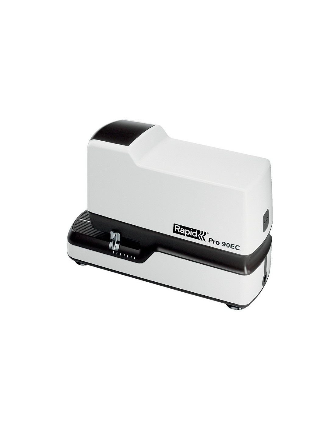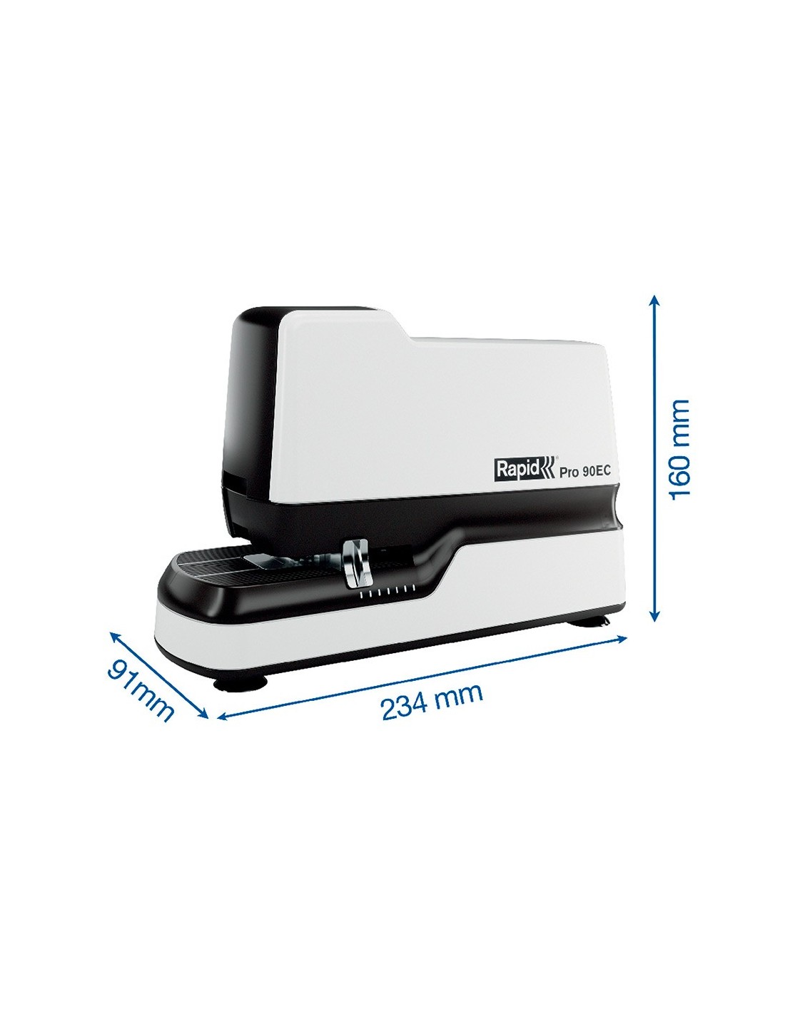 La grapadora eléctrica Pro 90EC permite grapar a alta velocidad y sin esfuerzo hasta 50 hojas de papel a la vez (80 g/m²), ahorrándole tiempo en el trabajo. Esta grapadora Fullstrip de alta capacidad, es totalmente automática y resulta ideal para un uso intensivo en oficinas o entornos industriales. La 90EC grapa 3 veces más rápido que, por ejemplo, la grapadora eléctrica Rapid 5050e, a la vez que ajusta automáticamente la fuerza de grapado. La profundidad de inserción del papel ajustable y la guía de colocación de grapas impresa permiten una colocación flexible pero precisa de las grapas. Nunca te quedarás sin grapas gracias a la luz LED indicadora de grapas bajas que parpadea cuando se están agotando. Cargador de grapas de fácilcil carga frontal. Garantiza un grapado sin atascos cuando utilices grapasRapid nº 66 o nº 44. Grapado higiénico gracias al uso sin contacto. Las v entosas de goma de la base garantizan una mayor estabilidad sobre una supena. Funciona con un adaptador de corri