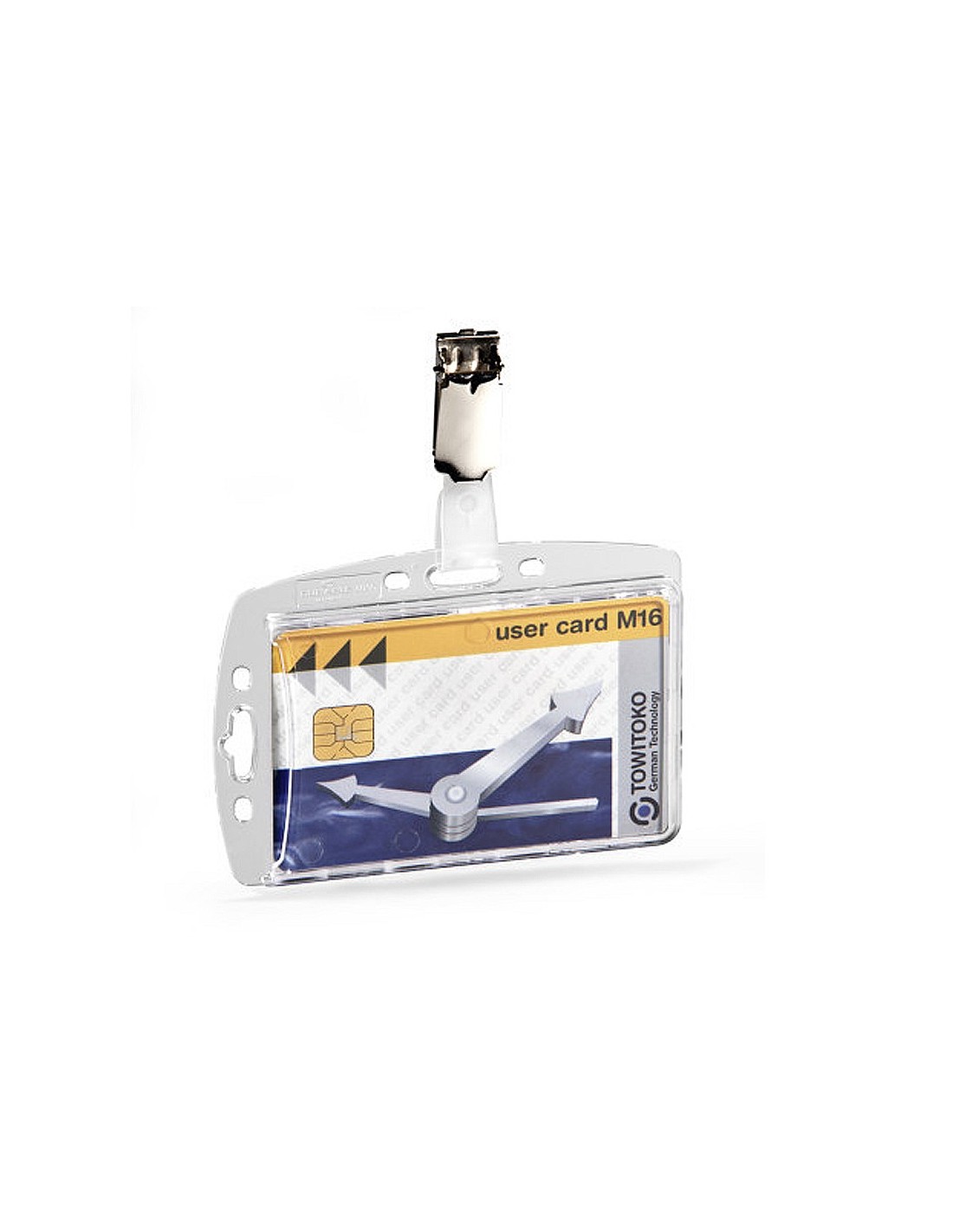 Portanombres acrílico rígido para tarjetas de identificación o pases de seguridad. Con sujeción de pinza giratoria y uñero para extraer fácilmente la tarjeta. Puede combinarse con cadenas, cintas para portanombres y cordones extensibles.Color: transparente. Medidas: 54 x 85 mm.