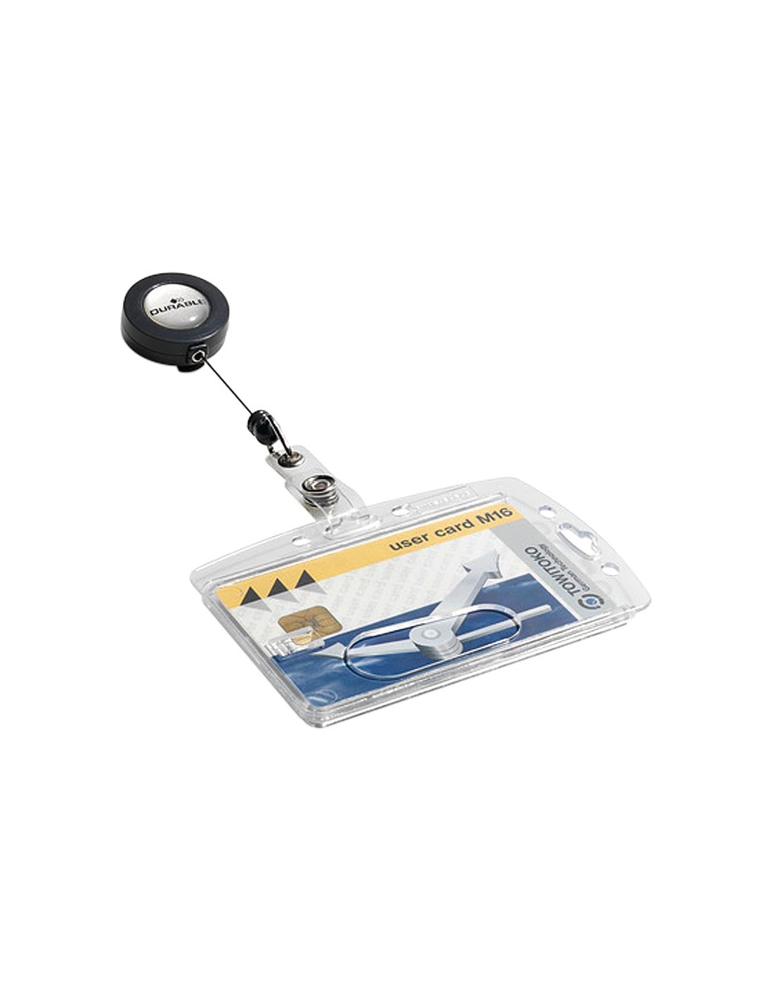 Identificador rígido con cordón extensible. Con uñero para fácil acceso. Identificador combinado con cordón extensible y pinza metálica en la parte posterior. Cierre de botón. Uso vertical y horizontal. Color transparente. Extensible hasta 800 mm. Medidas: 54 x 85 mm.