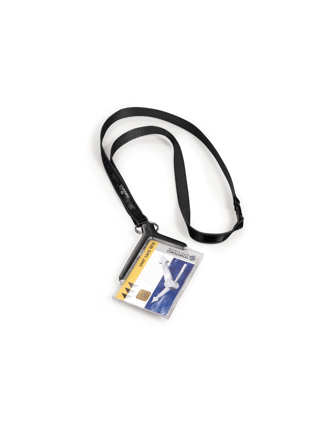 Identificador diagonal en material acrílico con cinta textil. Tarjeta siempre legible. Color antracita. Medidas: 85 x 54 mm.