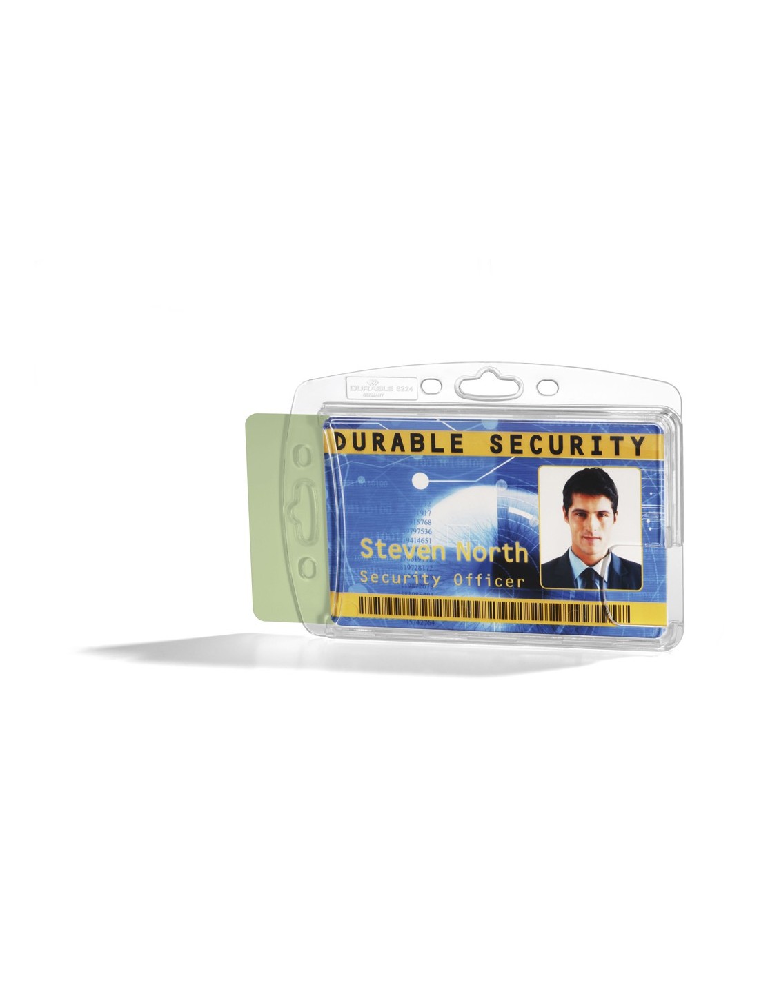Identificador en diseño cerrado para 2 tarjetas de identificación de empresa/acreditaciones de seguridad. Material transparente para óptima legibilidad y fácil escaneado de códigos de barras. Con uñero para fácil extracción de la tarjeta. También se puede combinar con clip, yoyó, cadena o cinta textil. El portatarjetas se puede usar en formato vertical y horizontal. Medidas interiores: 54 x 87 mm.
