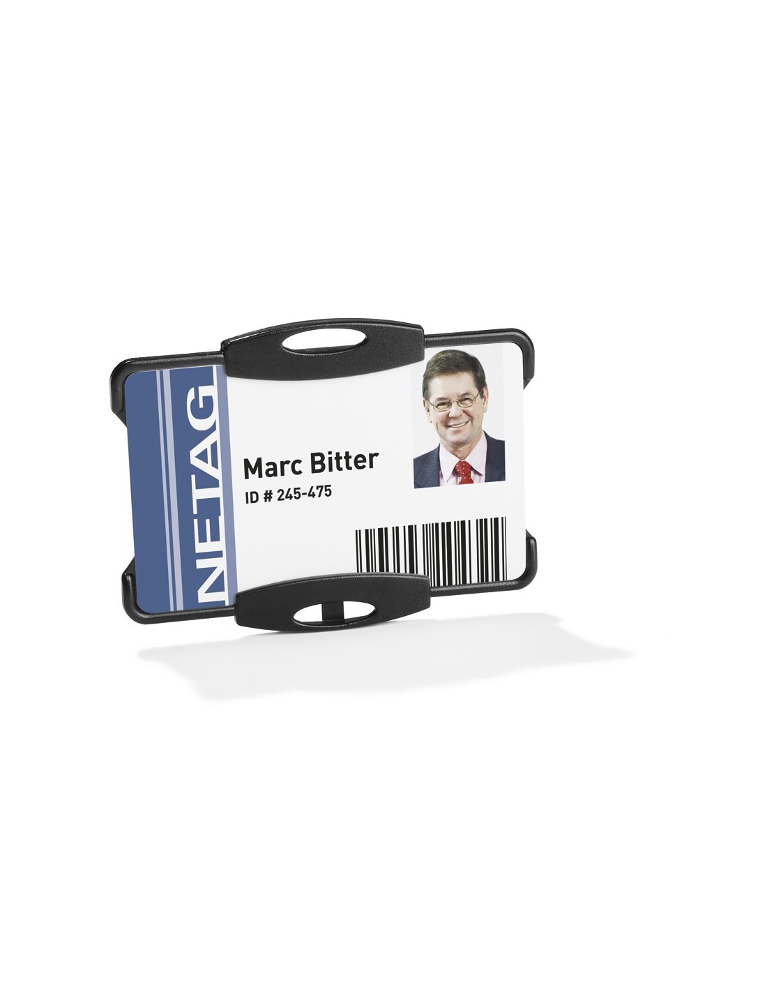 Identificador en diseño abierto para 1 tarjeta de identificación de empresa/acreditación de seguridad. También se puede combinar con clip, yoyó, cadena o cinta textil. El portatarjetas se puede usar en formato vertical y horizontal Medidas interiores: 54 x 87 mm.